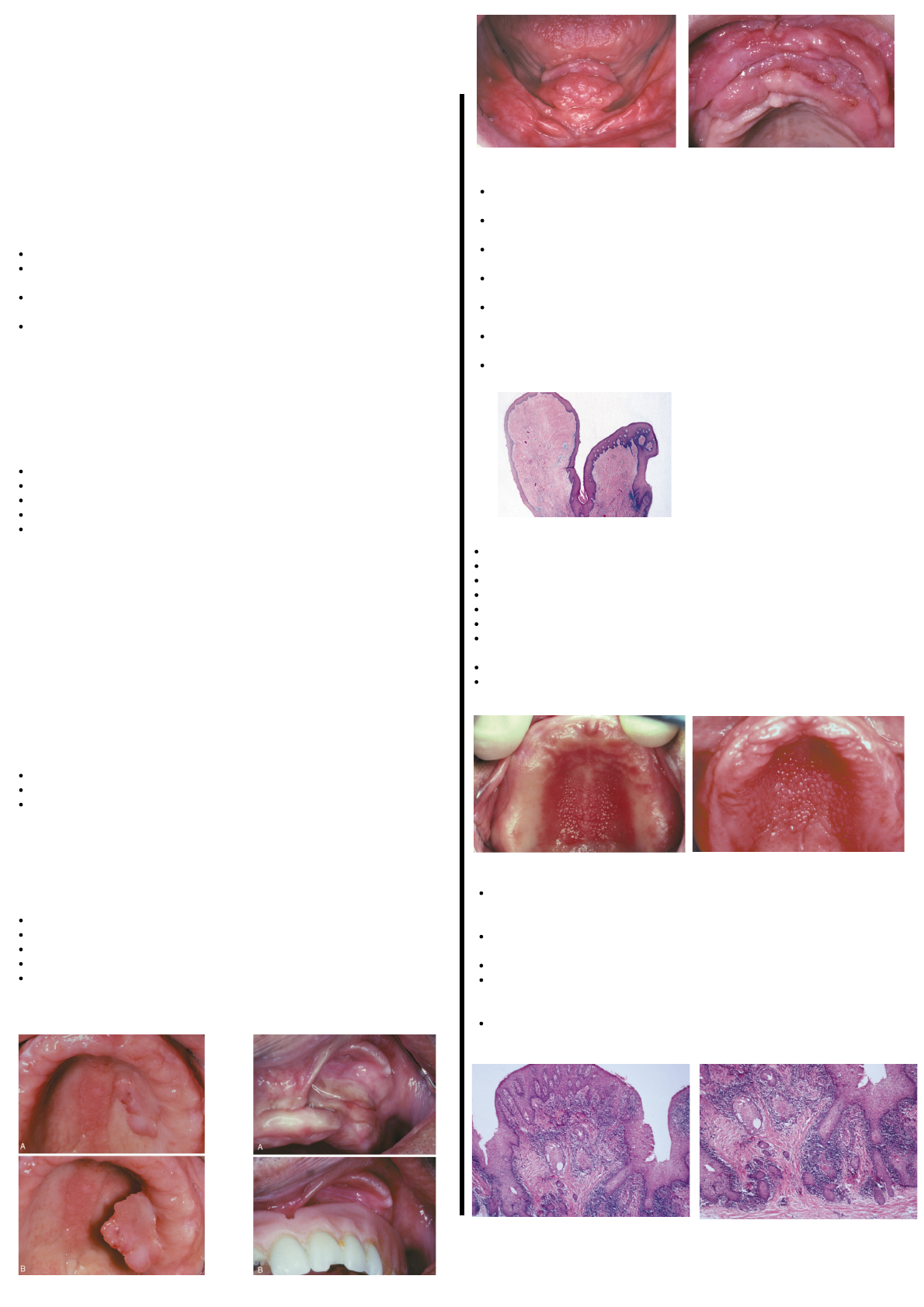 PROCESSOS PROLIFERÁTIVOS NÃO NEOPLASICOS São lesões caracterizadas por crescimento tecidual, por causas inflamatórias e que não apresentam características histológicas de neoplasia Funciona da seguinte forma : Agente agressor - processo inflamatório- produção local de mediadores químicos (citocina e fatores de crescimento) - estimulam a proliferação e diferenciação celular - formação de lesões hiperplasicas reacionais. Principais causas : acúmulo do biofilme e cálculo dentário, hábito de morder a mucosa e traumatismo decorrente de próteses. HIPERPLASIA Fatores fisiológicos - hormonal / compensatória Patológica - excesso de estímulo hormonal ou de fatores de crescimento A capacidade de crescimento da hiperplasia tem limite; As células hiperplasicas não se multiplicam indefinidamente e conservam os mecanismos de controle da divisão celular; A hiperplasia é reversível: se a causa é eliminada, a população celular volta ao nível normal; Hiperplasia é diferente de neoplasia Aumento do número de células de um tecido (benignas): Aumento na proliferação células; 1. São órgãos que contêm células com capacidade replicativa.2. Aumento na síntese de fatores de crescimento e de seus receptores: rotas intracelulares de estímulo para a divisão celular. 3. Neoplasia - malignas TIPOS DE LESÕES PPNN (mais prevalentes são: Hiperplasia fibrosa; Hiperplasia papilar inflamatória; Granuloma piogênico; Lesão periférica de células gigantes; Fibroma ossificante periférico. CARACTERÍSTICAS Bem delimitado ou difuso1. Consistência fibrosa ou flácida2. Superfície lisa ou lobulada3. Séssil ou pediculada4. Coloração similar a da mucosa adjacente ou avermelhada5. O diagnóstico definitivo está condicionado a realização do exame anatomopatológico6. São encontradas lesões nodulares e massas teciduais Hiperplasia Fibrosa Comum na mucosa bucal1. Ampla faixa etária2. Sem preferência de sexo3. Trauma de baixa intensidade de longa duração (Causado por próteses removíveis mal adaptadas ou hábito de morder a mucosa) 4. TRATAMENTO Excisão cirúrgica Biópsia Remoção dos fatores irritativos causais : substituição ou ajuste da prótese - orientação quanto o abandono do hábito de morder a mucosa Obs: MAIS PRESENTE EM ANTERIORES DE MAXILA Geralmente causadas por agentes irritantes locais de baixa intensidade e longa duração: Acúmulo de biofilme e cálculo dentário;1. hábito de morder a mucosa;2. Traumatismo decorrente de prótese.3. MECANISMO Agentes agressores; Processo inflamatório; Produção local de medidores químicos (citocinas e fatores de crescimento); Estimulam ploriferação e diferenciação celular; Formação de lesões hiperplásicas reacionais. Sem associação com a prótese apresentam-se como nódulo Quando associados a prótese: Nódulos bilobulados e pregas de tecido hiperplásico no vestíbulo alveolar. Pólipo Fibroepitelial. Massa tecidual plana originada no palato duro abaixo de uma prótese removível superior; note sua natureza pediculada. Devido às suas bordas denteadas, esta lesão é também conhecida como fibroma por dentadura semelhante a uma folha. Uma hiperplasia papilomatosa inflamatória associada é vista na linha média do palato. Hiperplasia Fibrosa Inflamatória. A, Várias pregas de tecido hiperplásico no vestíbulo maxilar. B, Prótese mal adaptada se ajusta na fissura entre duas das pregas Hiperplasia Fibrosa Inflamatória. Pregas de tecido hiperplásico no vestíbulo maxilar anteriorHiperplasia Fibrosa Inflamatória. Pregas redundantes de tecido originárias do assoalho bucal, associadas a uma prótese mandibular. Hiperplasia papilar inflamatória Assintomática Mucosa eritematosa Superfície “pedregosa” ou papilar Palato duro abaixo da base de uma prótese total frequentemente relacionada: Próteses removíveis mal adaptadas Má higiene de prótese removível Uso da prótese removível 24H TRATAMENTO Remoção da prótese pode permitir remissão (retorno dos tecidos a normalidade) Casos mais avançados - remoção (excisão) do tecido hiperplasico antes de confeccionar uma nova prótese. Hiperplasia Papilomatosa Inflamatória. Aparência pedregosa e eritematosa da abóbada palatina. Hiperplasia Papilomatosa Inflamatória. Um caso avançado exibindo lesões papilares mais pronunciadas no palato duro Características Histopatológicas O exame microscópico da hiperplasia fibrosa inflamatória revela uma hiperplasia do tecido conjuntivo fibroso. Geralmente, múltiplas pregas e sulcos ocorrem no local onde a prótese traumatiza o tecido. O epitélio de revestimento frequentemente é hiperparaqueratinizado e demonstra hiperplasia irregular das cristas epiteliais. Em alguns casos, o epitélio exibe hiperplasia papilomatosa inflamatória (p. 478) ou hiperplasia pseudoepiteliomatosa (pseudocarcinomatosa). Áreas focais de ulceração não são raras, especialmente na base das fissuras entre as pregas. Um infiltrado inflamatório crônico variável está presente. Algumas vezes, podem estar presentes eosinófilos ou ocorrer a formação de folículos linfoides. Se as glândulas salivares menores estiverem incluídas no espécime, usualmente exibirão sialadenite crônica. Hiperplasia Fibrosa Inflamatória. Fotomicrografia em pequeno aumento demonstrando pregas de tecido conjuntivo fibrovascular hiperplásico, revestidas por epitélio pavimentoso estratificado. Características Histopatológicas A mucosa, na hiperplasia papilomatosa inflamatória, exibe numerosos crescimentos papilares na superfície, que são recobertos por epitélio pavimentoso estratificado hiperplásico. Em casos avançados, essa hiperplasia tem aparência pseudoepiteliomatosa, e o patologista não deve confundi-la com um carcinoma epidermoide. O tecido conjuntivo pode variar de frouxo e edematoso a densamente colagenizado. Usualmente, é visto um infiltrado inflamatório crônico, que consiste em linfócitos e plasmócitos. Menos fr