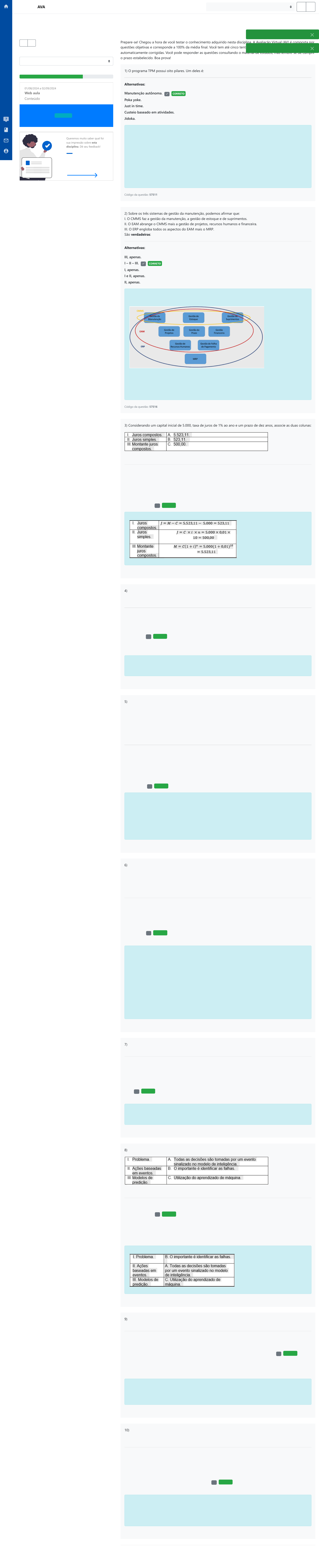 Cosmos • AVA Engenharia de manutenção industrial Gestão de custos em manutenção Professor(a): Yane Ribeiro De Oliveira Lobo (Doutorado) Alterar Disciplina Gestão de custos em manutenção Progresso da Disciplina 67.6% Queremos muito saber qual foi sua impressão sobre esta disciplina. Dê seu feedback! Pesquisa de opinião 01/08/2024 a 02/09/2024 Web aula Conteúdo 1) 2) 3) 4) 5) 6) 7) 8) 9) 10) Prepare-se! Chegou a hora de você testar o conhecimento adquirido nesta disciplina. A Avaliação Virtual (AV) é composta por questões objetivas e corresponde a 100% da média final. Você tem até cinco tentativas para “Enviar” as questões, que são automaticamente corrigidas. Você pode responder as questões consultando o material de estudos, mas lembre-se de cumprir o prazo estabelecido. Boa prova! O programa TPM possui oito pilares. Um deles é: Alternativas: Manutenção autônoma. CORRETO Poka yoke. Just in time. Custeio baseado em atividades. Jidoka. Código da questão: 57511 Sobre os três sistemas de gestão da manutenção, podemos afirmar que: I. O CMMS faz a gestão da manutenção, a gestão de estoque e de suprimentos. II. O EAM abrange o CMMS mais a gestão de projetos, recursos humanos e financeira. III. O ERP engloba todos os aspectos do EAM mais o MRP. São verdadeiras: Alternativas: III, apenas. I – II – III. CORRETO I, apenas. I e II, apenas. II, apenas. Código da questão: 57516 Considerando um capital inicial de 5.000, taxa de juros de 1% ao ano e um prazo de dez anos, associe as duas colunas: Assinale a alternativa que traz a associação correta entre as duas colunas: Alternativas: I – C; II – A; III – B. I – C; II – B; III – A. I – A; II – B; III – C. I – A; II – C; III – B. I – B; II – C; III – A. CORRETO Código da questão: 57501 Uma pessoa fez um empréstimo de R$ 10.000,00 por seis meses. A taxa de juros no mês combinada para este empréstimo é de 10% ao mês e serão utilizados os juros compostos. Calcule o montante e assinale a alternativa correta. Alternativas: R$ 11.000,00. R$ 15.000,00. R$ 17.715,61. CORRETO R$ 16.000,00. R$ 20.000,00. Código da questão: 57498 Sobre os aspectos da manutenção preditiva, podemos afirmar que: I. Disponibilidade é um aspecto importante que a manutenção preditiva melhora, pois permite que o equipamento opere por um maior número de horas. II. Ciclo de vida do equipamento é um aspecto importante para o qual a manutenção preditiva traz melhorias, pois ele é utilizado dentro dos parâmetros técnicos preestabelecidos. III. Custos O&M é um aspecto importante para o qual a manutenção preditiva traz melhorias, pois, trabalhando com mais disponibilidade, o custo aumenta. São verdadeiras: Alternativas: II, apenas. III, apenas. I, apenas. I – II – III. I e II, apenas. CORRETO Código da questão: 57495 Sobre a manutenção, podemos verificar alguns benefícios para operações. Considere as seguintes afirmações: ( ) Traz melhoria na confiabilidade, pois há mais interrupções nos equipamentos. ( ) Traz melhoria de segurança, pois as instalações são mais bem mantidas. ( ) Traz melhoria de qualidade, pois há menos falhas nos equipamentos. ( ) Traz um aumento do custo de operação. Assinale a alternativa que contenha a sequência correta: Alternativas: F – F – F – F. V – V – V – V. V – V – F – V. F – V – V – F. CORRETO F – V – F – V. Código da questão: 57507 Uma empresa que possui disponibilidade de 90%, performance de 80% e qualidade de 93%: qual o OEE dessa empresa? Alternativas: 120%. 263%. 80%. 67%. CORRETO 50%. Código da questão: 57510 Leia e associe as duas colunas: Assinale a alternativa que traz a associação correta entre as duas colunas: Alternativas: I – B; II – A; III – C. CORRETO I – A; II – B; III – C. I – B; II – C; III – A. I – C; II – B; III – A. I – C; II – A; III – B. Código da questão: 57494 Assinale a alternativa que completa adequadamente da frase a seguir: A conjuntura econômica pós-pandemia deve ser baseada em: Alternativas: Maior igualdade social dos países. Crescimento das empresas de tecnologias e no maior destaque da sustentabilidade ambiental. CORRETO Crescimento econômico da China, apenas. Crescimento da demanda por produtos automotivos. Aumento do valor das commodities. Código da questão: 57497 O CMMS – Computerized Maintenance Management System – sistema de gestão computadorizado da manutenção tem alguns objetivos. Sobre o sistema CMMS, assinale a alternativa correta. Alternativas: Tem como objetivo a redução do tempo de ciclo. Tem como objetivo diminuir o investimento. Um dos objetivos é a menor utilização de sistemas digitais. Um dos objetivos é tornar a manutenção mais digital. CORRETO O maior objetivo é ter sistemas mais simples. Código da questão: 57512 Resolução comentada: os oito pilares da TPM são: • Saúde e segurança. • Educação e formação. • Manutenção autônoma. • Manutenção programada. • Manutenção da qualidade. • Melhorias específicas. • Sistema de suporte. • Gestão da fase inicial. Resolução comentada: Figura 1 - Abrangência dos sistemas de manutenção Fonte: elaborada pelo autor. Esta imagem mostra os aspectos que são englobados no CMMS (gestão da manutenção, gestão de estoque e gestão de suprimentos), EAM (os mesmos mais gestão de projeto, gestão do prazo, gestão financeira, gestão de recursos humanos e gestão da folha de pagamento) e o ERP, que engloba todos os aspectos do EAM mais o MRP. Resolução comentada: Resolução comentada: M=C (1+i)^n=10.000 (1+0,10)^6=17.715,61 Resolução comentada: I. Disponibilidade é um aspecto importante que a manutenção preditiva melhora, pois permite que o equipamento opere por um maior número de horas. VERDADEIRA. II. Ciclo de vida do equipamento é um aspecto importante que a manutenção preditiva melhora, pois ele é utilizado dentro do