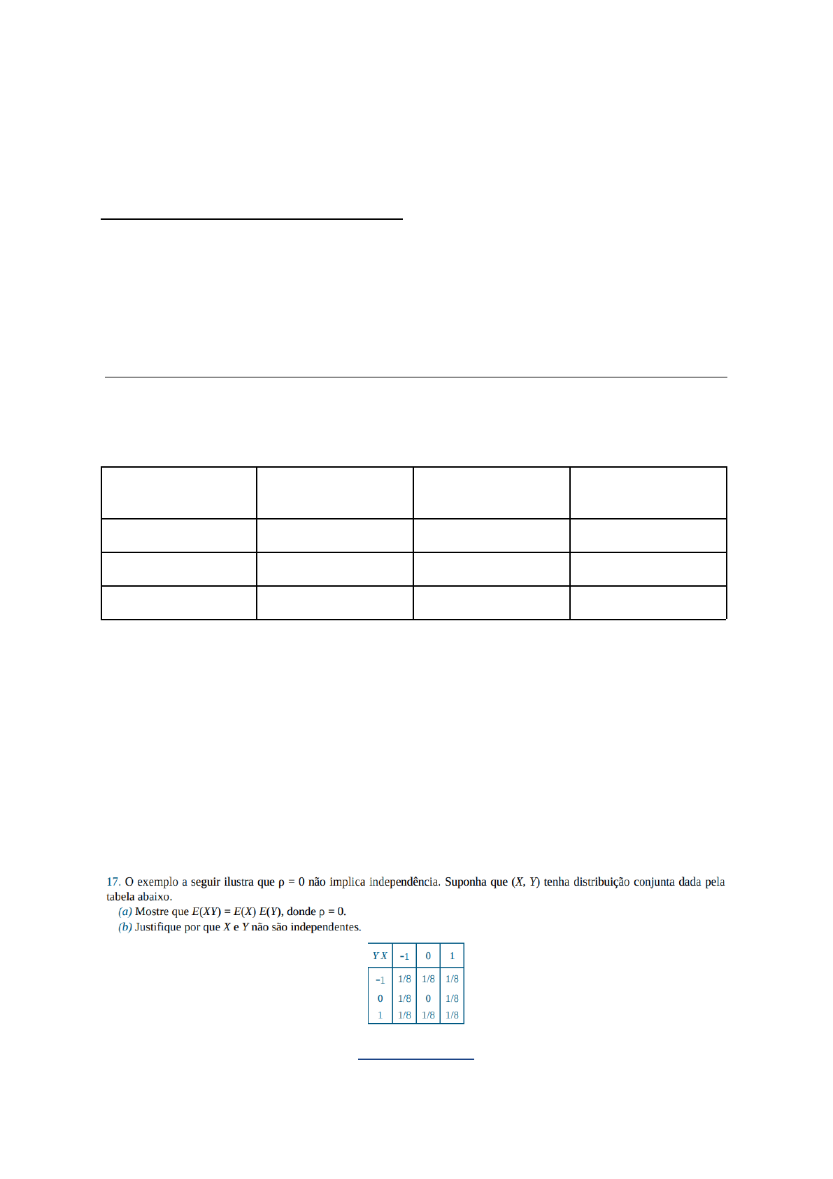UFMG - ICEX - ESTATÍSTICA ECONÔMICA II - LISTA DE EXERCÍCIOS A Lista de Exercícios para a 1ª prova está dividida em: - uma parte individual que deve ser acessada através de: https://pt.khanacademy.org/join/RC9GDQ2D - uma parte em grupo de até 3 (três) alunos. Esta parte será completada gradativamente à medida que o conteúdo programático for dado. Os exercícios devem ser feitos à mão e à lápis. Não é necessário copiar os enunciados. Tanto a parte da Khan Academy, quanto à parte manuscrita, tem como data limite o dia da 1ª prova, 21/09/2023. 1ª Parte da Lista - Variáveis aleatórias multidimensionais 1. QUESTÃO 05 (ANPEC 2022) - Considere a distribuição conjunta de X e Y X Y 1 2 3 1 0,10 0,15 0,20 2 0,15 0,10 0 3 0,20 0 0,10 Julgue cada afirmativa abaixo como V (Verdadeira) ou F (Falsa), após fazer as contas e/ou justificar dependendo da afirmativa: Ⓞ A média de X é igual a 2. ① A variância de Y é igual a 0,7275. ②A variância de X é igual à variância de Y. ③ X e Y são negativamente correlacionadas. ④X e Y são variáveis aleatórias independentes. 2. Morettin & Bussab, capítulo 8, Ex. 17 (9ª ed. página 233, 6ª ed. página 219, 5ª ed. página 216) (pág. 191 do pdf) 3. Morettin & Bussab, capítulo 8, Ex. 31 (9ª ed. página 245, 6ª ed. página 231, 5ª ed. página 228), acrescentando o item: g) Se o homem é descontado em 8% e a mulher em 6%, qual é o salário liquido anual médio familiar? E a variância? (pág 200 do pdf) 4. Morettin & Bussab, capítulo 8, Ex. 35 (9ª ed. página 247, 6ª ed. página 233, 5* ed. página 229) (pág 201 do pdf) 5. Morettin & Bussab, capítulo 8, Ex. 37 (9ª ed. página 247, 6ª ed. página 233, 5ª ed. página 229) (pág 201 do pdf) 3ª Parte da 1ª Lista de Exercícios - Estimadores de Máxima Verossimilhança 1. Morettin & Bussab- capítulo 11 - Ex. 11 (9. ed. pág. 322, 6. ed. pág. 310, 5. ed. pág. 303). (pág 261 do pdf) 2. Morettin & Bussab - capítulo 11 - Ex. 13 (9. ed. pág. 323, 6. ed. pág. 311, 5. ed. pág. 303). (pág 262 do pdf) 4ª Parte da 1ª Lista de Exercícios - Combinação linear de variáveis aleatórias Normais independentes 1. Morettin & Bussab - capítulo 10 - Ex. 21 (9. ed. pág. 302, 6. ed. pág. 290, 5. ed. pág. 283). (pág 245 do pdf) 2. O peso bruto de latas de conserva é uma variável aleatória Normal com média 1 000 gramas e desvio padrão 20 gramas. As latas têm peso médio de 100 gramas e desvio padrão de 10 gramas, também com distribuição Normal de peso. Suponha que as variáveis peso bruto e peso das latas são variáveis independentes. Qual é a probabilidade de uma lata conter: a) Menos de 850 gramas de peso líquido? b) Mais de 920 gramas de peso líquido?