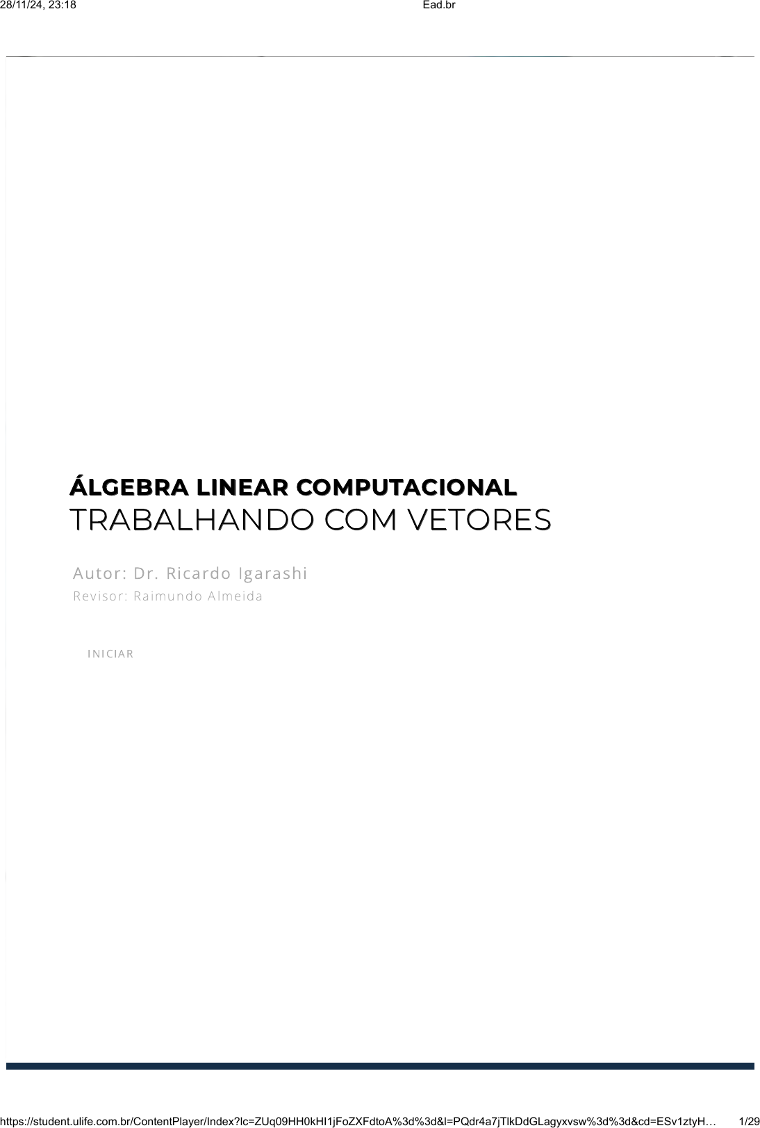 ÁLGEBRA LINEAR COMPUTACIONALÁLGEBRA LINEAR COMPUTACIONAL TRABALHANDO COM VETORESTRABALHANDO COM VETORES Autor: Dr. Ricardo Igarashi Revisor : Ra imundo A lmeida IN IC IAR 28/11/24, 23:18 Ead.br https://student.ulife.com.br/ContentPlayer/Index?lc=ZUq09HH0kHI1jFoZXFdtoA%3d%3d&l=PQdr4a7jTlkDdGLagyxvsw%3d%3d&cd=ESv1ztyH… 1/29 introdução Introdução Este texto destina-se aos estudantes da disciplina de Álgebra Linear Computacional, presente nos primeiros semestres dos cursos de graduação da área de Ciências Exatas. Por isso, faremos uma explanação clara e objetiva, utilizando uma linguagem e notação matemática para um entendimento que poderá ser usado em outras disciplinas. Por exemplo, em análises de estruturas o estudante deve utilizar corretamente o conceito de análise vetorial colocando os vetores corretamente na estrutura. Esse domínio será muito importante, pois com isso você poderá usar um software para fazer a análise computacional da estrutura. 28/11/24, 23:18 Ead.br https://student.ulife.com.br/ContentPlayer/Index?lc=ZUq09HH0kHI1jFoZXFdtoA%3d%3d&l=PQdr4a7jTlkDdGLagyxvsw%3d%3d&cd=ESv1ztyH… 2/29 Neste primeiro momento, estudaremos as representações dos vetores em um espaço de até 3 dimensões (tridimensional). Além disso, veremos duas representações para os vetores, a geométrica e a algébrica. Aprenderemos, também, a realizar operações básicas entre vetores e multiplicação por escalar, o processo de normalização e veri�cação de igualdade entre vetores. Tratamento Geométrico Vetor é um segmento de reta orientado que apresenta módulo (tamanho), direção e sentido. Os vetores são usados para expressar grandezas físicas vetoriais, isto é, aquelas que são de�nidas pelo seu valor numérico, sua direção (horizontal e vertical), e também pelo seu sentido (para cima ou para baixo). A representação grá�ca de um vetor é dada por uma seta, e possui em suas extremidades dois pontos que o determinam (WINTERLE, 2000). Intuitivamente, seta é um segmento no qual se �xou uma orientação. E �xar uma orientação é escolher um sentido. No caso da Figura 1.1, o segmento orientado representado tem orientação de A para B. VetoresVetores Figura 1.1 - Segmento orientado AB Fonte: Elaborada pelo autor. 28/11/24, 23:18 Ead.br https://student.ulife.com.br/ContentPlayer/Index?lc=ZUq09HH0kHI1jFoZXFdtoA%3d%3d&l=PQdr4a7jTlkDdGLagyxvsw%3d%3d&cd=ESv1ztyH… 3/29 As notações matemáticas para um vetor podem ser as mais diversas, dependendo do autor, as mais usuais são , os dois pontos que deram origem ao vetor seguido de uma �echa sobre eles , uma letra minúscula seguida de uma �echa , uma letra minúscula em negrito . Para �ns de padronização, utilizaremos como representação de um vetor. Figura 1.2 - Segmento orientado AB foi rotulado como vetor Fonte: Elaborada pelo autor. O módulo de um vetor é o comprimento dele, por exemplo, na �gura 1.3 a seguir temos um vetor com origem em (1,2) e �nal em (4,2). O módulo será a distância do ponto de origem até o ponto de destino. Veri�camos pela �gura 1.3 que o comprimento do vetor é 3. A direção é o sentido que representamos quando desenhamos o vetor em um plano cartesiano. Observamos pela �gura 1.3 que o vetor possui direção horizontal e sentido da esquerda para direita. AB AB −→− v ⃗ v v v v v 28/11/24, 23:18 Ead.br https://student.ulife.com.br/ContentPlayer/Index?lc=ZUq09HH0kHI1jFoZXFdtoA%3d%3d&l=PQdr4a7jTlkDdGLagyxvsw%3d%3d&cd=ESv1ztyH… 4/29 O vetor que possui sua origem coincidindo com a sua extremidade é chamado vetor nulo denotado por 0 . Note que o vetor nulo é apenas um ponto no espaço. Exemplo 1: Dados dois vetores AB e CD , dizemos que AB é equivalente a CD se B-A=D-C. Para veri�carmos essa situação considere os seguintes pontos no plano: a) Então, AD é equivalente a CB , pois b) c) Contudo, podemos veri�car que o vetor FE , não é equivalente a AD e CB . Os vetores AD , CB e FE são representados na �gura 1.4. Figura 1.3 - Vetor v com origem em (1,2) e �nal (4,2). O módulo do vetor é de 3 unidades com direção horizontal para direita. Fonte: Elaborada pelo autor. A = (0, 0) , B = (2, 3) , C = (1, 2) , D = (1, 1) , E = (1, 0) , F = (−1, −1) . D − A = (1, 1) − (0, 0) = (1, 1) B − C = (2, 3) − (1, 2) = (1, 1) . E − F = (1, 0) − (−1, −1) = (2, 1) , 28/11/24, 23:18 Ead.br https://student.ulife.com.br/ContentPlayer/Index?lc=ZUq09HH0kHI1jFoZXFdtoA%3d%3d&l=PQdr4a7jTlkDdGLagyxvsw%3d%3d&cd=ESv1ztyH… 5/29 Observação: A equivalência de vetores é análoga ao que ocorre com os números racionais e as frações. Duas frações representam o mesmo número racional se o numerador e o denominador de cada uma delas estiverem na mesma proporção. Por exemplo, ½ é equivalente a 2/4 e 3/6, e representam o mesmo número racional. Operações com Vetores Nesta seção iremos apresentar as seguintes operações vetoriais: Adição de vetores e produto de um escalar por um vetor. Adição de Vetores Consideremos os vetores e , cuja soma pretendemos encontrar. Para isso, tomemos um ponto A qualquer e, com origem nele, tracemos o segmento orientado AB representante do vetor . A partir de A, tracemos o segmento orientado AC representante de . O vetor representado pelo segmento orientado de origem A e extremidade D é, por de�nição, o vetor soma de por . Essa regra é conhecida como regra do Paralelogramo. Figura 1.4 - Representação no plano dos vetores AD, CB e EF Fonte: Elaborada pelo autor. u v u + v u v u v 28/11/24, 23:18 Ead.br https://student.ulife.com.br/ContentPlayer/Index?lc=ZUq09HH0kHI1jFoZXFdtoA%3d%3d&l=PQdr4a7jTlkDdGLagyxvsw%3d%3d&cd=ESv1ztyH… 6/29 Observe que a soma está na diagonal do paralelogramo determinado por e , quando estão representados com a mesma origem. Sendo e vetores quaisquer, a adição admite as seguintes propriedades: i) Comutativa: ii) Associativa: iii) Elemento neutro: iv) Elemento op
