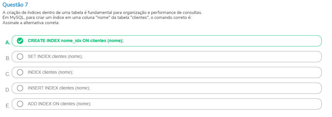 Questão 7 A criação de índices dentro de uma tabela é fundamental para organização e performance de Em para criar um índice em uma coluna "nome" da tabela comando correto é: Assinale a alternativa correta: A. CREATE INDEX nome_idx ON clientes B. SET INDEX clientes C. INDEX clientes (nome); D. INSERT INDEX clientes E. ADD INDEX ON clientes