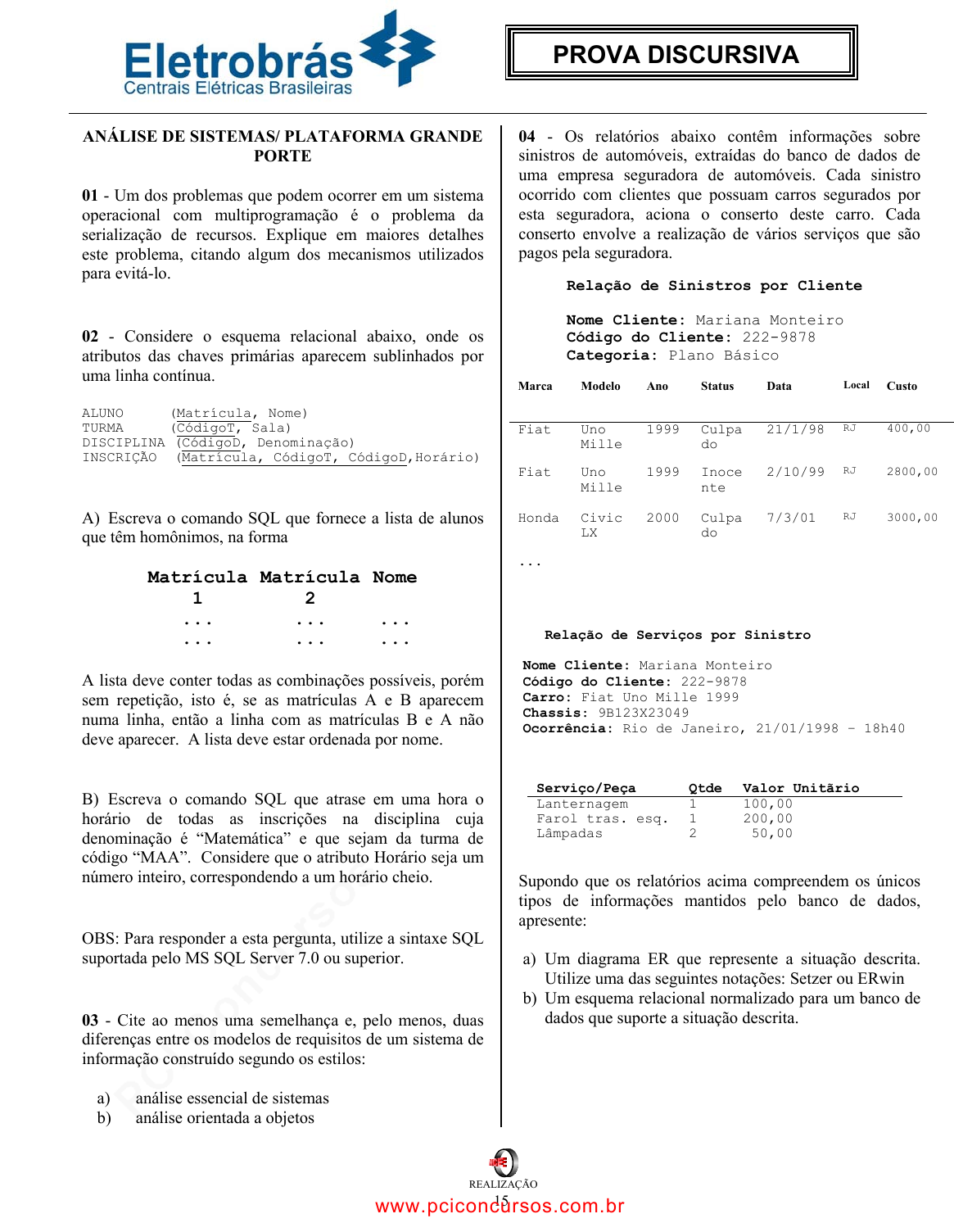 pcimarkpci MDAwMDowMDAwOjAwMDA6MDAwMDowMDAwOmZmZmY6ZDEwZTo0NDc4:RnJpLCAyOSBOb3YgMjAyNCAwMzo1NTowMiAtMDMwMA== www.pciconcursos.com.br 15 REALIZAÇÃO PROVA DISCURSIVA ANÁLISE DE SISTEMAS/ PLATAFORMA GRANDE PORTE 01 - Um dos problemas que podem ocorrer em um sistema operacional com multiprogramação é o problema da serialização de recursos. Explique em maiores detalhes este problema, citando algum dos mecanismos utilizados para evitá-lo. 02 - Considere o esquema relacional abaixo, onde os atributos das chaves primárias aparecem sublinhados por uma linha contínua. ALUNO (Matrícula, Nome) TURMA (CódigoT, Sala) DISCIPLINA (CódigoD, Denominação) INSCRIÇÃO (Matrícula, CódigoT, CódigoD,Horário) A) Escreva o comando SQL que fornece a lista de alunos que têm homônimos, na forma Matrícula 1 Matrícula 2 Nome ... ... ... ... ... ... A lista deve conter todas as combinações possíveis, porém sem repetição, isto é, se as matrículas A e B aparecem numa linha, então a linha com as matrículas B e A não deve aparecer. A lista deve estar ordenada por nome. B) Escreva o comando SQL que atrase em uma hora o horário de todas as inscrições na disciplina cuja denominação é “Matemática” e que sejam da turma de código “MAA”. Considere que o atributo Horário seja um número inteiro, correspondendo a um horário cheio. OBS: Para responder a esta pergunta, utilize a sintaxe SQL suportada pelo MS SQL Server 7.0 ou superior. 03 - Cite ao menos uma semelhança e, pelo menos, duas diferenças entre os modelos de requisitos de um sistema de informação construído segundo os estilos: a) análise essencial de sistemas b) análise orientada a objetos 04 - Os relatórios abaixo contêm informações sobre sinistros de automóveis, extraídas do banco de dados de uma empresa seguradora de automóveis. Cada sinistro ocorrido com clientes que possuam carros segurados por esta seguradora, aciona o conserto deste carro. Cada conserto envolve a realização de vários serviços que são pagos pela seguradora. Relação de Sinistros por Cliente Nome Cliente: Mariana Monteiro Código do Cliente: 222-9878 Categoria: Plano Básico Relação de Serviços por Sinistro Nome Cliente: Mariana Monteiro Código do Cliente: 222-9878 Carro: Fiat Uno Mille 1999 Chassis: 9B123X23049 Ocorrência: Rio de Janeiro, 21/01/1998 – 18h40 Supondo que os relatórios acima compreendem os únicos tipos de informações mantidos pelo banco de dados, apresente: a) Um diagrama ER que represente a situação descrita. Utilize uma das seguintes notações: Setzer ou ERwin b) Um esquema relacional normalizado para um banco de dados que suporte a situação descrita. Marca Modelo Ano Status Data Local Custo Fiat Uno Mille 1999 Culpa do 21/1/98 RJ 400,00 Fiat Uno Mille 1999 Inoce nte 2/10/99 RJ 2800,00 Honda Civic LX 2000 Culpa do 7/3/01 RJ 3000,00 ... Serviço/Peça Qtde Valor Unitãrio Lanternagem 1 100,00 Farol tras. esq. 1 200,00 Lâmpadas 2 50,00 www.pciconcursos.com.br