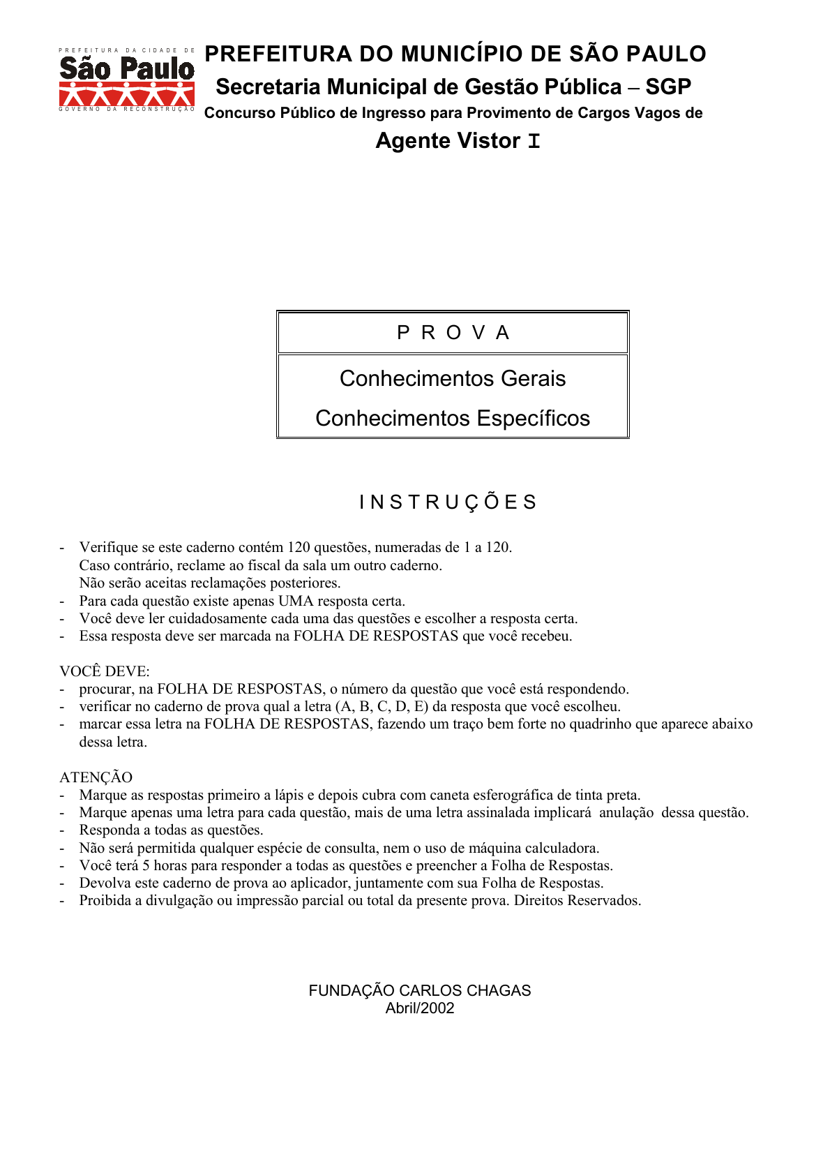 pcimarkpci MDAwMDowMDAwOjAwMDA6MDAwMDowMDAwOmZmZmY6ZDEwZTo0NDc4:RnJpLCAyOSBOb3YgMjAyNCAwMzo1Mzo0NyAtMDMwMA== www.pciconcursos.com.br PREFEITURA DO MUNICÍPIO DE SÃO PAULO Secretaria Municipal de Gestão Pública � SGP Concurso Público de Ingresso para Provimento de Cargos Vagos de Agente Vistor I P R O V A Conhecimentos Gerais Conhecimentos Específicos I N S T R U Ç Õ E S - Verifique se este caderno contém 120 questões, numeradas de 1 a 120. Caso contrário, reclame ao fiscal da sala um outro caderno. Não serão aceitas reclamações posteriores. - Para cada questão existe apenas UMA resposta certa. - Você deve ler cuidadosamente cada uma das questões e escolher a resposta certa. - Essa resposta deve ser marcada na FOLHA DE RESPOSTAS que você recebeu. VOCÊ DEVE: - procurar, na FOLHA DE RESPOSTAS, o número da questão que você está respondendo. - verificar no caderno de prova qual a letra (A, B, C, D, E) da resposta que você escolheu. - marcar essa letra na FOLHA DE RESPOSTAS, fazendo um traço bem forte no quadrinho que aparece abaixo dessa letra. ATENÇÃO - Marque as respostas primeiro a lápis e depois cubra com caneta esferográfica de tinta preta. - Marque apenas uma letra para cada questão, mais de uma letra assinalada implicará anulação dessa questão. - Responda a todas as questões. - Não será permitida qualquer espécie de consulta, nem o uso de máquina calculadora. - Você terá 5 horas para responder a todas as questões e preencher a Folha de Respostas. - Devolva este caderno de prova ao aplicador, juntamente com sua Folha de Respostas. - Proibida a divulgação ou impressão parcial ou total da presente prova. Direitos Reservados. FUNDAÇÃO CARLOS CHAGAS Abril/2002 P R E F E I T U R A D A C I D A D E D E G O V E R N O D A R E C O N S T R U Ç Ã O pcimarkpci MDAwMDowMDAwOjAwMDA6MDAwMDowMDAwOmZmZmY6ZDEwZTo0NDc4:RnJpLCAyOSBOb3YgMjAyNCAwMzo1Mzo0NyAtMDMwMA== www.pciconcursos.com.br 08/04/02 - 14:43 2 PMSP-Ag. Vistor CONHECIMENTOS GERAIS PORTUGUÊS Atenção: As questões de números 1 a 10 referem-se ao texto que segue. Cidadania e igualdade Mais do que em outras épocas da nossa história, o momento em que ingressamos num novo século exige a construção da cidadania e a implementação dos direitos humanos como tarefa de urgência. Realizá-la implica uma série de atitudes que envolvem, antes de mais nada, o indivíduo, o seu grupo, a comunidade e os diversos segmentos da sociedade. Impõe-se a cada pessoa o desafio de acreditar – ou voltar a acreditar, se perdeu tal crença – na possibilidade de uma sociedade justa e solidária, exercitando uma nova consciência crítica, conhecendo a realidade em suas várias nuances e mudando o que precisa ser mudado para uma vida melhor. Ter consciência crítica significa também saber analisar, com realismo, as causas e os efeitos das situações que precisam ser enfrentadas, para, a partir dessa atitude, descobrir os melhores caminhos na busca da transformação social, política, econômica e cultural. Significa, do mesmo modo, abrir-se para as mudanças e capacitar-se, de todas as formas, para absorvê-las. Há hoje cada vez mais espaços para ações de parceria voltadas ao desenvolvimento sustentado e à realização dos direitos humanos. O desafio apresenta-se de duas formas. De um lado, é preciso abrir-se para além dos círculos fechados em que as pessoas normalmente vivem, estimulando o respeito e a cooperação por uma sociedade com menores desigualdades, e de outro, para exercer o direito de cobrar das instituições do Estado a sua responsabilidade na preservação dos direitos humanos. O desafio essencial de cada um de nós é e sempre será fazer respeitar a nossa condição de ser humano vocacionado a uma vida digna e solidária. O princípio de igualdade é a base da cidadania e fundamenta qualquer constituição democrática que se proponha a valorizar o cidadão. Não é diferente com a nossa. Na Constituição de 1988, o direito à igualdade destaca-se como tema prioritário logo em seu artigo 5o: “Todos são iguais perante a lei, sem distinção de qualquer natureza, garantindo-se aos brasileiros e aos estrangeiros residentes no país a inviolabilidade do direito à vida, à liberdade, à igualdade, à segurança e à propriedade (...)” (Guia Cidadania e Comunidade) 1. A realização da “tarefa de urgência”, de que trata o primeiro parágrafo do texto, exige (A) iniciativas enérgicas por parte do poder estatal. (B) a defesa do convívio em círculos sociais restritos. (C) uma nova reforma constitucional. (D) uma alteração no fundamento da Constituição de 1988. (E)) novas atitudes dos indivíduos e dos grupos sociais. _________________________________________________________ 2. Considere as seguintes afirmações: I. As "duas formas" de desafio de que trata o 3o parágrafo acentuam a importância do papel da iniciativa do Estado. II. A frase Não é diferente com a nossa, no penúltimo parágrafo, lembra que o princípio da igualdade é básico também na Constituição brasileira. III. O direito à igualdade, tratado no artigo 5o da Constituição de 1988, é amplo em relação aos cidadãos brasileiros e restrito em relação a todos os demais. Em relação ao texto, está correto o que se afirma em (A) I, somente. (B)) II, somente. (C) I e II, somente. (D) II e III, somente. (E) I, II e III. _________________________________________________________ 3. O texto manifesta a necessidade premente de se evitar (A) uma análise realista das causas e efeitos das situações que precisam ser enfrentadas. (B) a prática de cobrar de setores do Governo suas responsabilidades constitucionais. (C)) a tendência de se viver no interior de círculos sociais fechados e estanques. (D) a discriminação social, a não ser nos casos previstos no artigo citado da atual Constituição. (E) qualquer desafio que diga respeito a mudança de atitude ou de hábitos tradicionais. ______________