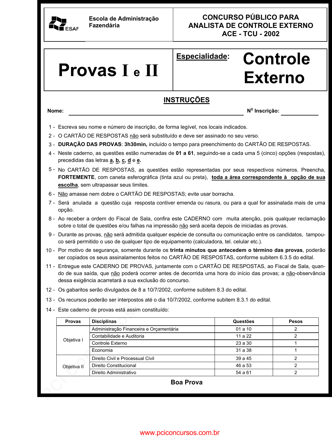 pcimarkpci MDAwMDowMDAwOjAwMDA6MDAwMDowMDAwOmZmZmY6ZDEwZTo0NDc4:RnJpLCAyOSBOb3YgMjAyNCAwMzo1ODoyNCAtMDMwMA== www.pciconcursos.com.br Escola de Administração Fazendária CONCURSO PÚBLICO PARA ANALISTA DE CONTROLE EXTERNO ACE - TCU - 2002 Provas I e II Especialidade: Controle Externo INSTRUÇÕES Nome: No Inscrição: 1 - Escreva seu nome e número de inscrição, de forma legível, nos locais indicados. 2 - O CARTÃO DE RESPOSTAS não será substituído e deve ser assinado no seu verso. 3 - DURAÇÃO DAS PROVAS: 3h30min, incluído o tempo para preenchimento do CARTÃO DE RESPOSTAS. 4 - Neste caderno, as questões estão numeradas de 01 a 61, seguindo-se a cada uma 5 (cinco) opções (respostas), precedidas das letras a, b, c, d e e. 5 - No CARTÃO DE RESPOSTAS, as questões estão representadas por seus respectivos números. Preencha, FORTEMENTE, com caneta esferográfica (tinta azul ou preta), toda a área correspondente à opção de sua escolha, sem ultrapassar seus limites. 6 - Não amasse nem dobre o CARTÃO DE RESPOSTAS; evite usar borracha. 7 - Será anulada a questão cuja resposta contiver emenda ou rasura, ou para a qual for assinalada mais de uma opção. 8 - Ao receber a ordem do Fiscal de Sala, confira este CADERNO com muita atenção, pois qualquer reclamação sobre o total de questões e/ou falhas na impressão não será aceita depois de iniciadas as provas. 9 - Durante as provas, não será admitida qualquer espécie de consulta ou comunicação entre os candidatos, tampou- co será permitido o uso de qualquer tipo de equipamento (calculadora, tel. celular etc.). 10 - Por motivo de segurança, somente durante os trinta minutos que antecedem o término das provas, poderão ser copiados os seus assinalamentos feitos no CARTÃO DE RESPOSTAS, conforme subitem 6.3.5 do edital. 11 - Entregue este CADERNO DE PROVAS, juntamente com o CARTÃO DE RESPOSTAS, ao Fiscal de Sala, quan- do de sua saída, que não poderá ocorrer antes de decorrida uma hora do início das provas; a não-observância dessa exigência acarretará a sua exclusão do concurso. 12 - Os gabaritos serão divulgados de 8 a 10/7/2002, conforme subitem 8.3 do edital. 13 - Os recursos poderão ser interpostos até o dia 10/7/2002, conforme subitem 8.3.1 do edital. 14 - Este caderno de provas está assim constituído: Provas Disciplinas Questões Pesos Administração Financeira e Orçamentária 01 a 10 2 Contabilidade e Auditoria 11 a 22 2 Objetiva I Controle Externo 23 a 30 1 Economia 31 a 38 1 Direito Civil e Processual Civil 39 a 45 2 Direito Constitucional 46 a 53 2Objetiva II Direito Administrativo 54 a 61 2 Boa Prova www.pciconcursos.com.br pcimarkpci MDAwMDowMDAwOjAwMDA6MDAwMDowMDAwOmZmZmY6ZDEwZTo0NDc4:RnJpLCAyOSBOb3YgMjAyNCAwMzo1ODoyNCAtMDMwMA== www.pciconcursos.com.br Analista de Controle Externo - ACE - TCU - 2002 CONTROLE EXTERNO - Provas I e II2 ADMINISTRAÇÃO FINANCEIRA E ORÇAMENTÁRIA 01- A ação planejada do Estado materializa-se atra- vés do orçamento público. Indique o princípio or- çamentário que consiste na não-inserção de ma- téria estranha à previsão da receita e à fixação da despesa. a) princípio da discriminação b) princípio da exclusividade c) princípio do orçamento bruto d) princípio da universalidade e) princípio do equilíbrio 02- O Estado brasileiro interveio de diversas formas a fim de contribuir para o aumento do investimento na economia. Identifique de que maneira não se deu adequadamente essa intervenção. a) Concedendo subsídios ao setor privado. b) Controlando os preços, a produção e o co- mércio exterior. c) Financiando os esforços de investimento privado em setores estratégicos. d) Investindo diretamente em setores de infra- estrutura e utilidade pública. e) Funcionando como importante fonte de de- manda para o setor privado. 03- O Ciclo Orçamentário é a seqüência das etapas desenvolvidas pelo processo orçamentário. Assi- nale a única opção correta no tocante à etapa de elaboração do orçamento. a) É fase de competência do Poder Legislativo. b) Constitui a concretização anual dos objetivos e metas determinados para o setor público, no processo de planejamento integrado. c) Compreende a fixação de objetivos concretos para o período considerado, bem como o cálculo dos recursos humanos, materiais e financeiros, necessários à sua materialização e concretização. d) Configura-se na necessidade de que o povo, através de seus representantes, intervenha na decisão de suas próprias aspirações, bem como na maneira de alcançá-las. e) É a etapa que impõe a necessidade de um sistema estatístico cuja informação básica se obtém em cada uma das repartições ou ór- gãos. 04- No orçamento público, os recursos correspondem à receita prevista (estimada ou orçada), classifi- cada segundo categorias econômicas. No que diz respeito às receitas de capital, identifique a opção falsa. a) Receitas por mutação patrimonial. b) Receitas provenientes da realização de re- cursos financeiros oriundos de constituição de dívidas. c) Receitas da conversão, em espécie, de bens e direitos. d) Receitas de amortização de empréstimos anteriormente concedidos. e) Receitas imobiliárias. 05- A classificação da despesa por categoria econô- mica é inspirada no esquema estabelecido pela Contabilidade Nacional. Assinale o objetivo da classificação por categoria econômica. a) Dimensionar a participação do dispêndio governamental nos principais agregados da análise macroeconômica. b) Identificar os principais programas que refle- tem as prioridades explicitamente estabeleci- das pelo governo. c) Demonstrar a distribuição funcional da despe- sa. d) Classificar os gastos em funções, programas e sub-programas. e) Medir a participação do governo federal no PIB (Produto Interno Bruto). 06- Com relação aos créditos adicionais, aponte a única opção correta pertinente aos créditos extra- ordinários. a) São 