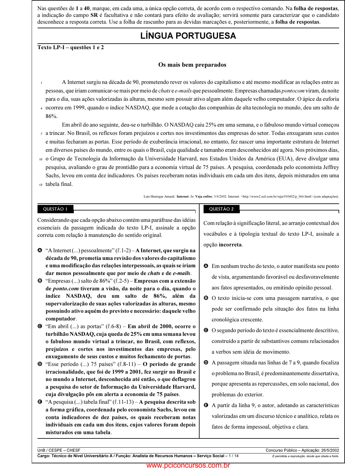 pcimarkpci MDAwMDowMDAwOjAwMDA6MDAwMDowMDAwOmZmZmY6ZDEwZTo0NDc4:RnJpLCAyOSBOb3YgMjAyNCAwNDowMDowMCAtMDMwMA== www.pciconcursos.com.br UnB / CESPE – CHESF Concurso Público – Aplicação: 26/5/2002 Cargo: Técnico de Nível Universitário A / Função: Analista de Recursos Humanos – Serviço Social – 1 / 14 É permitida a reprodução, desde que citada a fonte. Nas questões de 1 a 40, marque, em cada uma, a única opção correta, de acordo com o respectivo comando. Na folha de respostas, a indicação do campo SR é facultativa e não contará para efeito de avaliação; servirá somente para caracterizar que o candidato desconhece a resposta correta. Use a folha de rascunho para as devidas marcações e, posteriormente, a folha de respostas. LÍNGUA PORTUGUESA Texto LP-I – questões 1 e 2 Os mais bem preparados A Internet surgiu na década de 90, prometendo rever os valores do capitalismo e até mesmo modificar as relações entre as1 pessoas, que iriam comunicar-se mais por meio de chats e e-mails que pessoalmente. Empresas chamadas pontocom viram, da noite para o dia, suas ações valorizadas às alturas, mesmo sem possuir ativo algum além daquele velho computador. O ápice da euforia ocorreu em 1999, quando o índice NASDAQ, que mede a cotação das companhias de alta tecnologia no mundo, deu um salto de4 86%. Em abril do ano seguinte, deu-se o turbilhão. O NASDAQ caiu 25% em uma semana, e o fabuloso mundo virtual começou a trincar. No Brasil, os reflexos foram prejuízos e cortes nos investimentos das empresas do setor. Todas enxugaram seus custos7 e muitas fecharam as portas. Esse período de exuberância irracional, no entanto, fez nascer uma importante estrutura de Internet em diversos países do mundo, entre os quais o Brasil, cuja qualidade e tamanho eram desconhecidos até agora. Nos próximos dias, o Grupo de Tecnologia da Informação da Universidade Harvard, nos Estados Unidos da América (EUA), deve divulgar uma10 pesquisa, avaliando o grau de prontidão para a economia virtual de 75 países. A pesquisa, coordenada pelo economista Jeffrey Sachs, levou em conta dez indicadores. Os países receberam notas individuais em cada um dos itens, depois misturados em uma tabela final.13 Luís Henrique Amaral. Internet. In: Veja online, 3/4/2002. Internet: (com adaptações). QUESTÃO 1 Considerando que cada opção abaixo contém uma paráfrase das idéias essenciais da passagem indicada do texto LP-I, assinale a opção correta com relação à manutenção do sentido original. A “A Internet (...) pessoalmente” (R.1-2) – A Internet, que surgiu na década de 90, prometia uma revisão dos valores do capitalismo e uma modificação das relações interpessoais, as quais se iriam dar menos pessoalmente que por meio de chats e de e-mails. B “Empresas (...) salto de 86%” (R.2-5) – Empresas com a extensão de ponto.com tiveram a visão, da noite para o dia, quando o índice NASDAQ, deu um salto de 86%, além da supervalorização de suas ações valorizadas às alturas, mesmo possuindo ativo aquém do previsto e necessário: daquele velho computador. C “Em abril (...) as portas” (R.6-8) – Em abril de 2000, ocorre o turbilhão NASDAQ, cuja queda de 25% em uma semana levou o fabuloso mundo virtual a trincar, no Brasil, com reflexos, prejuízos e cortes nos investimentos das empresas, pelo enxugamento de seus custos e muitos fechamento de portas. D “Esse período (...) 75 países” (R.8-11) – O período de grande irracionalidade, que foi de 1999 a 2001, fez surgir no Brasil e no mundo a Internet, desconhecida até então, o que deflagrou a pesquisa do setor de Informação da Universidade Harvard, cuja divulgação pôs em alerta a economia de 75 países. E “A pesquisa (...) tabela final” (R.11-13) – A pesquisa descrita sob a forma gráfica, coordenada pelo economista Sachs, levou em conta indicadores de dez países, os quais receberam notas individuais em cada um dos itens, cujos valores foram depois misturados em uma tabela. QUESTÃO 2 Com relação à significação literal, ao arranjo contextual dos vocábulos e à tipologia textual do texto LP-I, assinale a opção incorreta. A Em nenhum trecho do texto, o autor manifesta seu ponto de vista, argumentando favorável ou desfavoravelmente aos fatos apresentados, ou emitindo opinião pessoal. B O texto inicia-se com uma passagem narrativa, o que pode ser confirmado pela situação dos fatos na linha cronológica crescente. C O segundo período do texto é essencialmente descritivo, construído a partir de substantivos comuns relacionados a verbos sem idéia de movimento. D A passagem situada nas linhas de 7 a 9, quando focaliza o problema no Brasil, é predominantemente dissertativa, porque apresenta as repercussões, em solo nacional, dos problemas do exterior. E A partir da linha 9, o autor, adotando as características valorizadas em um discurso técnico e analítico, relata os fatos de forma impessoal, objetiva e clara. www.pciconcursos.com.br pcimarkpci MDAwMDowMDAwOjAwMDA6MDAwMDowMDAwOmZmZmY6ZDEwZTo0NDc4:RnJpLCAyOSBOb3YgMjAyNCAwNDowMDowMSAtMDMwMA== www.pciconcursos.com.br UnB / CESPE – CHESF Concurso Público – Aplicação: 26/5/2002 Cargo: Técnico de Nível Universitário A / Função: Analista de Recursos Humanos – Serviço Social – 2 / 14 É permitida a reprodução, desde que citada a fonte. Quadro I Quadro II Texto LP-II – questões 3 e 4 Idem, ibidem. QUESTÃO 3 Considerando a hipótese de o texto LP-II ser reorganizado com todos os países do quadro I listados em ordem alfabética, incluindo aqueles sem classificação e aos quais o Brasil é comparado, assinale a opção incorreta quanto ao sentido e à grafia. A O último país a ser referido seria o Uruguai. B O Brasil estaria entre Áustria e Cingapura. C A nova ordenação colocaria o ocupante da terceira posição antes do que está em décimo lugar e o sexto país, antes do segundo mencionado no quadro. D Na nova lista