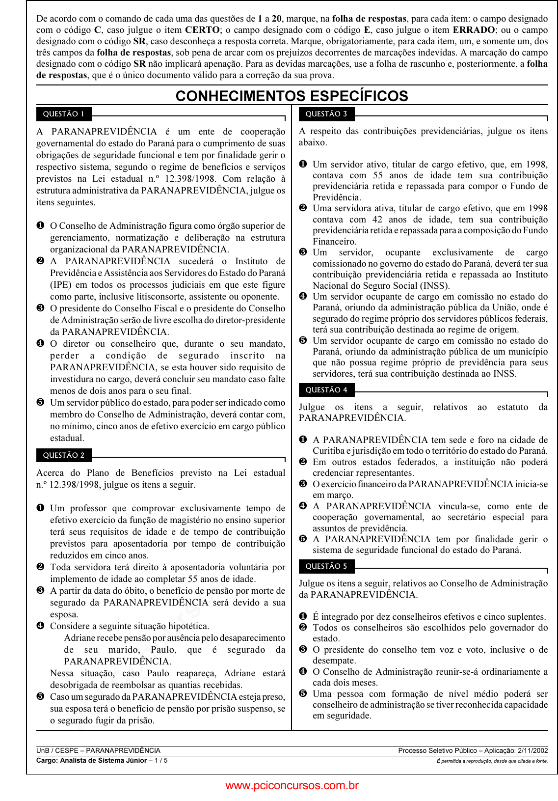 UnB / CESPE – PARANAPREVIDÊNCIA Processo Seletivo Público – Aplicação: 2/11/2002