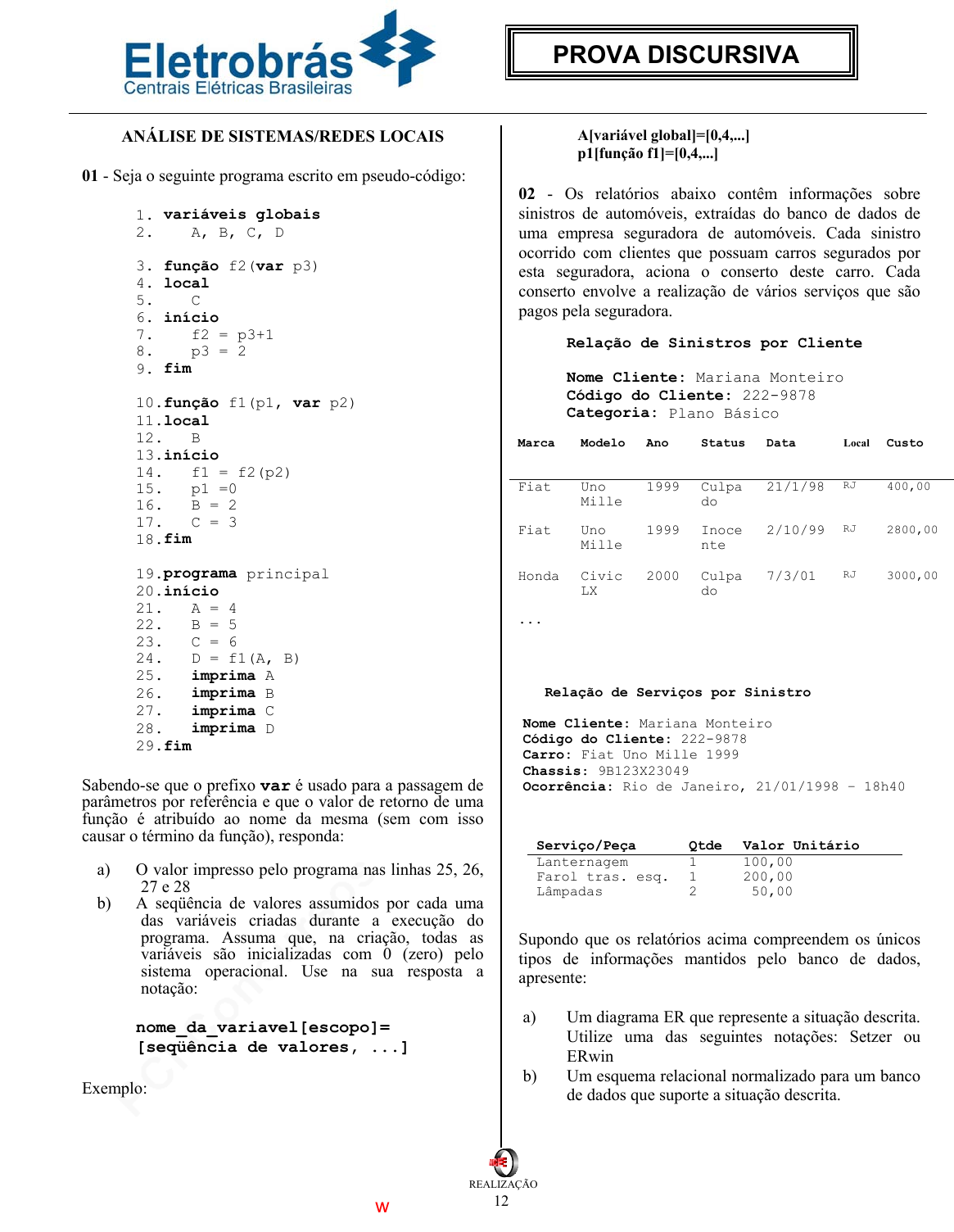 pcimarkpci MDAwMDowMDAwOjAwMDA6MDAwMDowMDAwOmZmZmY6ZDEwZTo0NWQ5:RnJpLCAyOSBOb3YgMjAyNCAwNDo0NjoyMiAtMDMwMA== www.pciconcursos.com.br 12 REALIZAÇÃO PROVA DISCURSIVA ANÁLISE DE SISTEMAS/REDES LOCAIS 01 - Seja o seguinte programa escrito em pseudo-código: 1. variáveis globais 2. A, B, C, D 3. função f2(var p3) 4. local 5. C 6. início 7. f2 = p3+1 8. p3 = 2 9. fim 10.função f1(p1, var p2) 11.local 12. B 13.início 14. f1 = f2(p2) 15. p1 =0 16. B = 2 17. C = 3 18.fim 19.programa principal 20.início 21. A = 4 22. B = 5 23. C = 6 24. D = f1(A, B) 25. imprima A 26. imprima B 27. imprima C 28. imprima D 29.fim Sabendo-se que o prefixo var é usado para a passagem de parâmetros por referência e que o valor de retorno de uma função é atribuído ao nome da mesma (sem com isso causar o término da função), responda: a) O valor impresso pelo programa nas linhas 25, 26, 27 e 28 b) A seqüência de valores assumidos por cada uma das variáveis criadas durante a execução do programa. Assuma que, na criação, todas as variáveis são inicializadas com 0 (zero) pelo sistema operacional. Use na sua resposta a notação: nome_da_variavel[escopo]= [seqüência de valores, ...] Exemplo: A[variável global]=[0,4,...] p1[função f1]=[0,4,...] 02 - Os relatórios abaixo contêm informações sobre sinistros de automóveis, extraídas do banco de dados de uma empresa seguradora de automóveis. Cada sinistro ocorrido com clientes que possuam carros segurados por esta seguradora, aciona o conserto deste carro. Cada conserto envolve a realização de vários serviços que são pagos pela seguradora. Relação de Sinistros por Cliente Nome Cliente: Mariana Monteiro Código do Cliente: 222-9878 Categoria: Plano Básico Relação de Serviços por Sinistro Nome Cliente: Mariana Monteiro Código do Cliente: 222-9878 Carro: Fiat Uno Mille 1999 Chassis: 9B123X23049 Ocorrência: Rio de Janeiro, 21/01/1998 – 18h40 Supondo que os relatórios acima compreendem os únicos tipos de informações mantidos pelo banco de dados, apresente: a) Um diagrama ER que represente a situação descrita. Utilize uma das seguintes notações: Setzer ou ERwin b) Um esquema relacional normalizado para um banco de dados que suporte a situação descrita. Marca Modelo Ano Status Data Local Custo Fiat Uno Mille 1999 Culpa do 21/1/98 RJ 400,00 Fiat Uno Mille 1999 Inoce nte 2/10/99 RJ 2800,00 Honda Civic LX 2000 Culpa do 7/3/01 RJ 3000,00 ... Serviço/Peça Qtde Valor Unitário Lanternagem 1 100,00 Farol tras. esq. 1 200,00 Lâmpadas 2 50,00 www.pciconcursos.com.br pcimarkpci MDAwMDowMDAwOjAwMDA6MDAwMDowMDAwOmZmZmY6ZDEwZTo0NWQ5:RnJpLCAyOSBOb3YgMjAyNCAwNDo0NjoyMiAtMDMwMA== www.pciconcursos.com.br 13 REALIZAÇÃO PROVA DISCURSIVA 03 - Uma empresa está se conectando à Internet. Para isso recebeu o endereço IP de rede 197.125.45.0 (classe C). Essa empresa é formada por 5 setores com número variado de computadores em cada setor, porém o setor com mais equipamentos possui 7 computadores. Devido às aplicações TCP/IP que serão utilizadas, os administradores resolveram colocar cada setor em uma sub-rede IP diferente. Lembre-se que, para permitir que as sub-redes se comuniquem, será necessário ligá-las a um roteador. Cada porta do roteador precisa ser configurada com um endereço IP da sub-rede a que está conectado. Observe o desenho abaixo que mostra apenas 3 setores da empresa: No desenho, A1 é o endereço IP atribuído à porta do roteador ligada no setor A e A2 até A8 são os endereços IP dos computadores do setor A (computador 1 até computador 7). O mesmo se aplica para B1 e B2 em relação ao setor B e C1 e C2 para o setor C. Os administradores definiram que o endereço IP de cada porta do roteador deverá ser o endereço IP com numeração mais baixa entre os disponíveis para a sub-rede em que está ligado. Os computadores daquela sub-rede receberão os endereços seqüenciais seguintes, de forma que os endereços mais altos não serão utilizados. Exemplo: supondo-se que o primeiro endereço IP disponível em uma sub-rede é 197.125.45.14. Nessa sub- rede a porta do roteador deverá ser configurada com endereço IP 197.125.45.14 e os computadores com os endereços IP 197.125.45.15, 197.125.45.16, e assim sucessivamente, até que todos os computadores daquele setor sejam configurados. Para a rede que foi descrita: 1 – Defina a máscara que deve ser usada de forma a maximizar o número de sub-redes disponíveis (nem todas precisam ser usadas). Justifique sua resposta. 2 – De todas as sub-redes válidas, os 5 setores da empresa devem receber os endereços das sub-redes de numeração mais baixa. Para cada um dos setores diga: a) Qual o endereço IP da sub-rede? b) Qual o endereço IP de broadcast? c) Qual o endereço IP do gateway que deve ser configurado em todos os computadores pertencentes ao setor? Roteador end IP A1 end IP A2end IP A3 . . . . setor A setor B end IP B1 end IP B2 end IP C1 end IP C2 setor C computador 2 computador 1computador 7 (máximo) end IP A8 www.pciconcursos.com.br pcimarkpci MDAwMDowMDAwOjAwMDA6MDAwMDowMDAwOmZmZmY6ZDEwZTo0NWQ5:RnJpLCAyOSBOb3YgMjAyNCAwNDo0NjoyMiAtMDMwMA== www.pciconcursos.com.br 14 REALIZAÇÃO PROVA DISCURSIVA 04 - Considere o esquema relacional abaixo, onde os atributos das chaves primárias aparecem sublinhados por uma linha contínua. ALUNO (Matrícula, Nome) TURMA (CódigoT, Sala) DISCIPLINA (CódigoD, Denominação) INSCRIÇÃO (Matrícula, CódigoT, CódigoD, Horário) a) Escreva o comando SQL que fornece a lista de alunos que têm homônimos, na forma Matrícula 1 Matrícula 2 Nome ... ... ... ... ... ... A lista deve conter todas as combinações possíveis, porém sem repetição, isto é, se as matrículas A e B aparecem numa linha, então a linha com as matrículas B e A não deve aparecer. A lista deve estar ordenada por nome. b) Escreva o comando SQL que atrase em uma hora o horário de todas as inscrições na disciplina cuja denominação é “Matemá