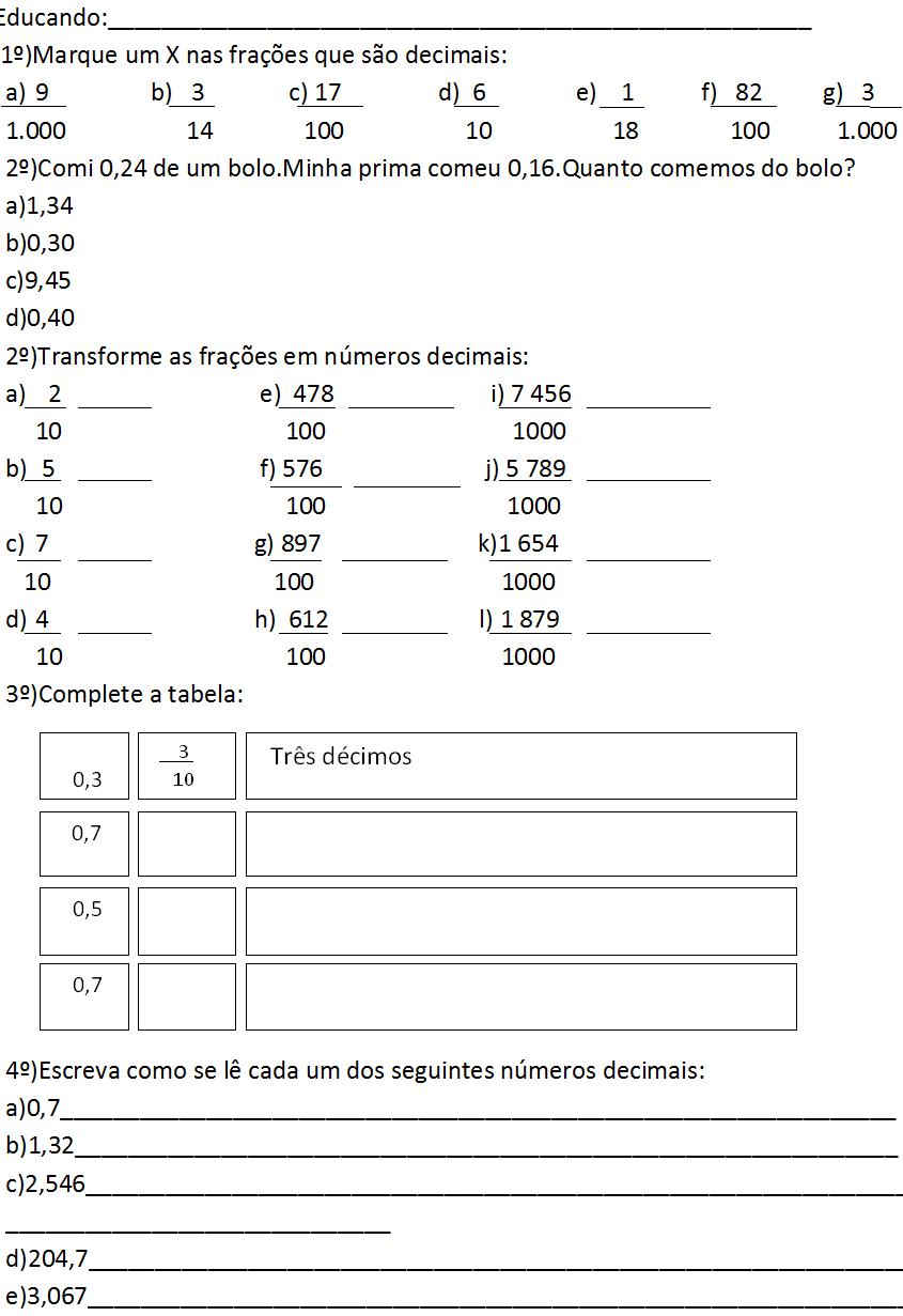 Educando: um X nas frações que são decimais: a) 9 b) 3 c) 17 d) 6 e) 1 f) 82 g) 3 1.000 14 100 10 18 100 1.000 )Comi 0,24 de um bolo.Minha prima comeu 0,16.Quanto comemos do bolo? a)1,34 b)0,30 c)9,45 d)0,40 as frações em números decimais: a) 2 e) 478 i) 7 456 10 100 1000 b) 5 f) 576 j) 5 789 10 100 1000 g) 897 k) 1 654 10 100 1000 d) 4 h) 612 I) 1 879 10 100 1000 3°) Complete a tabela: 3 Três décimos 0,3 10 0,7 0,5 0,7 Escreva como se lê cada um dos seguintes números decimais: a) )0,7 b)1,32 )2,546 d) )204,7 e)3,067