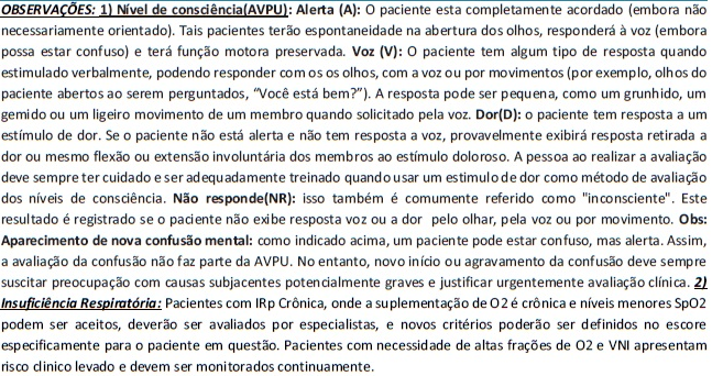 OBSERVAÇÕES: 1) Nível de Alerta (A): paciente esta completamente acordado (embora não necessariamente orientado). Tais pacientes terão espontaneidade na abertura dos olhos, responderá à voz (embora possa estar confuso) e terá função motora preservada. Voz (V): o paciente tem algum tipo de resposta quando estimulado verbalmente, podendo responder com os os olhos, com a voz ou por movimentos (por exemplo, olhos do paciente abertos ao serem perguntados, "Você está bem?"). A resposta pode ser pequena, como um grunhido, um gemido ou um ligeiro movimento de um membro quando solicitado pela voz. Dor(D): paciente tem resposta a um estímulo de dor. Se paciente não está alerta e não tem resposta a voz, provavelmente exibirá resposta retirada a dor ou mesmo flexão ou extensão involuntária dos membros ao estímulo doloroso. A pessoa ao realizar a avaliação deve sempre ter cuidado e ser adequadamente treinado quando usar um estimulo de dor como método de avaliação dos níveis de consciência. Não responde(NR): isso também é comumente referido como "inconsciente". Este resultado é registrado se paciente não exibe resposta voz ou a dor pelo olhar, pela ou por movimento. Obs: Aparecimento de nova confusão mental: como indicado acima, um paciente pode estar confuso, mas alerta. Assim, a avaliação da confusão não faz parte da AVPU. No entanto, novo início ou agravamento da confusão deve sempre suscitar preocupação com causas subjacentes potencialmente graves e justificar urgentemente avaliação 2) Insuficiência Respiratória: Pacientes com IRp Crônica, onde a suplementação de crônica e níveis menores SpO2 podem ser aceitos, deverão ser avaliados por especialistas, e novos critérios poderão ser definidos no escore especificamente para paciente em questão. Pacientes com necessidade de altas frações de e VNI apresentam risco clinico levado e devem ser monitorados continuamente.