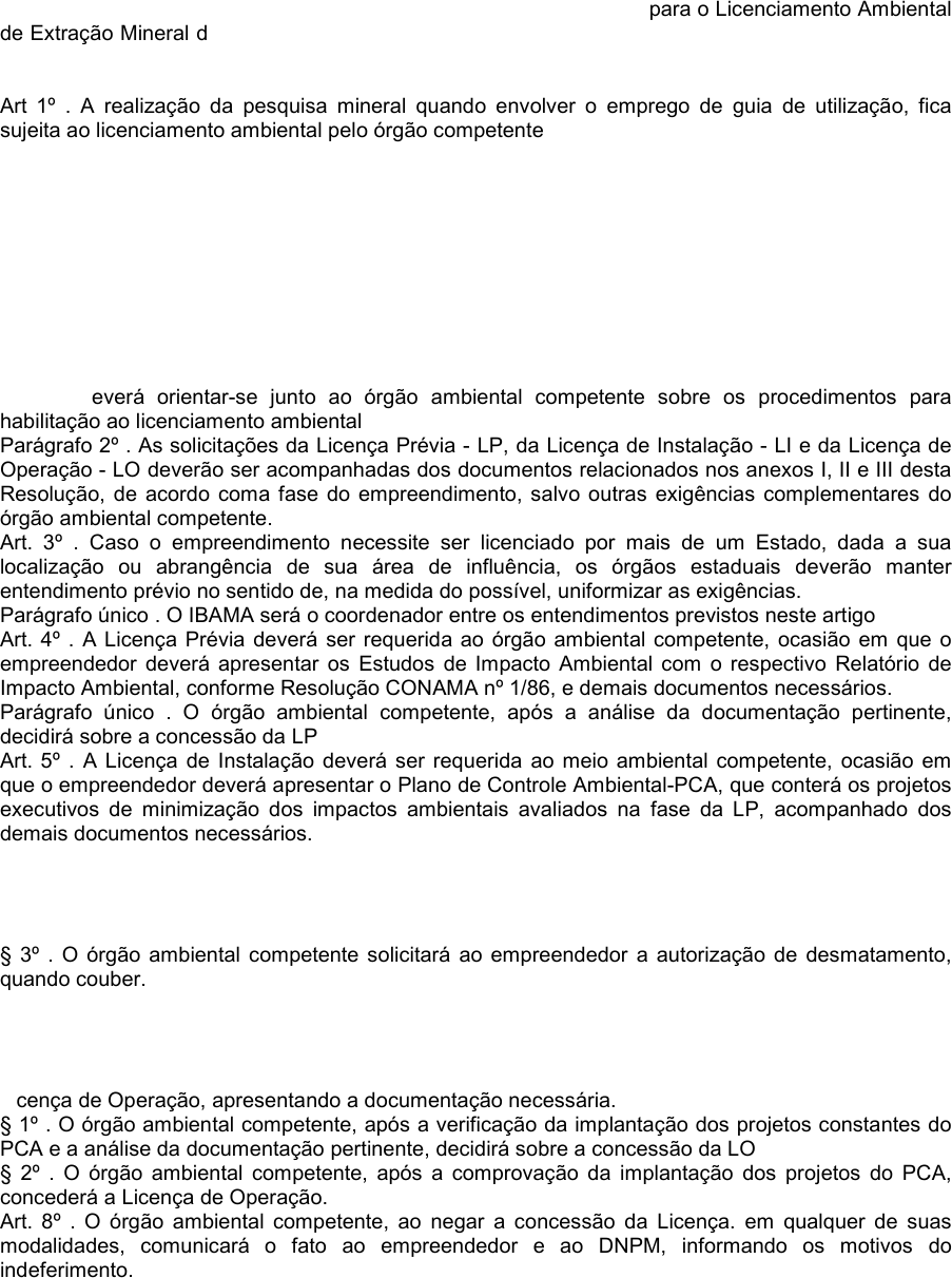 RESOLUÇÃO CONAMA Nº 9, de 6 de dezembro de 1990 O CONSELHO NACIONAL DO MEIO AMBIENTE - CONAMA, no uso das atribuições que lhe confere o art. 79, inciso II, do Decreto nº 99.274, de 06 de junho de 1990, para efetivo exercício das responsabilidades que lhe são atribuídas pelo art. 17 do mesmo Decreto, e Considerando a necessidade de serem editadas normas específicas para o Licenciamento Ambiental de Extração Mineral das classes I, III, IV, V, VI, VII, VIII e IX (Decreto-Lei nº 227, 28 de fevereiro de 1967), e tendo em vista o disposto no art. 18, do Decreto nº 98.812, de 09 de janeiro de 1990, RESOLVE: Art 1º . A realização da pesquisa mineral quando envolver o emprego de guia de utilização, fica sujeita ao licenciamento ambiental pelo órgão competente. Parágrafo único . O empreendedor deverá requerer ao órgão ambiental competente a licença de operação para pesquisa mineral, nos casos previstos no "caput" deste artigo, apresentando o plano de pesquisa mineral, com a avaliação do impacto ambiental e as medidas mitigadoras a serem adotadas. Art 2º . Para o empreendedor exercer as atividades de lavra e/ou beneficiamento mineral das classes I, III, IV, V, VI, VII, VIII e IX, excetuado o regime de permissão de lavra garimpeira. deverá submeter seu pedido de licenciamento ambiental ao órgão estadual de meio ambiente ou ao IBAMA, quando couber, prestando todas as informações técnicas sobre o respectivo empreendimento, conforme prevê a legislação ambiental vigente, bem como atender ao disposto nesta Resolução. Parágrafo 1º . O empreendedor, quando da apresentação do Relatório de Pesquisa Mineral ao DNPM, deverá orientar-se junto ao órgão ambiental competente sobre os procedimentos para habilitação ao licenciamento ambiental Parágrafo 2º . As solicitações da Licença Prévia - LP, da Licença de Instalação - LI e da Licença de Operação - LO deverão ser acompanhadas dos documentos relacionados nos anexos I, II e III desta Resolução, de acordo coma fase do empreendimento, salvo outras exigências complementares do órgão ambiental competente. Art. 3º . Caso o empreendimento necessite ser licenciado por mais de um Estado, dada a sua localização ou abrangência de sua área de influência, os órgãos estaduais deverão manter entendimento prévio no sentido de, na medida do possível, uniformizar as exigências. Parágrafo único . O IBAMA será o coordenador entre os entendimentos previstos neste artigo. Art. 4º . A Licença Prévia deverá ser requerida ao órgão ambiental competente, ocasião em que o empreendedor deverá apresentar os Estudos de Impacto Ambiental com o respectivo Relatório de Impacto Ambiental, conforme Resolução CONAMA nº 1/86, e demais documentos necessários. Parágrafo único . O órgão ambiental competente, após a análise da documentação pertinente, decidirá sobre a concessão da LP. Art. 5º . A Licença de Instalação deverá ser requerida ao meio ambiental competente, ocasião em que o empreendedor deverá apresentar o Plano de Controle Ambiental-PCA, que conterá os projetos executivos de minimização dos impactos ambientais avaliados na fase da LP, acompanhado dos demais documentos necessários. § lº . O órgão ambiental competente, após a análise do PCA do empreendimento e da documentação pertinente, decidirá sobre a concessão da LI. § 2º . O ambiental competente, após a aprovação do PCA do empreendimento, concederá a Licença de Instalação. § 3º . O órgão ambiental competente solicitará ao empreendedor a autorização de desmatamento, quando couber. Art. 6º . A concessão da Portaria de lavra ficará condicionada à apresentação ao DNPM, por parte do empreendedor, da Licença de Instalação. Art. 7º . Após a obtenção da Portaria de lavra e a implantação dos projetos constantes do PCA, aprovados quando da concessão da Licença de Instalação, o empreendedor deverá requerer a Licença de Operação, apresentando a documentação necessária. § 1º . O órgão ambiental competente, após a verificação da implantação dos projetos constantes do PCA e a análise da documentação pertinente, decidirá sobre a concessão da LO. § 2º . O órgão ambiental competente, após a comprovação da implantação dos projetos do PCA, concederá a Licença de Operação. Art. 8º . O órgão ambiental competente, ao negar a concessão da Licença. em qualquer de suas modalidades, comunicará o fato ao empreendedor e ao DNPM, informando os motivos do indeferimento. Art. 9º . O não cumprimento do disposto nesta Resolução acarretará aos infratores as sanções previstas nas Leis nºs 6.938, de 31 de agosto de 1981 e 7.805, de 18 de julho de 1989, regulamentadas pelos Decretos nº 99.274, de 06 de junho de 1990 e nº 98.812, de 09 de janeiro de 1990, e demais leis específicas Art. 10 . Esta Resolução entra em vigor na data de sua publicação, revogadas as disposições em contrário. ANEXO I TIPO DE LICENÇA DOCUMENTOS NECESSÁRIOS LICENÇA PRÉVIA - LP (fase de planejamento e viabilidade do empreendimento) 1. Requerimento da LP 2. Cópia da publicação do pedido da LP 3. Certidão da Prefeitura Municipal 4. Estudos de Impacto Ambiental - EIA e seu respectivo Relatório de Impacto Ambiental - RIMA, conforme Resolução CONAMA nº 1/86 ANEXO II TIPO DE LICENÇA DOCUMENTOS NECESSÁRIOS LICENÇA DE INSTALAÇÃO - LI ( fase de desenvolvimento da mina, de instalação do complexo minerário, inclusive a usina, e implantação dos projetos de controle ambiental) 1. Requerimento da LI 2. Cópia da publicação do pedido da LI 3. Cópia da publicação da concessão da LP 4. Cópia da comunicação do DNPM julgando satisfatório ao PAE - Plano de Aproveitamento Econômico 5. Plano de Controle Ambiental 6. Licença para desmate expedida pelo órgão competente, quando for o caso ANEXO III TIPO DE LICENÇA DOCUMENTOS NECESSÁRIOS LICENÇA DE OPERAÇÃO (fase de lavr