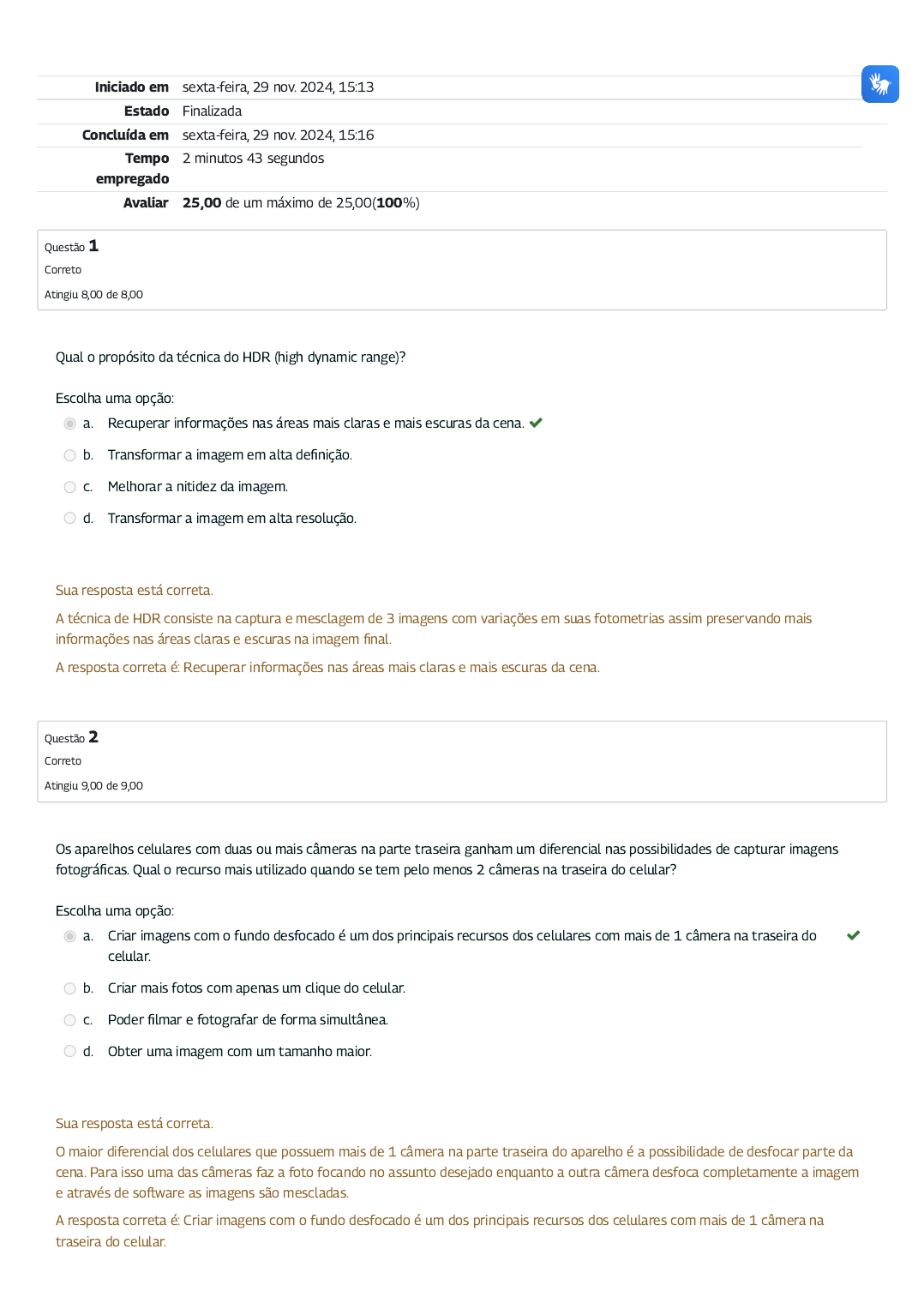 Iniciado em sexta-feira, 29 nov. 2024, 15:13 Estado Finalizada Concluída em sexta-feira, 29 nov. 2024, 15:16 Tempo empregado 2 minutos 43 segundos Avaliar 25,00 de um máximo de 25,00(100%) Questão 1 Correto Atingiu 8,00 de 8,00 Questão 2 Correto Atingiu 9,00 de 9,00 Qual o propósito da técnica do HDR (high dynamic range)? Escolha uma opção: a. Recuperar informações nas áreas mais claras e mais escuras da cena. b. Transformar a imagem em alta de�nição. c. Melhorar a nitidez da imagem. d. Transformar a imagem em alta resolução. Sua resposta está correta. A técnica de HDR consiste na captura e mesclagem de 3 imagens com variações em suas fotometrias assim preservando mais informações nas áreas claras e escuras na imagem �nal. A resposta correta é: Recuperar informações nas áreas mais claras e mais escuras da cena. Os aparelhos celulares com duas ou mais câmeras na parte traseira ganham um diferencial nas possibilidades de capturar imagens fotográ�cas. Qual o recurso mais utilizado quando se tem pelo menos 2 câmeras na traseira do celular? Escolha uma opção: a. Criar imagens com o fundo desfocado é um dos principais recursos dos celulares com mais de 1 câmera na traseira do celular. b. Criar mais fotos com apenas um clique do celular. c. Poder �lmar e fotografar de forma simultânea. d. Obter uma imagem com um tamanho maior. Sua resposta está correta. O maior diferencial dos celulares que possuem mais de 1 câmera na parte traseira do aparelho é a possibilidade de desfocar parte da cena. Para isso uma das câmeras faz a foto focando no assunto desejado enquanto a outra câmera desfoca completamente a imagem e através de so�ware as imagens são mescladas. A resposta correta é: Criar imagens com o fundo desfocado é um dos principais recursos dos celulares com mais de 1 câmera na traseira do celular. Questão 3 Correto Atingiu 8,00 de 8,00 Assinale as alternativas corretas: I – A distorção barril é aquela onde o centro da imagem sobre uma magni�cação maior do que as bordas. II – A distorção almofada é aquela onde o centro da imagem sobre menos magni�cação do que as bordas. III – A distorção complexa é a junção da distorção barril e almofada na mesma imagem. Escolha uma opção: a. Todas estão corretas. b. Somente as alternativas I e II estão corretas. c. As alternativas I e III estão corretas. d. Somente a alternativa III está correta. Sua resposta está correta. As distorções esféricas ou radiais ocorrem devido ao formato, material de construção de alinhamento das lentes dentro das objetivas. Os principais efeitos são as distorções barril, almofada e complexa, onde a distorção barril possui uma maior magni�cação no centro da imagem enquanto na almofada a magni�cação maior �ca nas bordas. Já a distorção complexa é a junção das duas outras distorções. A resposta correta é: Todas estão corretas.
