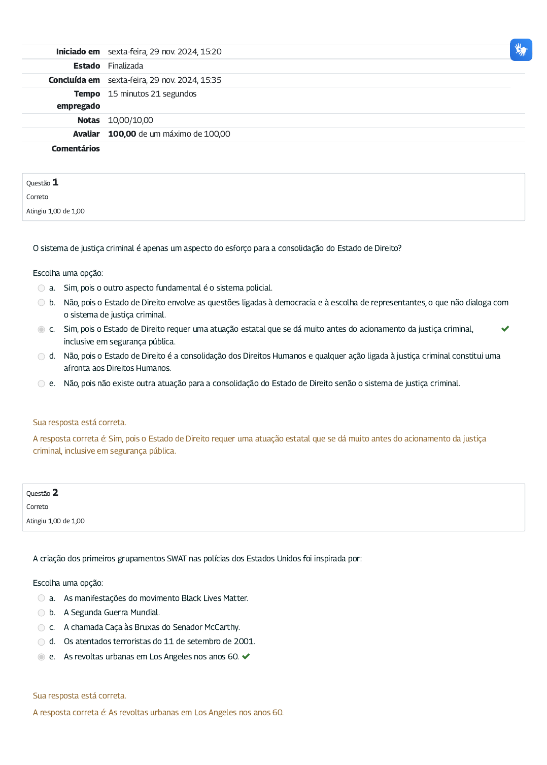 Iniciado em sexta-feira, 29 nov. 2024, 15:20 Estado Finalizada Concluída em sexta-feira, 29 nov. 2024, 15:35 Tempo empregado 15 minutos 21 segundos Notas 10,00/10,00 Avaliar 100,00 de um máximo de 100,00 Comentários Questão 1 Correto Atingiu 1,00 de 1,00 Questão 2 Correto Atingiu 1,00 de 1,00 O sistema de justiça criminal é apenas um aspecto do esforço para a consolidação do Estado de Direito? Escolha uma opção: a. Sim, pois o outro aspecto fundamental é o sistema policial. b. Não, pois o Estado de Direito envolve as questões ligadas à democracia e à escolha de representantes, o que não dialoga com o sistema de justiça criminal. c. Sim, pois o Estado de Direito requer uma atuação estatal que se dá muito antes do acionamento da justiça criminal, inclusive em segurança pública. d. Não, pois o Estado de Direito é a consolidação dos Direitos Humanos e qualquer ação ligada à justiça criminal constitui uma afronta aos Direitos Humanos. e. Não, pois não existe outra atuação para a consolidação do Estado de Direito senão o sistema de justiça criminal. Sua resposta está correta. A resposta correta é: Sim, pois o Estado de Direito requer uma atuação estatal que se dá muito antes do acionamento da justiça criminal, inclusive em segurança pública. A criação dos primeiros grupamentos SWAT nas polícias dos Estados Unidos foi inspirada por: Escolha uma opção: a. As manifestações do movimento Black Lives Matter. b. A Segunda Guerra Mundial. c. A chamada Caça às Bruxas do Senador McCarthy. d. Os atentados terroristas do 11 de setembro de 2001. e. As revoltas urbanas em Los Angeles nos anos 60. Sua resposta está correta. A resposta correta é: As revoltas urbanas em Los Angeles nos anos 60. Questão 3 Correto Atingiu 1,00 de 1,00 Questão 4 Correto Atingiu 1,00 de 1,00 Com base no que foi discutido na Aula 4, assinale a resposta que melhor caracteriza a de�nição de "moral". Escolha uma opção: a. Um sistema de valores e princípios que orientam o comportamento humano, diferenciando entre o certo e o errado, e que varia segundo sociedade, cultura ou grupo, sendo in�uenciada por fatores como a religião, a origem social, a ocupação, orientação sexual, dentre outros. b. Uma série de leis e regulamentos impostos pelo Estado para manter a ordem na sociedade. c. Um conjunto de regras de etiqueta social que ditam comportamentos aceitáveis em diferentes culturas. d. Uma �loso�a que nega a existência de qualquer padrão moral ou ético na sociedade. e. Uma abordagem puramente religiosa para a vida, sem relevância na esfera secular. Sua resposta está correta. A resposta correta é: Um sistema de valores e princípios que orientam o comportamento humano, diferenciando entre o certo e o errado, e que varia segundo sociedade, cultura ou grupo, sendo in�uenciada por fatores como a religião, a origem social, a ocupação, orientação sexual, dentre outros. O “Tenente Geral de Polícia” na França no século XVII contava com uma equipe institucional composta por: Escolha uma opção: a. Soldados do Exército. b. Constables. c. Infantes de marinha e soldados do exército. d. Comissários por bairro. e. Vigilantes noturnos. Sua resposta está correta. A resposta correta é: Comissários por bairro. Questão 5 Correto Atingiu 1,00 de 1,00 Questão 6 Correto Atingiu 1,00 de 1,00 Por que as Revoluções Inglesa e Francesa são chamadas de Revoluções Burguesas? Escolha uma opção: a. Porque tiveram como principal motivação o atendimento aos anseios dessa classe social, que reivindicava maior participação no poder. b. Porque tais revolução se impôs sobre a população mais pobre desses países. c. Porque representaram a passagem de costumes menos re�nados para hábitos menos violentos e, assim chamados, burgueses. d. Porque os “burgos” eram os locais onde se reuniam os revolucionários. e. Porque a burguesia inglesa e francesa se uniu para expandir seu poderio econômico. Sua resposta está correta. A resposta correta é: Porque tiveram como principal motivação o atendimento aos anseios dessa classe social, que reivindicava maior participação no poder. Com base no conceito de “insulto moral” de Luiz Roberto Cardoso de Oliveira (2008), assinale a resposta que melhor caracteriza o papel da polícia no Estado Democrático de Direito. “Trata-se de direitos acionados em interações que não podem chegar a bom termo por meio de procedimentos estritamente formais e que requerem esforços de elaboração simbólica da parte dos interlocutores para viabilizar o estabelecimento de uma conexão substantiva entre eles, permitindo o exercício dos respectivos direitos.” (OLIVEIRA, 2008, p. 136). I - Ao reconhecer demandas por respeito e consideração que muitas vezes permeiam as percepções das pessoas sobre o que constitui uma agressão e as formas satisfatórias de reparação o/a policial pode agir como um facilitador do acesso a direitos. II - Ao realizar o trabalho de elaboração simbólica a que se refere Cardoso de Oliveira (2008), o/a policial deve ignorar as leis e se concentrar nas demandas por respeito e consideração da população. III - Ao realizar o trabalho de elaboração simbólica a que se refere Cardoso de Oliveira (2008), o/a policial reduz o hiato de reconhecimento entre a lei universal e a norma social na produção de alternativas de regulação adequadas e legais para cada situação especí�ca. Escolha uma opção: a. As opções I e III são verdadeiras. b. Todas as opções são verdadeiras. c. As opções II e III são verdadeiras. d. As opções I e II são verdadeiras. e. Nenhuma das opções é verdadeira. Sua resposta está correta. A resposta correta é: As opções I e III são verdadeiras. Questão 7 Correto Atingiu 1,00 de 1,00 Questão 8 Correto Atingiu 1,00 de 1,00 Robert Reiner, em seu texto “�e Police in the Class Structure” (1978), fala da questão da di�culdade da identi