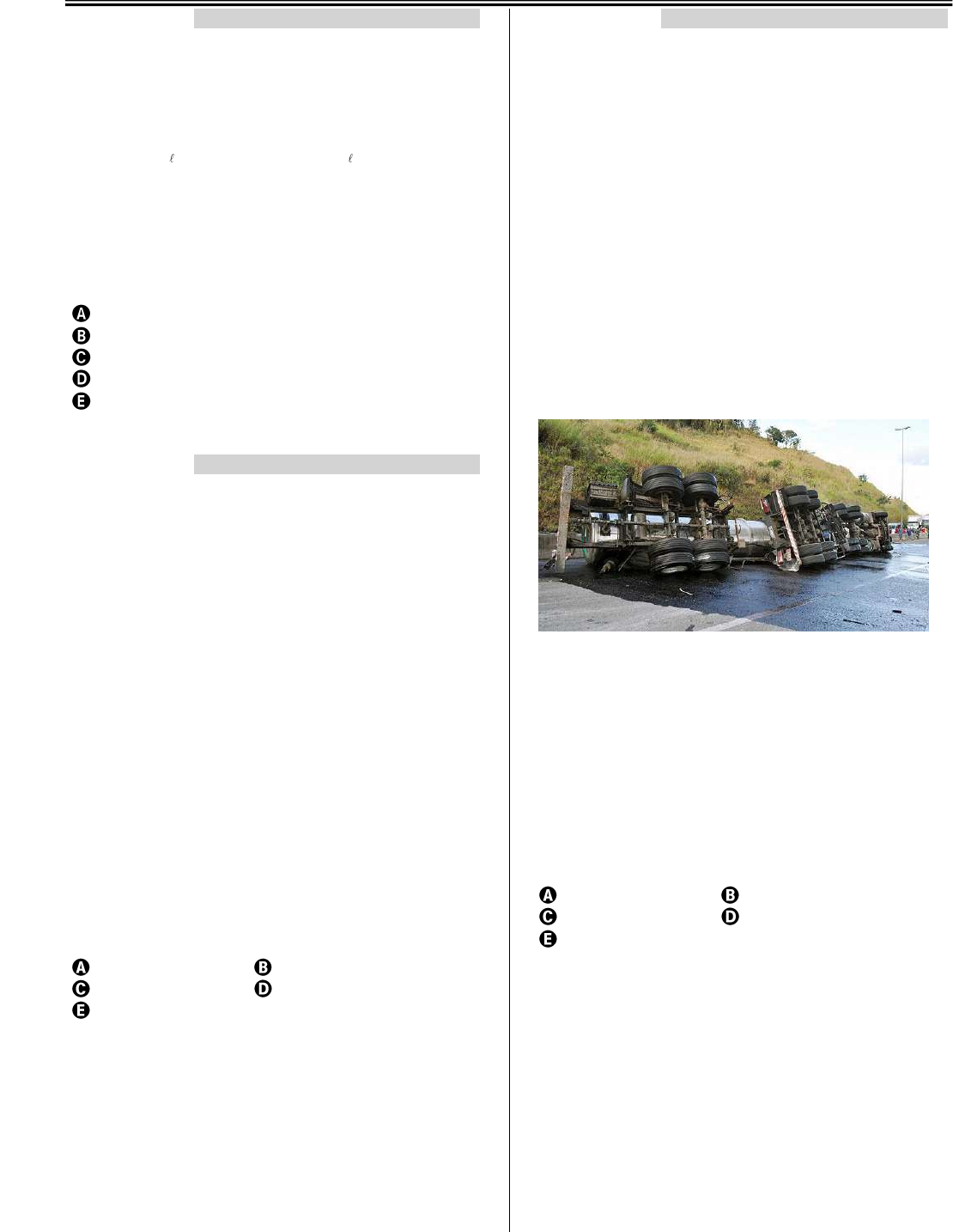 1000 QUESTÕES DE QUÍMICA PARA O ENEM 1000 QUESTÕES DE QUÍMICA – CADERNO ÚNICO | Página 100 QUESTÃO 331 -------------------------------------------------- O ácido adípico, H2C6H8O4, é usado para produzir náilon. Ele é preparado comercialmente através da reação controlada entre o ciclo- hexano e o oxigênio, esquematizada a seguir. ( )+ → +6 12( ) 2(g) 2 6 8 4( ) 2 g 2C H 5O 2H C H O 2H O Considerando que um químico realizou um ensaio dessa reação com 25 g de ciclo-hexano com excesso de oxigênio e obteve 35,5 g de ácido adípico, o rendimento esperado desse ácido e o rendimento percentual obtido foi de: 22,8 g e 77%, respectivamente. 43,5 g e 87%, respectivamente. 43,5 g e 77%, respectivamente. 35,5 g e 100%, respectivamente. 87,0 g e 200%, respectivamente. QUESTÃO 332 -------------------------------------------------- O químico francês Lavoisier ficaria surpreso se conhecesse os atuais processos de reciclagem de lixo. É assim que moradores, empresários e o poder público seguem à risca a máxima do cientista que revolucionou o século XVIII, ao provar que na natureza nada se cria, nada se perde, tudo se transforma. Ao mesmo tempo em que diminui a quantidade de lixo jogado nos aterros sanitários, há a transformação de lixo em objeto de consumo. Nada se perde. Assim, observe a seguinte equação, que representa uma das reações envolvidas no processo de reciclagem do alumínio. 2Al2O3(s) → 4Al (s) + 3O2(g) Se uma massa de 204 kg for reciclada, o volume (nas CNTP) de gás oxigênio liberado nessa reação será de, aproximadamente Dados: Massa molar do Al2O3 = 102 g/mol; volume molar do gás = 22,4 L/mol. 6,7 · 104 L. 7,0 · 103 L. 6,7 · 103 L. 54 · 103 L. 0,8 · 103 L QUESTÃO 333 -------------------------------------------------- Caminhão com ácido sulfúrico tomba e deixa dois feridos na BR-381, em Nova Era Segundo a Polícia Rodoviária Federal (PRF), o veículo de carga, que seguia sentido Belo Horizonte/Ipatinga, atingiu a mureta central da pista. Com a colisão, o tanque do caminhão rasgou [...]. De acordo com o Corpo de Bombeiros, parte do ácido atingiu o Rio Piracicaba próximo ao local do acidente. Militares conseguiram conter parte do material, porém, devido ao grande volume, parte do líquido atingiu o manancial. Segundo um morador da cidade, Valdecir Justino de Oliveira, a prefeitura alertou a população para não entrar em contato com a água do rio. “Carros de som estão alertando a população para não pegar os peixes que estão mortos nem entrar no rio”, disse Oliveira. [...] Disponível em: . Acesso em: maio 2013. Ao atingir o Rio Piracicaba, a substância provocou uma ionização no meio aquoso. Caso fosse possível neutralizar os efeitos do ácido sulfúrico no rio, a massa de hidróxido de potássio (KOH) necessária para neutralizar cada 9,8 kg do ácido seria de: Dados: P = 39 g/mol; H = 1 g/mol; S = 32 g/mol; O = 16 g/mol; K = 39 g/mol. 11,2 kg. 5,60 kg. 2,80 kg. 1,40 kg. 0,70 kg. http://www.em.com.br/ ENEM 2019 1000 QUESTÕES DE QUÍMICA – CADERNO ÚNICO | Página 101 QUESTÃO 334 -------------------------------------------------- Os air bags de segurança em automóveis funcionam por meio da geração de gás nitrogênio advindo da decomposição rápida de azida de sódio, NaN3: 2NaN3(s)→ 2Na(s) + 3N2(g) Se um air bag tem um volume de 36 L e contém gás nitrogênio a uma pressão de 1,5 atm à temperatura de 27°C, significa que foram decompostos aproximadamente: Dados: R = 0,082 L · atm/mol · K; MMNaN3 = 65 g/mol. 95 g de azida de sódio. 115 g de azida de sódio. 23 g de nitrogênio. 131 g de azida de sódio. 28 g de nitrogênio. QUESTÃO 335 -------------------------------------------------- A creatina é derivada de aminoácido, presente nas células musculares, e serve para repor energia quando há fadiga muscular. Apesar de comprovadamente aumentar a massa muscular, ainda não é proibida pelas entidades esportivas. Sua composição percentual é, em massa, 36,6% de carbono, 6,9% de hidrogênio, 32,1% de nitrogênio e 24,4% de oxigênio. Com base nessas informações, a fórmula molecular e a massa molecular da creatina podem ser descritas, respectivamente, como: C4H9N3O2 e 131 g/mol C3H6N3O2 e 131 g/mol C4H9N3O2 e 65 g/mol C4HN3O e 106 g/mol C8H5N3O e 159 g/mol QUESTÃO 336 -------------------------------------------------- Nas máscaras usadas na aviação para fornecimento de gás oxigênio, a reação química que ocorre pode ser representada pela equação 4 Fe(s) + 4 NaClO3(s) 2 Fe2O3 + 4 NaCl(s) + 3 O2(g) Partindo de 19,2 g do redutor e 16 g do íon oxidante no processo descrito, a reação evolui atingindo um rendimento de 95%. O volume gasoso produzido se medido a 27 ºC e 1 atm na transformação apresentada é, em cm3, aproximadamente Massas molares (g.mol-1): O = 16; Na = 23; Cl = 35,5; Fe = 56. 2,10. 2,80. 3,37 3 358,50. 3 542,40 QUESTÃO 337 -------------------------------------------------- Por mais de um século, engenheiros têm utilizado o sulfato de alumínio – Aℓ2(SO4)3 –como agente floculante. Quando a água está suja com sedimentos e bactérias, pode-se fazê-la ficar cintilante e limpa pela adição de uma pequena quantidade de cal hidratada (hidróxido de cálcio) e sulfato de alumínio. Esta combinação precipita hidróxido de alumínio sólido, que carrega impurezas para baixo ao afundar. EMSLEY, J. Moléculas em exposição. São Paulo: Edgard Blücher, 2001. pp. 147-50 (adaptado). Após análise da fórmula química do sulfato de alumínio, a fórmula centesimal dessa substância será Dados: Aℓ = 27 g/mol; S = 32 g/mol; O = 16 g/mol. Aℓ27%S32%O16%. Aℓ14%S16%O8%. Aℓ50%S25%O25%. Aℓ15,8%S28,1%O56,1%. Aℓ14,5%S26,5%O59%. QUESTÃO 338 -------------------------------------------------- O vulcão químico é um experimento muito utilizado em sala para mostrar aos estudantes evidências de um fenômeno. Ao reagir ácido acético (C2H4O2, principal constituinte d