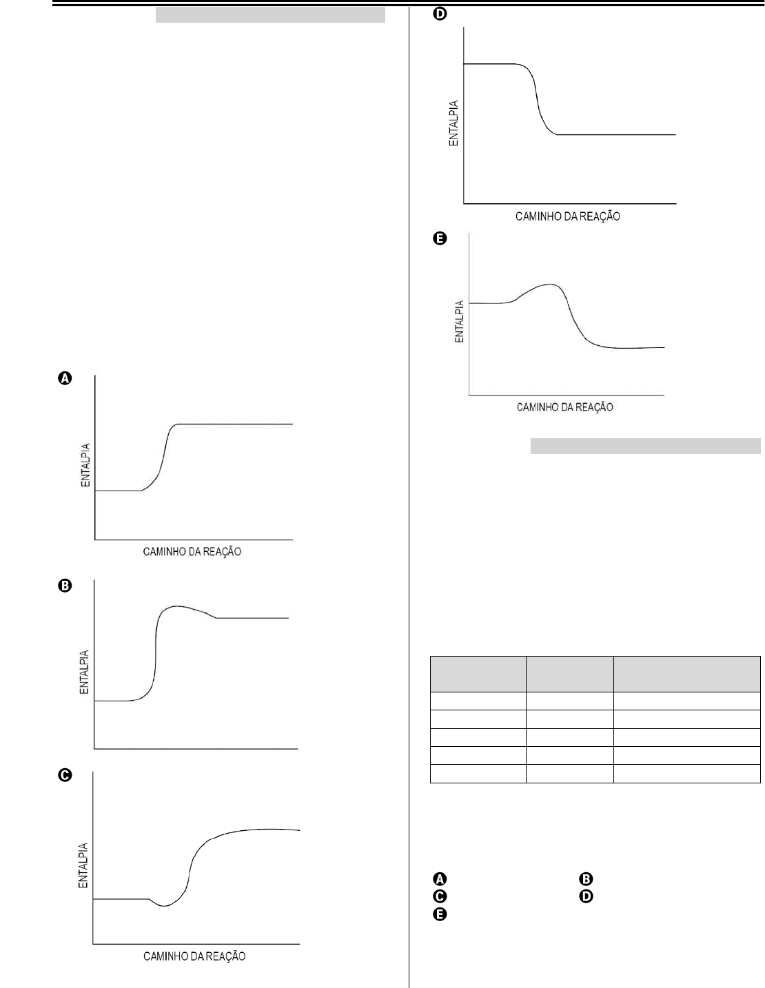 ENEM 2019 1000 QUESTÕES DE QUÍMICA – CADERNO ÚNICO | Página 133 QUESTÃO 441 -------------------------------------------------- A reação de combustão do gás liquefeito de petróleo, ou GLP, que ocorre nos fogões diariamente, pode ser representada como: GLP + O2 H2O + CO2 Nela, o GLP age como o combustível, e o oxigênio, como agente oxidante; essa reação libera, além dos produtos indicados, a energia que será utilizada no cozimento dos alimentos. Entretanto, essa reação não se inicia espontaneamente. Mesmo após o canal do GLP ser aberto, o fogão só se acende quando o botão de ignição é acionado, ou quando uma outra chama é colocada perto da saída do gás. Essa ação fornece a energia necessária para que a reação se inicie. Qual gráfico representa corretamente a variação de entalpia da reação de combustão do GLP? QUESTÃO 442 -------------------------------------------------- A emissão de CO2 pela queima de combustíveis é um dos grandes problemas da atualidade, já que esse gás dificulta que a energia térmica fornecida pelo sol seja dissipada da superfície terrestre para o espaço, agravando o fenômeno conhecido como efeito estufa. Assim, existe uma grande importância na razão entre a energia liberada na queima de combustíveis e a quantidade de CO2 produzida. A tabela mostra dados de calor de combustão para alguns combustíveis. Considerando as substâncias apresentadas na tabela, a que apresenta o maior poder calorífico por mol de CO2 liberado na sua reação de combustão completa é o metanol. etanol. metano. propano. butano. Substância Fórmula molecular Poder calorífico (kJ/mol) Metanol CH4O 726 Etanol C2H6O 1300 Metano CH4 889 Propano C3H8 2220 Butano C4H10 2877 1000 QUESTÕES DE QUÍMICA PARA O ENEM 1000 QUESTÕES DE QUÍMICA – CADERNO ÚNICO | Página 134 QUESTÃO 443 -------------------------------------------------- Bebês que ainda estão sendo amamentados não precisam de mais nenhuma ingestão de líquido: a necessidade diária é suprida pelo leite materno. Quando a criança para de ser amamentada, é hora de introduzir alimentos, e é também hora de começar a beber água e outros líquidos, como sucos e chás. Até 1 ano de idade, bebês devem ingerir cerca de 0,8 a 1 litro de água por dia. Entre 1 e 8 anos, essa quantidade aumenta para cerca de 1,3 a 1,8 litro/dia. Disponível em: Acesso em: 13 de Jun. 2015. É representado na tabela a seguir as energias de ligação referentes à reação química de fomração da água. Ligação Energia de ligação (kcal/mol) H – H 104 O = O 118 H – O 109 Considerando a reação de formação da água (18 g/mol) a partir dos reagentes no estado padrão e os dados da tabela, a quantidade, em kcal de energia, liberada na formação de água suficiente para suprir a necessidade máxima do organismo de um garoto de sete anos é aproximadamente Considere a densidade da água sendo 1g/mL 5 500. 3 300. 7 700. 2 200. 1 100. QUESTÃO 444 -------------------------------------------------- O formaldeído é o mais simples dos aldeídos e, quando dissolvido em água, é conhecido popularmente como formol. Esse aldeído é uma substância muito versátil na indústria química, sendo aplicado na produção de produtos farmacêuticos, papeis, tecidos e solventes. A produção de formaldeído pode ser dada pela oxidação catalítica do metanol: CH3OH(g)→ H2CO(g) + H2(g) Por sua vez, a energia envolvida nesse processo pode ser calculada, indiretamente, analisando a variação de entalpia das reações a seguir: I. 2 CH3OH(g) + 3 O2(g)→ 2 CO2(g) + 4 H2O(g) ΔH = –1.353 kJ II. H2CO(g) + O2(g)→ H2O(g) + CO2(g) ΔH = –520 kJ III. 2 H2(g) + O2(g)→ 2 H2O(g) ΔH = –484 kJ Sendo assim, a variação da entalpia, em kJ, na reação de conversão de metanol em formaldeído e hidrogênio é de, aproximadamente, 86. 172. 242. 591. 684. http://www.aguagoya.com.br/ ENEM 2019 1000 QUESTÕES DE QUÍMICA – CADERNO ÚNICO | Página 135 QUESTÃO 445 ------------------------------------------------------------------------------------------------------------------------------------ Por se tratar de uma fonte de energia renovável, inesgotável e não poluente, o hidrogênio pode ser considerado o combustível do futuro. Ao ser queimado, o hidrogênio produz apenas água, e a quantidade de calor liberado varia de acordo com o estado físico do produto formado, como pode ser visualizado no diagrama a seguir: Desse modo, assinale a alternativa que apresenta as quantidades de calor liberadas ao se queimar 10 gramas de hidrogênio (massa molar 2 g ⋅ mol−1). 57,8 kcal (produto gasoso) e 68,3 kcal (produto líquido). 578 kcal (produto gasoso) e 683 kcal (produto líquido). 289 kcal (produto gasoso) e 341,5 kcal (produto líquido). 683 kcal (produto gasoso) e 578 kcal (produto líquido). 341,5 kcal (produto gasoso) e 289 kcal (produto líquido). QUESTÃO 446 -------------------------------------------------- A água é utilizada pelo organismo durante o metabolismo energético e compõe cerca de 65% da massa corpórea total de homens adultos e 60% em mulheres adultas. De acordo com o princípio de Lavoisier, a quantidade de água presente no universo não pode ser criada nem destruída. Uma das suposições para a explicação de sua escassez nos últimos tempos é de que a água pode estar presente na natureza de forma gasosa ou sólida ou até mesmo foi transformada em outras substâncias através de processos químicos naturais. As equações a seguir referem-se à formação da água, no estado líquido e gasoso e seus respectivos calores de formação: H2(g) + 1 2 O2(g) → H2O(l) + 286 kJ H2(g) + 1 2 O2(g) → H2O(g) + 242 kJ Sabendo que a massa molar da água é igual a 18 g/mol, a quantidade de energia, em kJ, necessária para vaporizar 1,8 kg de água é 4 . 103 Kcal 4.400 kJ 10³ Kcal 18 J 52 Cal QUESTÃO 447 [UFBA-ADAPTADA] --------------------- Uma montadora internacional lançou no merca