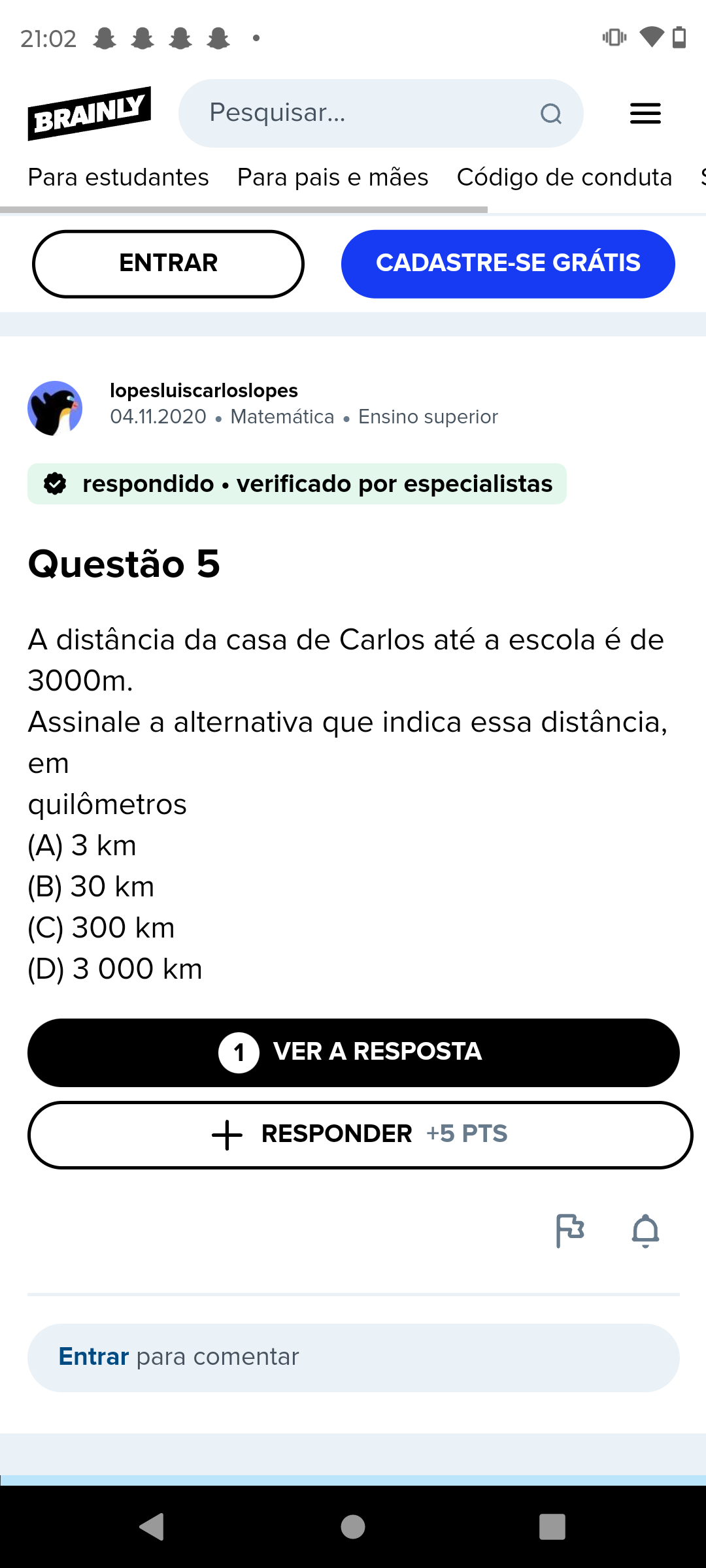 21:02 BRAINLY Pesquisar.. Para estudantes Para pais e mães Código de conduta ENTRAR CADASTRE-SE GRÁTIS lopesluiscarloslopes 04.11.2020 Matemática Ensino superior respondido verificado por especialistas Questão 5 A distância da casa de Carlos até a escola é de 3000m. Assinale a alternativa que indica essa distância, em quilômetros (A) 3 km (B) 30 km (C) 300 km (D) 3 000 km 1 VER A RESPOSTA + RESPONDER +5 PTS FB Entrar para comentar