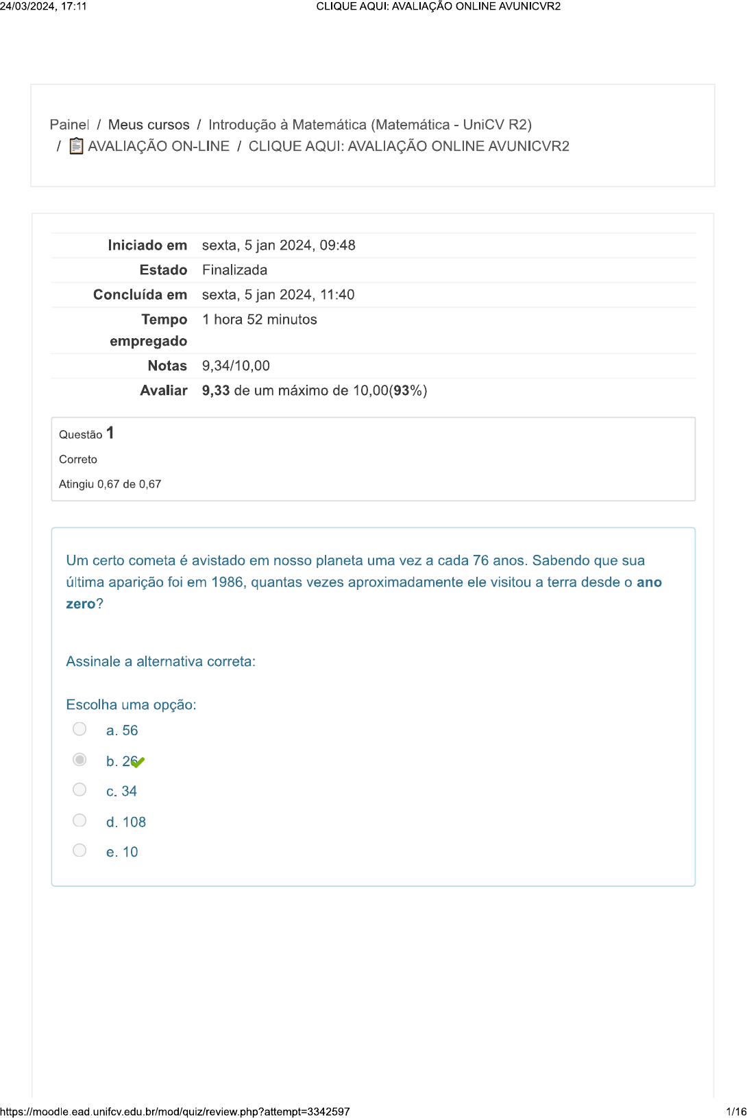 24/03/2024, 17:11 CLIQUE AQUI: AVALIAÇÃO ONLINE AVUNICVR2 Painel / Meus cursos / Introdução à Matemática (Matemática - UniCV R2) / AVALIAÇÃO ON-LINE / CLIQUE AQUI: AVALIAÇÃO ONLINE AVUNICVR2 Iniciado em sexta, 5 jan 2024, 09:48 Estado Finalizada Concluída em sexta, 5 jan 2024, 11:40 Tempo 1 hora 52 minutos empregado Notas 9,34/10,00 Avaliar 9,33 de um máximo de 10,00(93%) Questão 1 Correto Atingiu 0,67 de 0,67 Um certo cometa é avistado em nosso planeta uma vez a cada 76 anos. Sabendo que sua última aparição foi em 1986, quantas vezes aproximadamente ele visitou a terra desde o ano zero? Assinale a alternativa correta: Escolha uma opção: a. 56 b. 26 C. 34 d. 108 e. 10 https://moodle.ead.unifcv.edu.br/mod/quiz/review.php?attempt=3342597 1/1624/03/2024, 17:11 CLIQUE AQUI: AVALIAÇÃO ONLINE AVUNICVR2 Questão 2 Correto Atingiu 0,67 de 0,67 Em uma Progressão Aritmética (PA) de 15 termos, o primeiro vale -2 e o último 96. Qual é a razão dessa progressão? Assinale a alternativa correta Escolha uma opção: a. b. 4 C. 3 d. 5 e. 6 https://moodle.ead.unifcv.edu.br/mod/quiz/review.php?attempt=3342597 2/1624/03/2024, 17:11 CLIQUE AQUI: AVALIAÇÃO ONLINE AVUNICVR2 Questão 3 Correto Atingiu 0,67 de 0,67 A comparação entre as progressões é muito comum, e as diferenças estão na definição de cada uma Os termos de uma progressão geométrica crescente aumentam muito mais rápido que os termos de uma progressão aritmética. Mediante o exposto, faça a associação das colunas onde consideramos: (1) Progressão Aritmética (2) Progressão Geométrica I. de um termo para o outro, a diferença sempre é igual à razão. ( ) II. a divisão do termo pelo seu antecessor sempre vai ser igual à razão. ( ) III. a partir do primeiro termo, a razão q é multiplicada pelo primeiro termo para gerar o segundo termo. ( ) IV. a partir do primeiro termo, existe uma razão r que é somada ao primeiro termo para gerar o segundo Assinale a alternativa que apresenta a sequência correta: Escolha uma opção: a. 2-1-1-2 b. 1-1-2-2 C. 2-2-1-1 d. e. 1-2-1-2 https://moodle.ead.unifcv.edu.br/mod/quiz/review.php?attempt=3342597 3/1624/03/2024, 17:11 CLIQUE AQUI: AVALIAÇÃO ONLINE AVUNICVR2 Questão 4 Correto Atingiu 0,67 de 0,67 É muito comum trabalharmos com sequências numéricas, ainda que consigamos prever os próximos termos, nem sempre a sequência pode ser classificada como uma progressão aritmética. Mediante o exposto, avalie as afirmativas abaixo como exemplos de Progressão aritmética. I. II. III. IV. (8,2,-4,-9....) Assinale a alternativa correta. Escolha uma opção: a. Apenas II, III e IV estão corretas. b. Apenas IV está correta. C. Apenas e III estão corretas. d. Apenas I e estão corretas. e. Apenas I está correta https://moodle.ead.unifcv.edu.br/mod/quiz/review.php?attempt=3342597 4/1624/03/2024, 17:11 CLIQUE AQUI: AVALIAÇÃO ONLINE AVUNICVR2 Questão 5 Correto Atingiu 0,67 de 0,67 Mediante os conteúdos abordados em nosso material sobre Progressões aritméticas, avalie a problemática a seguir: Uma criança resolveu poupar para comprar um brinquedo. Com a ajuda de seu pai, começou depositando uma moeda de R$ 1,00 em seu cofrinho. A cada dia que passava, aumentava um real no valor depositado no dia anterior, ou seja, se no primeiro dia ele depositou R$1,00, no segundo dia ele depositou R$ 2,00 (R$1,00 + R$1,00), no terceiro dia ele depositou R$3,00 (R$2,00 + R$1,00), e assim Após fazer isso durante 30 dias, quanto ela conseguiu economizar? Assinale a alternativa correta: Escolha uma opção: a. 465 b. 355 C. 455 d. 445 e. 300 https://moodle.ead.unifcv.edu.br/mod/quiz/review.php?attempt=3342597 5/1624/03/2024, 17:11 CLIQUE AQUI: AVALIAÇÃO ONLINE AVUNICVR2 Questão 6 Correto Atingiu 0,68 de 0,68 Embasado em nosso material, avalie a seguinte situação hipotética: Qual o valor de x se = 125? Assinale a alternativa correta: Escolha uma opção: a. 0 b. 1 C. 3 d. 2 e. -3 https://moodle.ead.unifcv.edu.br/mod/quiz/review.php?attempt=3342597 6/1624/03/2024, 17:11 CLIQUE AQUI: AVALIAÇÃO ONLINE AVUNICVR2 Questão 7 Correto Atingiu 0,67 de 0,67 Utilizando algumas ferramentas gráficas, como o diagrama de Venn-Euler, é possível fazer operações com conjuntos. De acordo com nosso material, avalie as afirmativas a seguir sobre quais são as principais operações entre os conjuntos: Julgue Verdadeiro (V) ou Falso (F): ( ) I. Intersecção de conjuntos ( ) II. Diferença entre conjuntos ( ) III. Formulação de um conjunto ( ) IV. Complementar de um conjunto ( ) V. União (ou reunião) de conjuntos Assinale a alternativa que apresenta a sequência correta: Escolha uma opção: a. V-V-F-V-V b. F-V-V-V-F C. V-F-F-V-V d. V-V-V-V-F e. V-F-V-F-V https://moodle.ead.unifcv.edu.br/mod/quiz/review.php?attempt=3342597 7/1624/03/2024, 17:11 CLIQUE AQUI: AVALIAÇÃO ONLINE AVUNICVR2 Questão 8 Correto Atingiu 0,67 de 0,67 Conforme os assuntos abordados sobre Raízes e Funções, considere a função - , qual dos valores a seguir é raiz da função apresentada? Assinale a alternativa correta: Escolha uma opção: a. -9 b. 9 C. -6 d. 6 e. https://moodle.ead.unifcv.edu.br/mod/quiz/review.php?attempt=3342597 8/1624/03/2024, 17:11 CLIQUE AQUI: AVALIAÇÃO ONLINE AVUNICVR2 Questão 9 Correto Atingiu 0,67 de 0,67 Mediante os conteúdos abordados em nosso material, sobre o tema Conjunto das Partes de um Conjunto, analisaremos o exemplo a seguir: Em uma pesquisa sobre determinados produtos, foram apontados os seguintes resultados: - 20 pessoas confiam no produto A; - 30 pessoas confiam no produto B; - 10 pessoas dizem confiar em ambos; - 5 pessoas dizem confiar em nenhum produto. Mediante o exposto, quantas pessoas foram entrevistadas? Assinale a alternativa correta: Escolha uma opção: a. 50 b. 45 C. 55 d. 35 e. 40 https://moodle.ead.unifcv.edu.br/mod/quiz/review.php?attempt=3342597 9/1624/03/2024, 17:11 CLIQUE AQUI: AVALIAÇÃO ONLINE AVUNICVR2 Questão 10 Correto Atingiu 0,67 de 0,67 