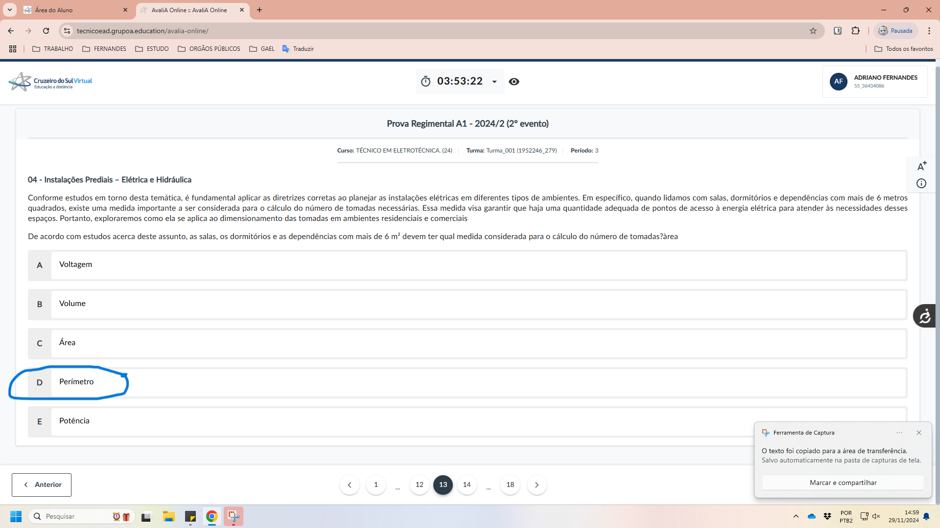Área do Aluno x AvaliA Online AvaliA Online + Pausada TRABALHO FERNANDES ESTUDO ORGÃOS PÚBLICOS GAEL Traduzir Todos os favoritos Cruzeiro do 03:53:22 ADRIANO FERNANDES AF Educação distância 55 36434086 Prova Regimental A1 - 2024/2 (2° evento) Curso: TÉCNICO EM (24) Turma: Turma_001 (1952246_279) Período: 3 A+ 04 - Instalações Prediais - Elétrica e Hidráulica i Conforme estudos em torno desta temática, é fundamental aplicar as diretrizes corretas ao planejar as instalações elétricas em diferentes tipos de ambientes. Em específico, quando lidamos com salas, dormitórios e dependências com mais de 6 metros quadrados, existe uma medida importante a ser considerada para o cálculo do de tomadas necessárias. Essa medida visa garantir que haja uma quantidade adequada de pontos de acesso à energia elétrica para atender às necessidades desses espaços. Portanto, exploraremos como ela se aplica ao dimensionamento das tomadas em ambientes residenciais e comerciais De acordo com estudos acerca deste assunto, as salas, os dormitórios e as dependências com mais de 6 devem ter qual medida considerada para cálculo do número de tomadas?àrea A Voltagem B Volume Área D Perímetro E Potência Ferramenta de Captura texto foi copiado para a área de transferência. Salvo automaticamente na pasta de capturas de tela. Marcar e compartilhar POR 14:59 Q Pesquisar PTB2 29/11/2024
