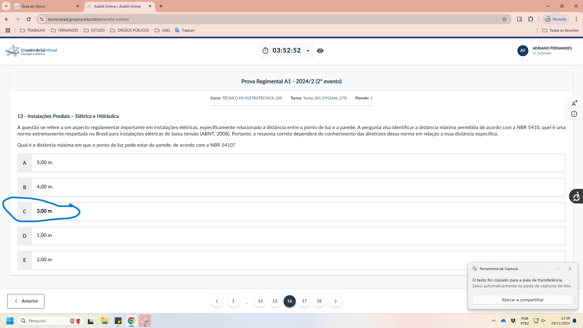 Área do Aluno AvaliA Online : AvaliA Online + tecnicoead.grupoa.education/avalia-online Pausada : TRABALHO FERNANDES ESTUDO ORGÃOS PÚBLICOS GAEL Traduzir Todos os favoritos Cruzeiro do Sul Virtual 03:52:52 ADRIANO FERNANDES AF Educação distância 55 36434086 Prova Regimental A1 - 2024/2 (2° evento) Curso: TÉCNICO EM ELETROTÉCNICA (24) Turma: Turma_001 (1952246_279) Período: 3 A+ i 13 - Instalações Prediais - Elétrica e Hidráulica A questão se refere a um aspecto regulamentar importante em instalações elétricas, especificamente relacionado à distância entre o ponto de luz e a parede. A pergunta visa identificar a distância máxima permitida de acordo com a NBR 5410, quel é uma norma extremamente respeitada no Brasil para instalações elétricas de baixa tensão (ABNT, 2008). Portanto, a resposta correta dependerá do conhecimento das diretrizes dessa norma em relação a essa distância específica. Qual é a distância máxima em que ponto de luz pode estar da parede, de acordo com a NBR 5410? A 5,00 m. B 4,00 m. C 3,00 m. D 1,00 m E 2,00 m Ferramenta de Captura o texto foi copiado para a área de transferência. Salvo automaticamente na pasta de capturas de Anterior Marcar e compartilhar POR 14:59 Q Pesquisar PTB2 29/11/2024