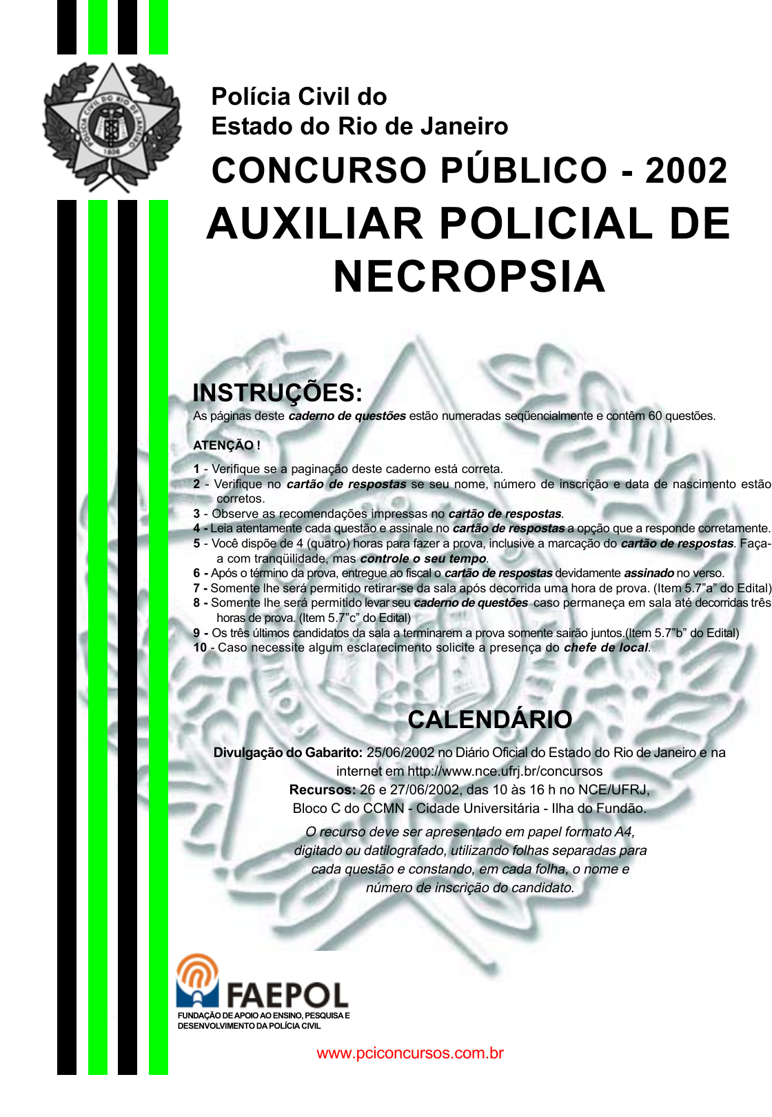 pcimarkpci MDAwMDowMDAwOjAwMDA6MDAwMDowMDAwOmZmZmY6ZDEwZTo0NDc2:U2F0LCAzMCBOb3YgMjAyNCAwNTozMTowNSAtMDMwMA== www.pciconcursos.com.br Polícia Civil do Estado do Rio de Janeiro CONCURSO PÚBLICO - 2002 FUNDAÇÃO DE APOIO AO ENSINO, PESQUISA E DESENVOLVIMENTO DA POLÍCIA CIVIL AUXILIAR POLICIAL DE NECROPSIA CALENDÁRIO Divulgação do Gabarito: 25/06/2002 no Diário Oficial do Estado do Rio de Janeiro e na internet em http://www.nce.ufrj.br/concursos Recursos: 26 e 27/06/2002, das 10 às 16 h no NCE/UFRJ, Bloco C do CCMN - Cidade Universitária - Ilha do Fundão. As páginas deste caderno de questões estão numeradas seqüencialmente e contêm 60 questões. ATENÇÃO ! 1 - Verifique se a paginação deste caderno está correta. 2 - Verifique no cartão de respostas se seu nome, número de inscrição e data de nascimento estão corretos. 3 - Observe as recomendações impressas no cartão de respostas. 4 - Leia atentamente cada questão e assinale no cartão de respostas a opção que a responde corretamente. 5 - Você dispõe de 4 (quatro) horas para fazer a prova, inclusive a marcação do cartão de respostas. Faça- a com tranqüilidade, mas controle o seu tempo. 6 - Após o término da prova, entregue ao fiscal o cartão de respostas devidamente assinado no verso. 7 - Somente lhe será permitido retirar-se da sala após decorrida uma hora de prova. (Item 5.7”a” do Edital) 8 - Somente lhe será permitido levar seu caderno de questões caso permaneça em sala até decorridas três horas de prova. (Item 5.7”c” do Edital) 9 - Os três últimos candidatos da sala a terminarem a prova somente sairão juntos.(Item 5.7”b” do Edital) 10 - Caso necessite algum esclarecimento solicite a presença do chefe de local. INSTRUÇÕES: O recurso deve ser apresentado em papel formato A4, digitado ou datilografado, utilizando folhas separadas para cada questão e constando, em cada folha, o nome e número de inscrição do candidato. www.pciconcursos.com.br pcimarkpci MDAwMDowMDAwOjAwMDA6MDAwMDowMDAwOmZmZmY6ZDEwZTo0NDc2:U2F0LCAzMCBOb3YgMjAyNCAwNTozMTowNSAtMDMwMA== www.pciconcursos.com.br Concurso Público Auxiliar Policial de Necropsia - 2002 2 www.pciconcursos.com.br pcimarkpci MDAwMDowMDAwOjAwMDA6MDAwMDowMDAwOmZmZmY6ZDEwZTo0NDc2:U2F0LCAzMCBOb3YgMjAyNCAwNTozMTowNSAtMDMwMA== www.pciconcursos.com.br Concurso Público Auxiliar Policial de Necropsia - 2002 3 Noções básicas de biologia e anatomia humanas 1- As células possuem em seu interior estruturas que realizam diversas funções fundamentais para a vida, mas para isso elas necessitam de energia. O processo de produção de energia nas células é conhecido como respiração celular e ocorre na organela denominada: a) ribossomo; b) mitocôndria; c) retículo endoplasmático; d) complexo de Golgi; e) lisossomo. 2 - No esquema abaixo, as organelas presentes no citoplasma apresentam-se numeradas. Os processos de armazenamento e secreção de subs- tâncias, fabricação de proteínas e digestão intracelular são realizados, respectivamente, pelas organelas de número: a) 1, 2, e 5; b) 2, 4 e 6; c) 3, 6 e 4; d) 5, 1 e 3; e) 5, 6 e 2. 3 - Ao comparar mitose com meiose, pode-se concluir que: a) a meiose está associada à reprodução de pluricelulares, e a mitose, ao seu crescimento; b) a meiose divide à metade o número de cromossomas de uma célula, e a mitose o duplica; c) a meiose está associada à reprodução de unicelulares, e a mitose, ao seu crescimento; d) a mitose garante o número cromossomial da espécie, e a meiose, o número cromossomial do indivíduo; e) a mitose só acontece em células reprodutoras, e a meiose só em células haplóides. 4 - Os tecidos são conjuntos de células semelhantes na forma e que desempenham o mesmo tipo de função. Sobre os tecidos, analise as afirmativas abaixo: I - O tecido muscular liso é formado por células alongadas e afinadas nas pontas, tem contração voluntária e forma os músculos presos aos ossos. II - O tecido epitelial de revestimento é constituído por células firmemente unidas umas às outras e desem- penha a função de revestir e proteger as superfícies externas do corpo e as cavidades internas dos órgãos. III - O tecido ósseo apresenta substância intercelular calcificada. No entanto, suas células se mantêm vivas pois recebem nutrientes e oxigênio através de vasos sangüíneos localizados em uma rede de canais que passam por dentro do osso. A(s) afirmativa(s) correta(s) é/são somente: a) I; b) III; c) I e II; d) II e III; e) I, II e III. 5 - O tecido encontrado nos tendões e nos ligamentos que unem ossos entre si caracteriza-se por apresentar material intercelular com: a) grande quantidade de fibras colágenas orientadas em uma direção, formando feixes resistentes e de pouca elasticidade; b) pouca quantidade de fibras de colágeno, muito elásticas, orientadas em várias direções, formando feixes resistentes; c) grande quantidade de fibras elásticas que se deformam facilmente, quando sujeitas a forças de tração; d) grande quantidade de células armazenadoras de gordura, formando feixes resistentes e flexíveis; e) pouca quantidade de feixes constituídos de fibras elásticas e de constituição gelatinosa. www.pciconcursos.com.br pcimarkpci MDAwMDowMDAwOjAwMDA6MDAwMDowMDAwOmZmZmY6ZDEwZTo0NDc2:U2F0LCAzMCBOb3YgMjAyNCAwNTozMTowNSAtMDMwMA== www.pciconcursos.com.br Concurso Público Auxiliar Policial de Necropsia - 2002 4 6 - Associe corretamente os elementos figurados do sangue humano apresentados na 1a coluna com todas as afirmativas listadas na 2a coluna: Assinale a opção que apresenta a seqüência numérica correta: a) I, II, II, III, I ; b) I, III, III, I, II ; c) II, III, II, I, I ; d) III, I, I, II, III ; e) III, I, III, II, II . 7- Formando um verdadeiro exército contra os microorganismos causadores de doenças, células especiais do organismo realizam a tarefa de defesa, através da fagocitose e da produção de anticorpos. Como exemplos dessas