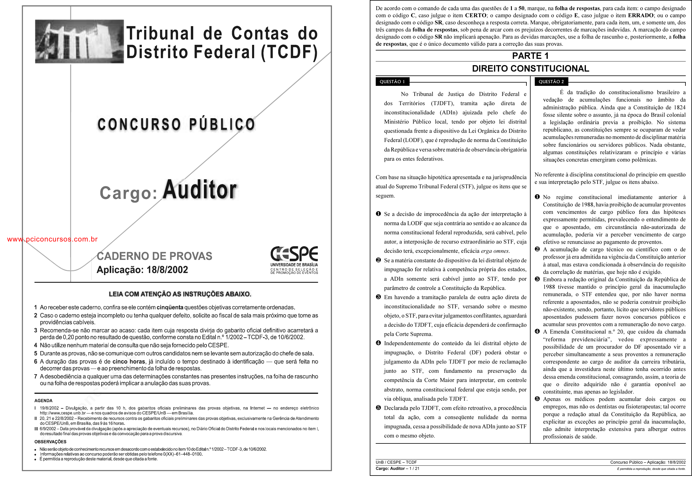 pcimarkpci MDAwMDowMDAwOjAwMDA6MDAwMDowMDAwOmZmZmY6ZDEwZTo0NDc2:U2F0LCAzMCBOb3YgMjAyNCAwNToyNzowNiAtMDMwMA== www.pciconcursos.com.br UnB / CESPE – TCDF Concurso Público – Aplicação: 18/8/2002 Cargo: Auditor – 1 / 21 É permitida a reprodução, desde que citada a fonte. De acordo com o comando de cada uma das questões de 1 a 50, marque, na folha de respostas, para cada item: o campo designado com o código C, caso julgue o item CERTO; o campo designado com o código E, caso julgue o item ERRADO; ou o campo designado com o código SR, caso desconheça a resposta correta. Marque, obrigatoriamente, para cada item, um, e somente um, dos três campos da folha de respostas, sob pena de arcar com os prejuízos decorrentes de marcações indevidas. A marcação do campo designado com o código SR não implicará apenação. Para as devidas marcações, use a folha de rascunho e, posteriormente, a folha de respostas, que é o único documento válido para a correção das suas provas. PARTE 1 DIREITO CONSTITUCIONAL QUESTÃO 1 No Tribunal de Justiça do Distrito Federal e dos Territórios (TJDFT), tramita ação direta de inconstitucionalidade (ADIn) ajuizada pelo chefe do Ministério Público local, tendo por objeto lei distrital questionada frente a dispositivo da Lei Orgânica do Distrito Federal (LODF), que é reprodução de norma da Constituição da República e versa sobre matéria de observância obrigatória para os entes federativos. Com base na situação hipotética apresentada e na jurisprudência atual do Supremo Tribunal Federal (STF), julgue os itens que se seguem. Ø Se a decisão de improcedência da ação der interpretação à norma da LODF que seja contrária ao sentido e ao alcance da norma constitucional federal reproduzida, será cabível, pelo autor, a interposição de recurso extraordinário ao STF, cuja decisão terá, excepcionalmente, eficácia erga omnes. Ù Se a matéria constante do dispositivo da lei distrital objeto de impugnação for relativa à competência própria dos estados, a ADIn somente será cabível junto ao STF, tendo por parâmetro de controle a Constituição da República. Ú Em havendo a tramitação paralela de outra ação direta de inconstitucionalidade no STF, versando sobre o mesmo objeto, o STF, para evitar julgamentos conflitantes, aguardará a decisão do TJDFT, cuja eficácia dependerá de confirmação pela Corte Suprema. Û Independentemente do conteúdo da lei distrital objeto de impugnação, o Distrito Federal (DF) poderá obstar o julgamento da ADIn pelo TJDFT por meio de reclamação junto ao STF, com fundamento na preservação da competência da Corte Maior para interpretar, em controle abstrato, norma constitucional federal que esteja sendo, por via oblíqua, analisada pelo TJDFT. Ü Declarada pelo TJDFT, com efeito retroativo, a procedência total da ação, com a conseqüente nulidade da norma impugnada, cessa a possibilidade de nova ADIn junto ao STF com o mesmo objeto. QUESTÃO 2 É da tradição do constitucionalismo brasileiro a vedação de acumulações funcionais no âmbito da administração pública. Ainda que a Constituição de 1824 fosse silente sobre o assunto, já na época do Brasil colonial a legislação ordinária previa a proibição. No sistema republicano, as constituições sempre se ocuparam de vedar acumulações remuneradas no momento de disciplinar matéria sobre funcionários ou servidores públicos. Nada obstante, algumas constituições relativizaram o princípio e várias situações concretas emergiram como polêmicas. No referente à disciplina constitucional do princípio em questão e sua interpretação pelo STF, julgue os itens abaixo. Ø No regime constitucional imediatamente anterior à Constituição de 1988, havia proibição de acumular proventos com vencimentos de cargo público fora das hipóteses expressamente permitidas, prevalecendo o entendimento de que o aposentado, em circunstância não-autorizada de acumulação, poderia vir a perceber vencimento de cargo efetivo se renunciasse ao pagamento de proventos. Ù A acumulação de cargo técnico ou científico com o de professor já era admitida na vigência da Constituição anterior à atual, mas estava condicionada à observância do requisito da correlação de matérias, que hoje não é exigido. Ú Embora a redação original da Constituição da República de 1988 tivesse mantido o princípio geral da inacumulação remunerada, o STF entendeu que, por não haver norma referente a aposentados, não se poderia construir proibição não-existente, sendo, portanto, lícito que servidores públicos aposentados pudessem fazer novos concursos públicos e acumular seus proventos com a remuneração do novo cargo. Û A Emenda Constitucional n.º 20, que cuidou da chamada “reforma previdenciária”, vedou expressamente a possibilidade de um procurador do DF aposentado vir a perceber simultaneamente a seus proventos a remuneração correspondente ao cargo de auditor da carreira tributária, ainda que a investidura neste último tenha ocorrido antes dessa emenda constitucional, consagrando, assim, a teoria de que o direito adquirido não é garantia oponível ao constituinte, mas apenas ao legislador. Ü Apenas os médicos podem acumular dois cargos ou empregos, mas não os dentistas ou fisioterapeutas; tal ocorre porque a redação atual da Constituição da República, ao explicitar as exceções ao princípio geral da inacumulação, não admite interpretação extensiva para albergar outros profissionais de saúde. www.pciconcursos.com.br pcimarkpci MDAwMDowMDAwOjAwMDA6MDAwMDowMDAwOmZmZmY6ZDEwZTo0NDc2:U2F0LCAzMCBOb3YgMjAyNCAwNToyNzowNiAtMDMwMA== www.pciconcursos.com.br UnB / CESPE – TCDF Concurso Público – Aplicação: 18/8/2002 Cargo: Auditor – 2 / 21 É permitida a reprodução, desde que citada a fonte. QUESTÃO 3 Acerca dos métodos e princípios de interpretação e aplicação das normas constitucionais,