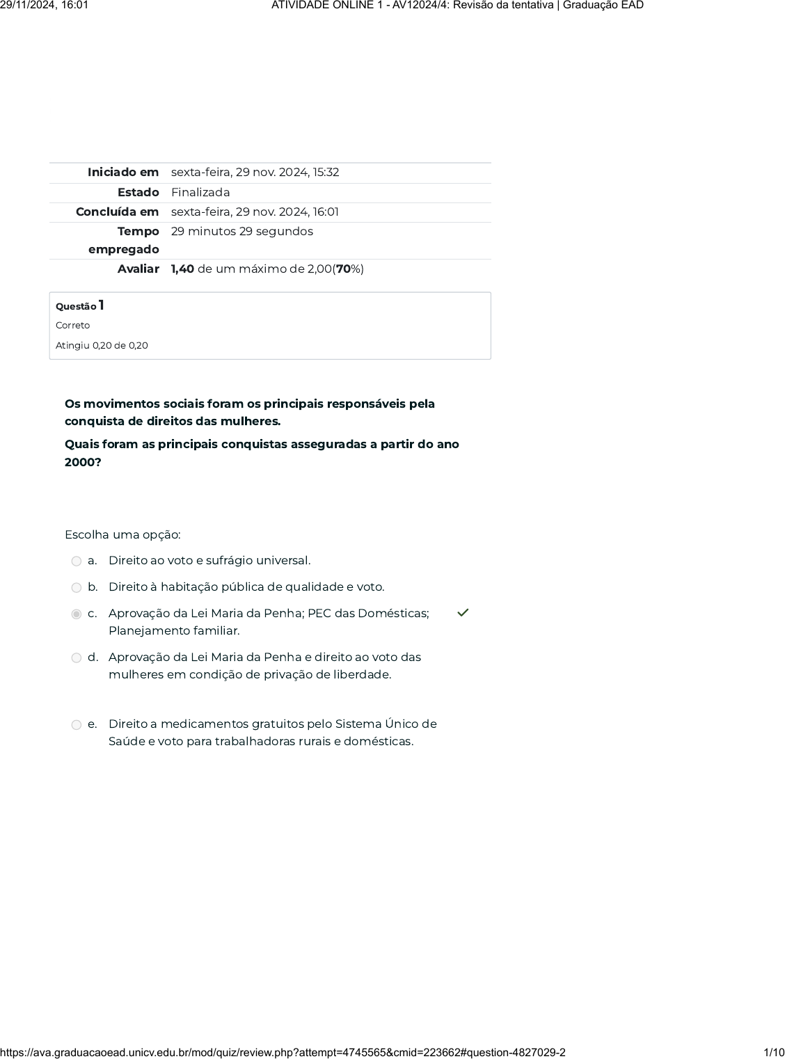 Iniciado em sexta-feira, 29 nov. 2024, 15:32 Estado Finalizada Concluída em sexta-feira, 29 nov. 2024, 16:01 Tempo empregado 29 minutos 29 segundos Avaliar 1,40 de um máximo de 2,00(70%) Questão 1 Correto Atingiu 0,20 de 0,20 Os movimentos sociais foram os principais responsáveis pela conquista de direitos das mulheres. Quais foram as principais conquistas asseguradas a partir do ano 2000? Escolha uma opção: a. Direito ao voto e sufrágio universal. b. Direito à habitação pública de qualidade e voto. c. Aprovação da Lei Maria da Penha; PEC das Domésticas; Planejamento familiar. ✓ d. Aprovação da Lei Maria da Penha e direito ao voto das mulheres em condição de privação de liberdade. e. Direito a medicamentos gratuitos pelo Sistema Único de Saúde e voto para trabalhadoras rurais e domésticas. 29/11/2024, 16:01 ATIVIDADE ONLINE 1 - AV12024/4: Revisão da tentativa | Graduação EAD https://ava.graduacaoead.unicv.edu.br/mod/quiz/review.php?attempt=4745565&cmid=223662#question-4827029-2 1/10 Questão 2 Correto Atingiu 0,20 de 0,20 Muitas conquistas foram asseguradas às mulheres ao longo dos anos, materializando-se em políticas públicas. Qual a importância de sensibilizar funcionários/pro�ssionais para atuar junto a essas políticas? Escolha uma opção: a. Para que sejam representantes da instituição nos movimentos sociais. b. Trata-se de uma forma de aumentar a capacidade técnica, para lidar com essa população em suas especi�cidades, e uma forma de in�uir nas concepções das autoridades e dos pro�ssionais, que atuam com a formulação e na execução de políticas públicas, prevenindo, ainda, situações de discriminação, preconceito e violência institucional. ✓ c. Para que sejam treinados e executem o trabalho junto com equipe multidisciplinar. d. Para que conheçam a política e não se deixem in�uenciar por visões erradas sobre as questões de gênero. e. É uma forma de atuar em consonância com a Política Nacional de Humanização. 29/11/2024, 16:01 ATIVIDADE ONLINE 1 - AV12024/4: Revisão da tentativa | Graduação EAD https://ava.graduacaoead.unicv.edu.br/mod/quiz/review.php?attempt=4745565&cmid=223662#question-4827029-2 2/10 Questão 3 Incorreto Atingiu 0,00 de 0,20 Trabalhos cientí�cos devem ser elaborados de acordo com normas preestabelecidas e com objetivos que se destinam ao que se quer pesquisar, segundo as intenções do pesquisador. Esse é um dos motivos que leva a existência de diferentes tipos de textos cientí�cos, cada um voltado para um propósito especí�co e possuindo características particulares, entre os quais estão a monogra�a e o artigo cientí�co. Qual das características abaixo corresponde a um atributo do artigo cientí�co que o distingue da monogra�a? Escolha uma opção: a. É produzido com o propósito de promover o desconhecimento. b. Visa oportunizar novas descobertas ou aprofundar um assunto já conhecido. × c. Visa abordar, da maneira mais completa possível, um determinado assunto. d. Não possui compromisso com a veracidade dos fatos que relata. e. Visa estudar, profundamente, um aspecto especí�co de um determinado assunto. 29/11/2024, 16:01 ATIVIDADE ONLINE 1 - AV12024/4: Revisão da tentativa | Graduação EAD https://ava.graduacaoead.unicv.edu.br/mod/quiz/review.php?attempt=4745565&cmid=223662#question-4827029-2 3/10 Questão 4 Incorreto Atingiu 0,00 de 0,20 As questões de gênero e as diferenças existentes entre homens e mulheres têm sido muito discutidas nos dias atuais. Quando se fala em criar condições para modi�car a condição da mulher na sociedade a que se está referindo? Escolha uma opção: a. À possibilidade de criar condições para discutir a importância da mulher nos dias atuais. b. À tentativa de assegurar a universalidade dos direitos sociais, de modo que as mulheres tenham acesso a benefícios, programas e projetos. c. À incorporação do princípio da igualdade, de forma que homens e mulheres sejam considerados iguais perante a lei e a sociedade. d. À importância de assegurar o princípio da equidade, de modo que suas necessidades sejam atingidas e as desvantagens neutralizadas. e. À possibilidade de proporcionar condições iguais no que se refere a trabalho e renda, principais diferenças existentes entre homens e mulheres. × 29/11/2024, 16:01 ATIVIDADE ONLINE 1 - AV12024/4: Revisão da tentativa | Graduação EAD https://ava.graduacaoead.unicv.edu.br/mod/quiz/review.php?attempt=4745565&cmid=223662#question-4827029-2 4/10 Questão 5 Correto Atingiu 0,20 de 0,20 Entre os diferentes tipos de textos cientí�cos está também a tese, que corresponde a um dos tipos de trabalhos cientí�cos integrantes do universo acadêmico. Qual das alternativas abaixo corresponde a uma característica da tese? Escolha uma opção: a. Não deve oferecer um avanço, solidamente construído, no conhecimento à disposição da humanidade. b. Deve ser escrito em uma linguagem neutra, sóbria, sem vieses. c. Sua elaboração é requisito para a obtenção do título de mestre. d. Sua produção requer a apresentação de um novo conhecimento antes não existente. ✓ e. É um dos tipos de trabalho cientí�co produzido em cursos de graduação e especialização. 29/11/2024, 16:01 ATIVIDADE ONLINE 1 - AV12024/4: Revisão da tentativa | Graduação EAD https://ava.graduacaoead.unicv.edu.br/mod/quiz/review.php?attempt=4745565&cmid=223662#question-4827029-2 5/10 Questão 6 Correto Atingiu 0,20 de 0,20 Marque a alternativa correta com relação à apresentação grá�ca de um trabalho acadêmico. Escolha uma opção: a. Os textos devem ser digitados em cor azul, em papel branco ou de cor parda, no formato A4 (21 cm X 29,7 cm), podendo utilizar outras cores somente para as ilustrações. b. Os textos devem ser digitados na cor preta, em papel branco ou reciclado, no formato A4 (21 cm X 29,7 cm), podendo utilizar outras cores somente para as ilustrações. ✓ c. O