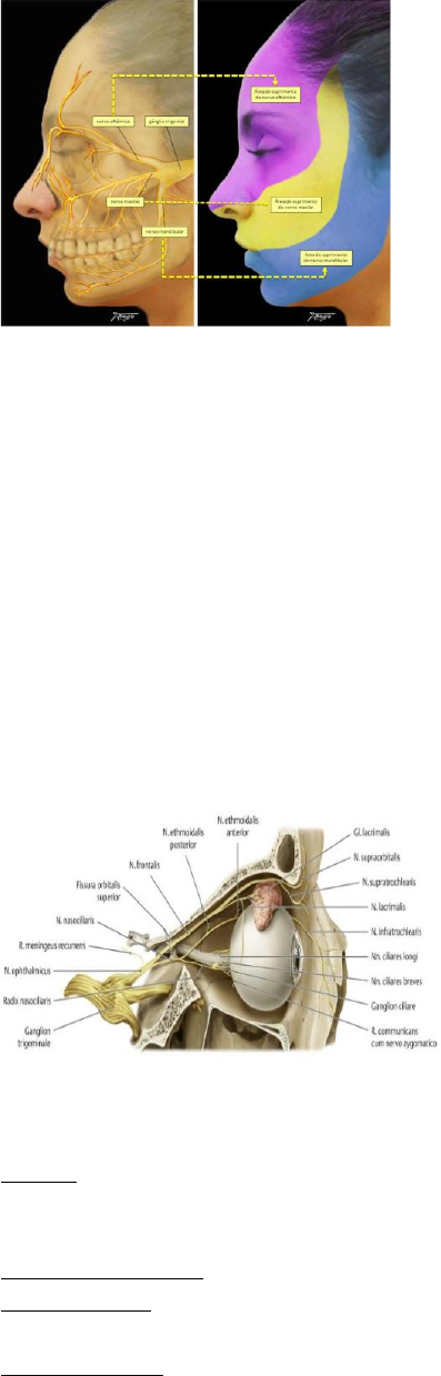 Resumo de CBMF • (1 semestre) Nervo do trigêmeo O nervo do trigêmeo é conhecido por ser o quinto par de nervo do crânio, recebe esse nome por possuir três calibrosos ramos pelo qual é formado. A maior parte desses ramos nervosos são formados pela porção sensitiva, (porção sensitiva As fibras extereoceptivas: cavidade bucal, face, cavidade nasal, seios maxilar e globo ocular. Fibras propioceptivas: ATM, dentes, periodonto de sustentação, músculos da mastigação e palato duro). onde cada ramo sensitivo recebe o nome da parte em qual está distribuído (na maioria das vezes). 5 par do nervo craniano 3 ramos de nervos calibrosos V1- nervo oftálmico V2- nervo maxilar V3- nervo mandibular Uma parte menor do nervo do trigêmeo é motor. (porção motora: músculos da mastigação) sendo que esta mesma porção está distribuída ao longo do eixo do nervo mandibular, tornando desta maneira o nervo do trigêmeo classificado como um nervo misto, ou seja, portador de fibras nervosas sensitivas ou aferentes e motoras ou eferentes. A maioria dos neurônios que são sensitivos ficam agrupados na estrutura em que se pode observar a divisão do nervo trigêmeo em seus três ramos, esta parte se chama gânglio terminal. Esta estrutura se encontra dentro do crânio, apoiado sobre uma rasa depressão localizada na porção apical da parte petrosa do osso temporal chamado de impressão trigeminal. V1- Nervo Oftálmico Está é a primeira divisão do nervo do trigêmeo. Ele avança via fissura orbital superior e divide-se em três principais ramos: nervo nasociliar, nervo frontal e nervo lacrimal. Não é tão ligado com a prática odontológica por estar mais voltado ao oftálmico. Áreas de inervação do nervo oftálmico Ramos (fissura orbital superior) Nervo nasociliar (medial) Nervo frontal (intermediário) Nervo lacrimal (lateral) Lacrimal Ramos: Ramo palpebral Áreas de inervação: Nervo lacrimal Glândula lacrimal Ramo palpebral Conjuntiva e pele da pálpebra superior na extremidade lateral Frontal Ramos: Nervo supraorbital Nervo supratroclear Áreas de inervação: Nervo supraorbital Conjuntiva e pele da pálpebra superior porção média e pele da fronte até próximo a sutura lambóide. Nervo supratroclear Conjuntiva e pele da pálpebra superior porção média para medial, e pele da fronte. Nasociliar Ramos: Nervos nasociliar curtos e longos Nervo infratroclear Nervo etmoidal posterior Nervo etmoidal anterior -Nervo nasal medial interno -Nervo nasal lateral interno -Nervo nasal externo Áreas de inervação: Nervo nasociliar curto e longo Inervação sensitiva para córnea e inervação simpática e parassimpática para músculos ciliares da íris. Nervo infratroclear Conjuntiva e pele da pálpebra superior porção medial, carúncula e saco lacrimal Nervo etmoidal Seio etmoidal V2- Nervo Maxilar Está é a segunda divisão do nervo do trigêmeo e essencialmente sensitivo. Ele deixa a cavidade Craniana via (pelo) forame redondo e distribui-se em vários ramos. Ramos: Nervo infra-orbital Nervo alveolar superior anterior Nervo alveolar superior posterior Nervo palatino maior Nervo nasopalatino Zigomático Zigomático Nervo zigomático temporal Nervo zigomático facial Ramo comunicante (nervo lacrimal) Nervo maxilar V2 Ramos alveolares: Nervo alveolar superior médio Nervo alveolar superior anterior Nervo alveolar superior posterior (ASP) Áreas de inervação: Dentes: molares superiores com exceção da raiz mesiovestibular do primeiro molar superior. Osso: tábua vestibular e palatina dessa região Mucosa: gengival e alveolar de molares e pré-molares e mucosa da região posterior do seio maxilar (mucosa jugal). Nervo alveolar superior médio (ASM) Dentes: raiz mésio-vestibular do primeiro molar superior e pré-molares superiores. Osso: tabúa vestibular e palatina dessa região Mucosa: gengival e alveolar mucosa do seio maxilar da região de pré molares. Nervo alveolar superior anterior (ASA) Dentes: dentes anteriores (canino e incisivos). Osso: tábua vestibular e palatina dessa região Mucosa: gengival e alveolar mucosa do sio maxilar da região anterior. Nervo infra-orbital Ramos terminais: Palpebral inferior Nasal lateral Labial superior Áreas de inervação: Ramo palpebral inferior: Mucosa e pele dessa região Ramo nasal lateral: Pele e mucosa dessa região Ramo labial superior: Pele e mucosa do lábio superior, vermelhão do lábio superior, mucosa gengival e alveolar de pré-molares, caninos e incisivos. Nervo nasopalatino Áreas de inervação: Mucosa do septo nasal Mucosa da região anterior do palato duro (processo palatino e alveolar) Dentes 11 e 21 Nervo palatino Ele é dividido em: Nervo palatino maior Nervo palatino menor Áreas de inervação: -Nervo palatino maior: Mucosa do processo palatino e alveolar da maxila, desde a região de canino até o limite anterior do véu palatino- 2/3 posteriores do palato duro. -Nervo palatino menor: Mucosa do palato mole e úvula V3- Nervo Mandibular Este é classificado como nervo misto pois apresenta componentes sensitivos e algumas fibras motoras. Este nervo deixa a fossa do crânio através do forame oval e emite seus ramos principais, como: Ramos motores Nervo massetérico Nervo temporal profundo anterior e posterior Nervo pterigoideo medial dividido em: -Tensor do tímpano -Tensor do véu palatino Nervo pterigoide lateral -Nervo milo-hióideo Ramos sensitivos Nervo bucal Nervo lingual Nervo alveolar inferior dividido em: -Nervo milo-hiódeo -Nervo mentoniano Nervo incisivo Nervo auriculotemporal dividido em ramo meníngeo. Nervo alveolar inferior Ramos do alveolar inferior: -Mentoniano Tecido mole: pele do mento, mucosa do lábio inferior, vermelhidão do lábio inferior, mucosa gengival e alveolar vestibular de pré molares e incisivo central inferior por vestibular. -Incisivo Dentes: polpa e periodonto de pré-molares, caninos e incisivos Osso: tábua vestibular e lingual da região de pré-molares, caninos e incisiv