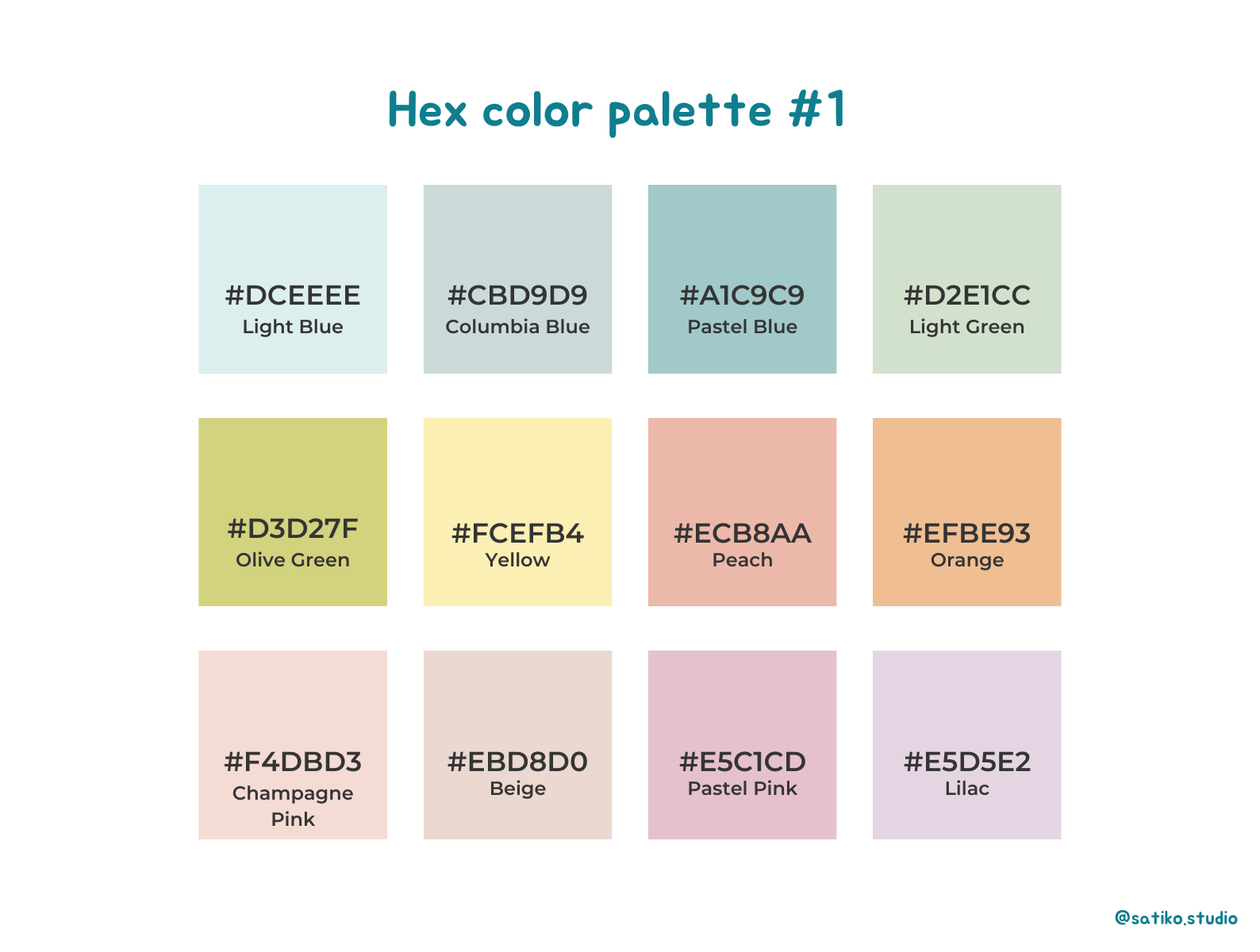 Hex color palette #1 #DCEEEE #CBD9D9 #A1C9C9 #D2E1CC Light Blue Columbia Blue Pastel Blue Light Green #D3D27F #FCEFB4 #ECB8AA #EFBE93 Olive Green Yellow Peach Orange #F4DBD3 #E5C1CD #E5D5E2 Champagne Beige Pastel Pink Lilac Pink @satiko.studio