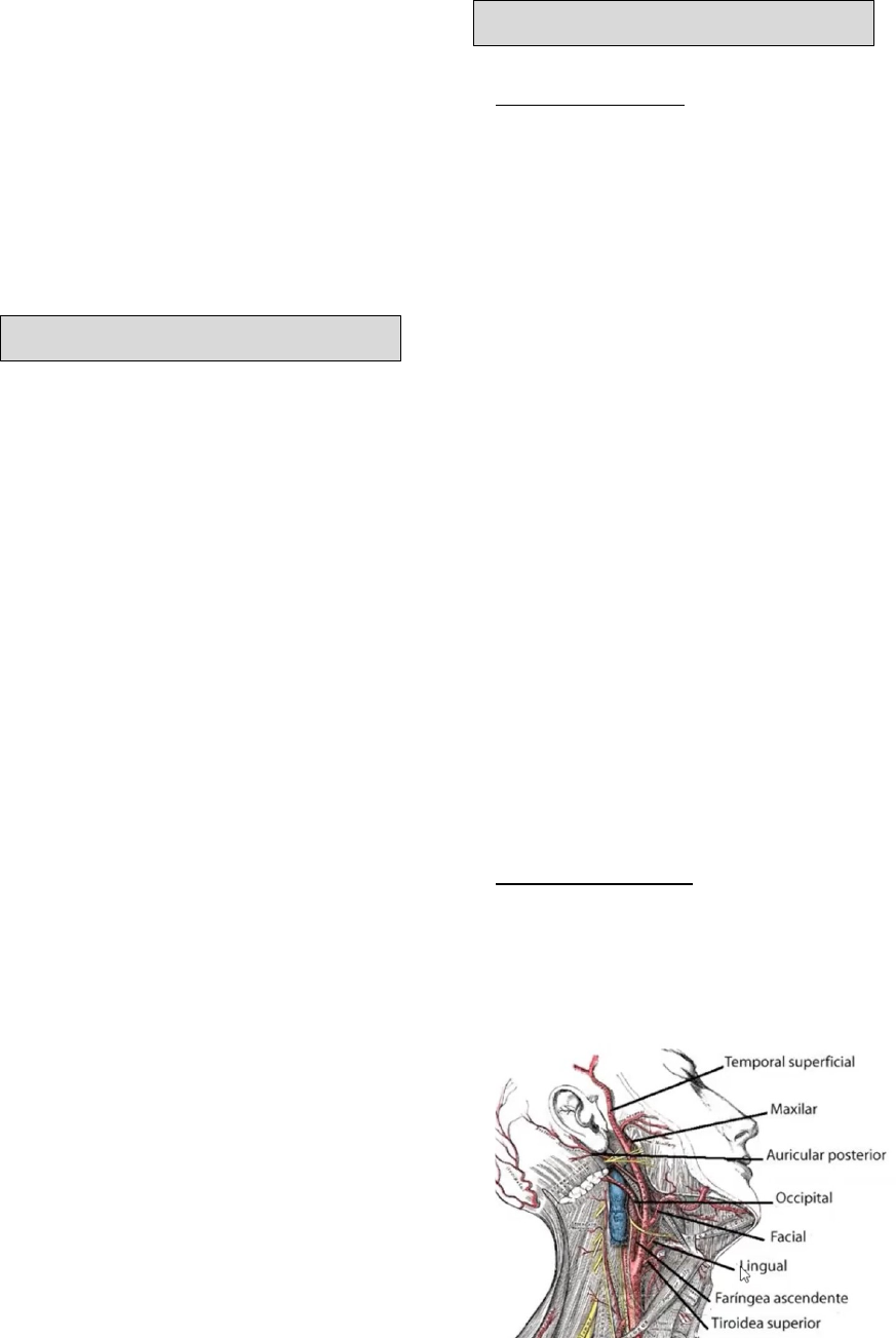Resumo Cirurgia e Traumatologia Buco-Maxilo-Facial @prer1buco Angiologia Irrigação da Artéria da Face A irrigação da face se inicia pelo sistema da Artéria Aorta, um vaso muito calibroso que se origina no ventrículo esquerdo do Coração e termina por inúmeras ramificações em todo o organismo. Arco da Aorta O Arco da Aorta possui três volumosos ramos em direção ascendente, sendo eles da direita para a esquerda: · Tronco Arterial Braquiocefálico Direito (Na altura da face posterior da articulação externoclavicular direita) · Artéria Carótida Comum Esquerda: · Artéria Subclávia Esquerda A artéria carótida direita e a artéria subclávia direita são ramos vindos do tronco braquiocefálico, já a artéria carótida esquerda e a artéria subclávia esquerda são ramos diretos do arco da aorta. Ambas as artérias carótidas comuns terminam na altura da margem superior da cartilagem tireóidea por meio de 2 ramos: · Artéria Carótida Externa · Artéria Carótida Interna · Artéria Carotida Carótida Interna A interna estende-se até o processo clinóide anterior do esfenoide, se divide em quatro ramos terminais irrigando a maior parte do encéfalo. São eles: · Artéria Cerebral Medial · Artéria Cerebral Anterior · Artéria Comunicante Posterior · Artéria Corióidea E dois ramos colaterais: · Artéria Oftálmica (irriga órbita, bulbo do olho e anexos) · Artéria Carótida Timpânica (irriga cavidade timpânica) Carótida Externa Já a carótida externa estende-se até o colo da mandíbula, onde divide-se em seus ramos: Colaterais: Anteriores · Artéria Tireóidea Superior (Glândula tireóidea e laringe) · A. Lingual (Artéria profunda da língua para os músculos da língua Ramos dorsais da língua para o 1/3 posterior do dorso lingual Artéria sublingual para o soalho da boca e a glândula sublingual Ramo supra-hióideo para a região supra-hióidea) · A. Facial (Ramos glandulares para a glândula submandibular Artéria submentoniana para os músculos miloióideo e ventre anterior do digástrico A. sublabial para o músculo do lábio inferior A. labial inferior e superior os lábios inferior e superior A. angular para o ângulo medial do olho) Posteriores · Artéria Occipital (A artéria occipital irriga a região occipital, o músculo ventre posterior do digástrico, o estilomastóide e o esternocleidomastóide) · Artéria Auricular Posterior (Orelha externa e glândula parótida) Medial · Artéria Faríngea Ascendente (A artéria faríngea Ascendente irriga região da faringe) Terminais · Artéria Temporal Superficial · Artéria Maxilar Ramificações Terminais da Carótida Externa Artéria Temporal Superficial A artéria temporal superficial emite alguns ramos superficiais importantes. · Artéria Transversa da Face (Parótida e seu ducto) · Ramo Frontal (Regiões frontal e temporal) · Ramo Parietal (Regiões parietal e temporal) Artéria Maxilar A artéria maxilar possui ramos colaterais e um terminal: Parte Zigomática Artérias Colaterais Ascendentes · Artéria Auricular Profunda · A. Timpânica Anterior (Mucosa da cavidade timpânica) · A. Meníngea Média (Dura-máter e Osso) · A. Meníngea Acessória (Gânglio Trigeminal, Dura-máter da parede lateral do seio cavernoso) Artérias Colaterais Descendentes · A. Alveolar Inferior (Dentes inferiores, processo alveolar, mentoniano, periodonto, gengiva e músculo miloióideo) Parte Pterigóidea Artérias Colaterais Ascendentes · Artérias Temporais profundas Anterior e Posterior (Músculo Temporal) · Ramos Pterigóideos (Músculo Pterigóideo Lateral) Artérias Colaterais Descendentes · A. Massetérica (Músculo Masseter) · Ramos Pterigóideos (Músculo Pterigóideo Medial) · A. Bucal (Bochecha e músculo Bucinador) Parte Pterigopalatina Artérias Colaterais Anteriores · A. Alveolar Superior (Molares e pré-molares superiores, processo alveolar, gengiva e periodonto) · A. Infraorbital (Tecido mole do 1/3 médio facial, glândula lacrimal, músculos oculares inferiores, pálpebra inferiores e periósteo da órbita, incisivos e caninos, periodonto, parede anterior e soalho do seio maxilar Artérias Colaterais Posteriores · A. do Canal Pterigoideo (Faringe e tuba auditiva) · Ramo Faríngeo (Mucosa da parede superior da laringe) Artérias Colaterais Descendentes 1. A. Palatina Descendente (Cavidade nasal, palato duro e mole) Artéria Terminal 2. Artéria Esfenopalatina (Cavidade Nasal – Ramos nasais e ramos septais) Angiologia Drenagem Venosa da Face O sangue que as artérias conduzem à cabeça e ao pescoço tem seu retorno garantido pela drenagem de uma série de vasos que se classificam em: 1. Seios da Dura-Máter 2. Veias Cerebrais e Cerebelares 3. Veias Diplóicas 4. Veias Emissárias 5. Veias do Couro Cabeludo 6. Sistema Venoso Vertebral 7. Veias Superficiais e profundas da cabeça e pescoço 8. Veia Jugular Interna e Externa 9. Tronco Braquiocefálico 10. Veia Cava Superior 11. Coração (Átrio direito) 12. Seios Venosos da Dura-Máter Na parte interna do crânio a drenagem venosa acontece por meio dos seios venosos da dura-máter. Estes seios são condutos de sangue venoso que existe entre as lâminas da Dura-Máter. É entender que todo o sangue drenado sairá pela veia jugular externa, mas também é interessante saber que essas veias possuem ligações importantes (anastomoses) com as veias externas da face para entender sobre a disseminação que pode ocorrer quando infecções são atingem a face. Os seios da Dura-máter são: Vista Sagital · Seio Sagital Superior · Seio Sagital Inferior · Seio Reto · Seio Occipital Vista Axial · Seio Transverso · Seio Sigmóide · Seio Marginal (Margeia Forame Magno) · Plexo Basilar · Seio Petroso Inferior · Seio Petroso Maior · Seio Cavernoso · Seio Intercavernoso (Circunda Glândula Pituitária) · Seio Esfenoparietal 13. Veias Sup e Profunda da Face As veias superficiais da face são condutos que drenam sangue venoso d