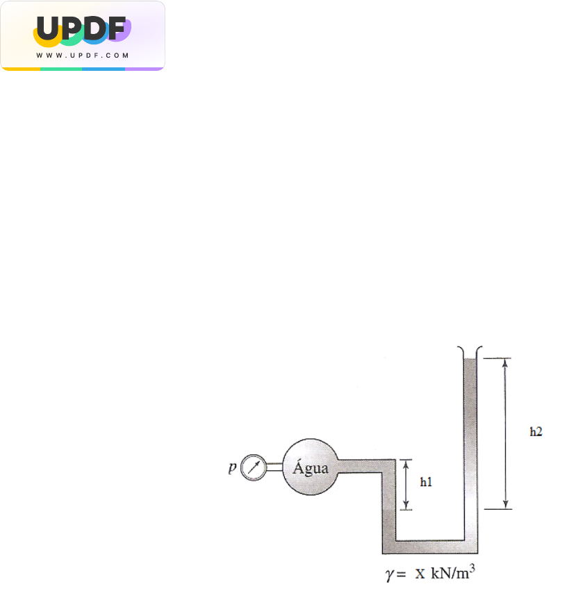 UNIVERSIDADE FEDERAL DO CEARÁ CENTRO DE TECNOLOGIA DEPARTAMENTO DE ENGENHARIA HIDRÁULICA E AMBIENTAL MECÂNICA DOS FLUIDOS – TD0978 – TURMA 01 TRABALHO 4 1) Estime a pressão p (relativa), em kPa, na tubulação de água mostrada na figura a seguir. O manômetro está aberto para a atmosfera. (valor: 1,0) Considere as seguintes observações: i. Valor do X, em kN/m3: número de caracteres do nome completo do aluno, incluindo os espaços, dividido por 1,5; ii. Dados: h1 = 10,0 cm, : h2 = 25,0 cm, ρágua = 103 kg/m3; g = 9,81 m/s2; wesle https://updf.com 2) Para a montagem da figura a seguir, calcule a leitura H (em cm) do manômetro. (valor: 1,0) Considere as seguintes observações: i. P1, em kPa: soma dos algarismos da matrícula do aluno, multiplicado por 2; ii. Dados: P2 = 16,0 kPa, h1 = 20,0 cm, h2 = 50,0 cm, SGóleo = 0,92, SGHg = 13,60, ρágua = 103 kg/m3; g = 9,81 m/s2; wesle https://updf.com 3) O recipiente está parcialmente cheio de óleo, água e ar. Determine: a) Pressão relativa em A, em kPa; (valor: 1/3) b) Pressão relativa em B, em lbf/ft2; (valor: 1/3) c) Pressão relativa em C, em mca; (valor: 1/3) Considere as seguintes observações: i. Peso específico do óleo, em lbf/ft3: número de caracteres do nome completo do aluno, incluindo os espaços, multiplicado por 1,5; ii. Dados: SGHg = 13,60, ρágua = 103 kg/m3; g = 9,81 m/s2; wesle https://updf.com 4) Determine a pressão relativa no tubo B, em kPa, sabendo que a pressão relativa no tubo A é PA (negativa). (valor: 1,0) Considere as seguintes observações: i. PA, em mmHg: soma dos últimos três algarismos da matrícula do aluno, multiplicado por 5. Observe que esta pressão é negativa; ii. Dados: h1 = 30,0 cm: 30,0; h2 = 15,0 cm; h3 = 50,0 cm, SGóleo = 0,90, SGHg = 13,60, Patm = 759,28 mmHg, ρágua = 103 kg/m3; g = 9,81 m/s2; wesle https://updf.com 5) Um manômetro com tubo em U invertido e que contém um óleo entre os dois reservatórios é mostrado na figura. O reservatório esquerdo contém tetracloreto de carbono a uma pressão PA (relativa). O reservatório direito contém água e está em contato com a atmosfera. Nestas condições, determine a altura h, em m, no reservatório direito. Considere as seguintes observações: i. Valor de PA, em kPa: soma do primeiro com o último algarismo da matrícula do aluno, multiplicado por 3; ii. Dados: h4 = 50,0 cm, SGóleo = 0,80, SG (Tetracloreto de carbono) = 1,59, ρágua = 103 kg/m3; g = 9,81 m/s2; 6) O tubo está cheio de mercúrio de A para B , e de água de B para C. Determine o ângulo θ, em graus, para que haja equilíbrio. (valor: 1,0) Considere as seguintes observações: i. Altura h, em m: número de caracteres do nome completo do aluno, incluindo os espaços, dividido por 7; ii. Dados: SGHg = 13,60, ρágua = 103 kg/m3; g = 9,81 m/s2; wesle https://updf.com 7) O tubo A da figura contém gasolina e o tubo B contém óleo e o fluido manométrico é mercúrio. Determine a nova leitura diferencial, em cm, se a pressão no tubo A for diminuída de X kPa e a pressão no tubo B permanecer constante. Note que a leitura diferencial inicial mostrada na figura é igual a h1. (valor: 1,0) Considere as seguintes observações: i. Valor de X, em kPa: soma dos algarismos da matrícula do aluno, dividido por 1,5; ii. Dados: h1 = 30,0 cm, h2 = 45,0 cm, SGgasolina = 0,70, SGóleo = 0,90, SGHg = 13,60, ρágua = 103 kg/m3; g = 9,81 m/s2; https://updf.com 8) Seja a figura a seguir, determinar: a) Pressão relativa do ar (ponto A), em kPa; (valor: 0,25); b) Pressão absoluta do ar (ponto A), em psi; (valor: 0,25); c) Pressão relativa no ponto M, em mca; (valor: 0,25); d) Pressão absoluta no ponto M, em mmHg; (valor: 0,25); Considere os seguintes dados: i. Densidade relativa do óleo: soma dos últimos quatro algarismos da matrícula do aluno, dividido por 20; ii. Dados: Patm = 517 mmHg, SGHg = 13,60, , ρágua = 103 kg/m3; g = 9,81 m/s2; 9) A figura mostra o ar contido num recipiente, inicialmente a 100 ºC. O ar é resfriado e a água do manômetro sobe 0,5 cm para dentro do recipiente. Determine: a) Pressão relativa do ar, em kPa, antes do resfriamento; (valor: 1/3); b) Pressão relativa do ar, em kPa, depois do resfriamento; (valor: 1/3); c) A temperatura do ar no recipiente, depois do resfriamento, em °C; (valor: 1/3); Considere os seguintes dados: wesle https://updf.com i. Altura h1, em cm: número de caracteres do nome completo do aluno, incluindo os espaços, dividido por 1,2; ii. Dados: h: 10 cm, Patm = 101,30 kPa, SGHg = 13,60, , ρágua = 103 kg/m3; g = 9,81 m/s2; 10) Para a configuração a seguir, determine: a) A pressão do gás em valor absoluto, em kPa; (valor: 1/3) b) A cota z, em cm; (valor: 1/3) c) Aquece-se o gás da temperatura T1, em ºC, para 60 ºC e o desnível z varia para 1 m. Qual será o novo volume do gás, em m3, se o inicial era 2 m3? (valor: 1/3) Considere as seguintes observações: i. Altura h1, em mm: soma do primeiro com o último algarismo da matrícula do aluno, multiplicado por 16; ii. Dados: T1 = 30 ºC, 10 cm, Patm = 760 mmHg, SGHg = 13,60, ρágua = 103 kg/m3; g = 9,81 m/s2; https://updf.com OBS: a) As respostas devem ser preenchidas em um Formulário Google a ser disponibilizado na internet, e deve ser enviado até a data 30/11/2024 às 23:59h; b) Endereço de acesso: https://forms.gle/foYTJowEsUMMki7p6 c) O endereço de e-mail do aluno deve ser: (a) o que está cadastrado no SIGAA; ou (b) ligado ao gmail.com; d) Não precisa entregar o Memorial de Cálculo; e) No preenchimento do formulário, colocar os resultados das questões sem as unidades, só os valores; f) Use no máximo duas casas decimais; g) Não utilizar notação científica nas respostas (Ex: 2 x 102. Digite 200.0); h) Utilizar o ponto ( . ) como símbolo decimal e não a vírgula ( , ) no preenchimento do formulário; i) O aluno deve preencher todas as perguntas, não deve deixar nenhuma em branco. O envio só é permitido com o preenchimento completo.