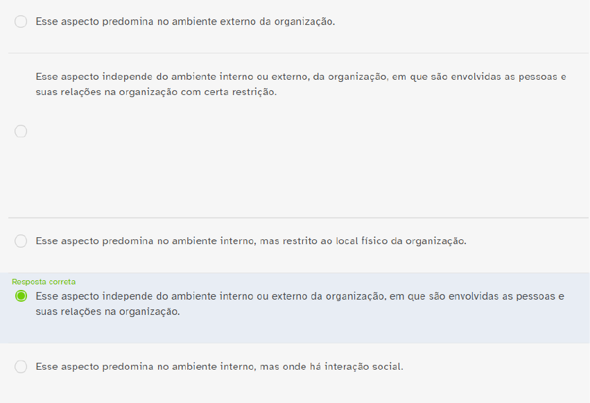 Fundamentos da Administração Atividade 1 – Unidade de Estudo 1 e 2 1 - Existem diferentes aspectos relacionados à organização informal dentro da organização. Além disso, cabe ressaltar que esses grupos informais surgem para satisfazer aos desejos das pessoas que compõem determinada parte da organização. Assinale a alternativa que apresenta qual aspecto é relacionado ao local da estrutura organizacional citada anteriormente: 2 - A departamentalização funcional é responsável por criar departamentos formados por pessoas que possuem habilidade e conhecimentos similares e que participam de atividades e tarefas comuns dentro de um processo de trabalho, ou seja, são especialistas em uma determinada função. Sabemos que os tipos de departamentalização nos apresentam vantagens e desvantagens nas organizações. Assinale a alternativa que cita uma vantagem que compete à departamentalização funcional: 3 - A abordagem tática da administração mercadológica é um conjunto de estratégias e ações que visam aumentar a aceitação e fortalecer a imagem de um produto ou serviço, pessoa, ideia, organização em geral ou de um determinado público segmentado. Com base no texto, assinale a alternativa que compreende o termo responsável pelo conjunto de estratégias no mercado que engloba a gestão integrada do produto, preço, praça e promoção: 4 - A estrutura organizacional é o elemento fundamental para que uma empresa mantenha o foco nos seus objetivos, porque ela trata da forma como a empresa é organizada em torno da divisão de atividades e recursos como objetivo de cumprir os objetivos da companhia. Analise as afirmativas no que diz respeito a como a estrutura organizacional pode ser exposta através de três componentes estruturais: I) Designação das relações formais de subordinação (níveis hierárquicos), controle de gerentes e supervisores. II) Unificação de políticas e procedimentos da organização. III) Identificação do agrupamento de indivíduos em departamentos. IV) Inclusão do projeto de sistemas com o objetivo de melhorar a comunicação, coordenação e integração entre os departamentos. V) Apresentação de objetivos e metas estabelecidos com os seus colaboradores Está correto o que se afirma em: 5 - A organização empresarial é composta de funções e cargos hierárquicos aos quais todos os membros da empresa estão sujeitos em sua participação. Ela é relativa à formatação da empresa em diferentes estruturas para que de fato a produção possa ocorrer ao longo do tempo, sendo uma entidade formada por pessoas organizadas em estruturas. Assinale a alternativa que apresenta como a estrutura organizacional pode ser dividida: 6 - O mundo atual vivencia transformações constantes na rotina das pessoas de forma geral, seja no trabalho, nos estudos, ou na sua forma de se relacionar com outras pessoas. As organizações pertencem a determinado ambiente (cidade, estado), sendo um sistema complexo aberto que interage na sociedade. Assinale a alternativa que evidencia o sistema complexo aberto: 7 - A organização no sistema capitalista moderno possui diversas faces em consequência da diversidade de atividades existentes no mundo moderno. Sobral e Peci (2013) dizem que se pode dividir as organizações em dois caminhos que, apesar de distintos, estão inter-relacionados. SOBRAL, F.; PECI, A. Administração: teoria e prática no contexto brasileiro. 2. ed. São Paulo: Pearson Education do Brasil, 2013. Assinale a alternativa que apresenta como se deu tal divisão: 8 - A origem do marketing ocorreu a partir da década de 1950, sendo que, no início, a proposta de criação de valor por práticas mercadológicas era a satisfação de desejos e necessidades. Contudo, o conceito evoluiu para o conceito do valor criado pela qualidade das experiências vividas e compartilhadas. Como parte da evolução, o marketing teve representação na era da produção em massa e a orientada para o mercado. Analise as afirmativas a seguir e indique quais nos evidenciam essa trajetória do marketing. I) De 1900 a 1950, o marketing estava inserido com foco na produção. II) A produção orientada para o mercado teve seu despertar à partir de 1950. III) No ano de 1960, iniciou-se o estudo sistemático do marketing. IV) O foco no cliente foi marcado a partir do ano de 2000. V) A partir de 2000, a demanda passou a ser maior que a oferta. Está correto o que se afirma em: 9 - As organizações compreendem o valor de uma comunicação eficaz que deve ser clara e direta entre todos aqueles que fazem parte dos negócios. Ela garante o bom andamento dos processos e, consequentemente, o alcance dos resultados pretendidos. Assinale a alternativa que nos apresenta o motivo pelo qual é importante investir na eficiência da comunicação: 10 - A organização formal consiste em todo o sistema criado pela empresa para se organizar, tais como: processos, normas, padrões de qualidade, níveis hierárquicos, cargos e atribuições de cada membro da instituição. Ela é apresentada de forma planejada e formalmente representada por aspectos importantes como o organograma. Sobre estrutura formal, é certo afirmar que: I - Estabelece formalmente as áreas de decisão com a definição das respectivas responsabilidades e autoridades II - Não é restrito ao horário de trabalho das pessoas dentro da organização, como no ambiente de lazer e livres das pessoas que trabalham na organização III - É baseada na divisão do trabalho racional com diferenciação e integração dos agentes. IV - É limitado aos temas que são interessantes para a organização Assinale a alternativa correta relacionada à estrutura formal: image6.png image7.png image8.png image9.png image10.png image1.png image2.png image3.png image4.png image5.png