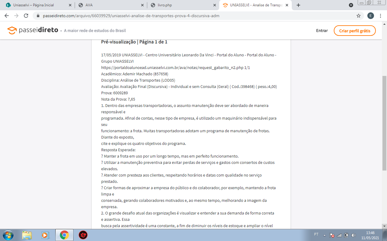 Uniasselvi - Página Inicial AVA S livro.php UNIASSELVI Analise de Transpo + C E passeidireto A maior rede de estudos do Brasil Entrar Criar perfil grátis Pré-visualização Página 1 de 1 17/05/2019 UNIASSELVI - Centro Universitário Leonardo Da Vinci Portal do Aluno - Portal do Aluno Grupo UNIASSELVI Acadêmico: Ademir Machado (857658) Disciplina: Análise de Transportes (LOD05) Avaliação: Avaliação Final (Discursiva) - Individual e sem Consulta (Geral) (Cod.:398468) ( Prova: 6009289 Nota da Prova: 7.65 1. Dentro das empresas transportadoras, assunto manutenção deve ser abordado de maneira responsável e programada. Afinal de contas, nesse tipo de empresa, é utilizado um maquinario indispensável para seu funcionamento: a frota. Muitas transportadoras adotam um programa de manutenção de frotas. Diante do exposto, cite e explique os quatro objetivos do programa. Resposta Esperada: ? Manter a frota em uso por um longo tempo, mas em perfeito funcionamento. ? Utilizar a manutenção preventiva para evitar perdas de serviços e gastos com consertos de custos elevados. ? Atender com presteza aos clientes, respeitando horários e datas com qualidade no serviço prestado. ? Criar formas de aproximar a empresa do público e do colaborador, por exemplo, mantendo a frota limpa e conservada, gerando colaboradores motivados e, ao mesmo tempo, melhorando a imagem da empresa. 2. grande desafio atual das organizações é visualizar e entender a sua demanda de forma correta e assertiva. Essa busca pela assertividade é uma constante, a fim de diminuir os níveis de estoque e ampliar nível PT all 13:46 11/05/2021