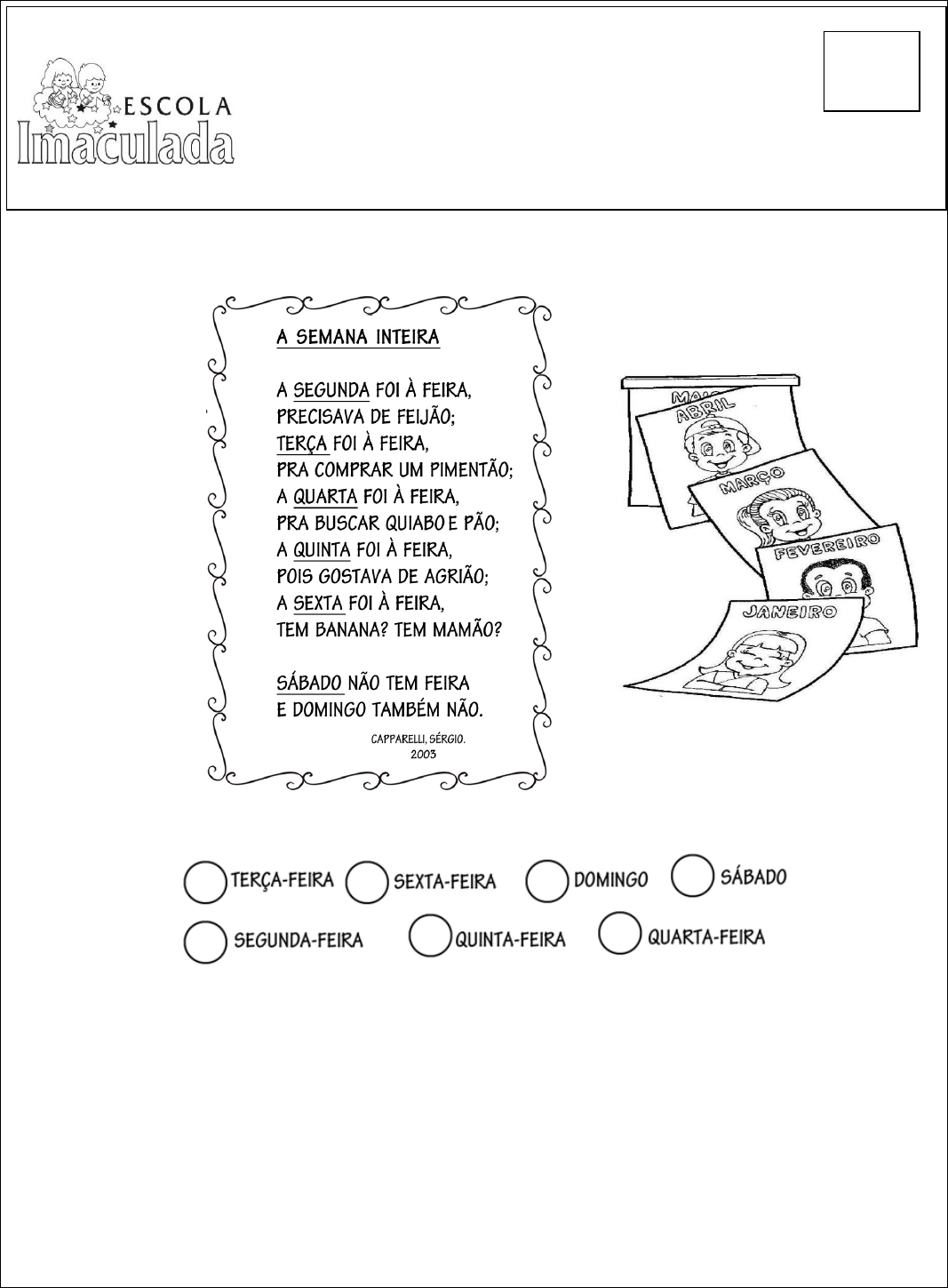 Fraternidade e vida: dom e compromisso Goiânia, ____ de ___________________de 2020. Nome: ________________________________________ Ano: 2º Turno: _____________________ Valor: 8,0 Avaliação de História Leia: 1 – Numere, na ordem correta, os dias da semana. (0,7) 2 – Qual o dia da semana que está entre terça-feira e quinta-feira? (0,8) ______________________________________________________________________________ 3 – Uma semana tem: (0,9) ( ) 5 dias ( ) 7 dias ( ) 8 dias Nota 4 – Os dias da semana em que não há aulas, são... (0,8) ( ) sexta-feira e sábado ( ) sábado e domingo ( ) sábado e segunda-feira Observe o calendário de 2020. 5 – Quantos meses tem o ano? (0,8) ______________________________________________________________________________ 6 – Pinte de vermelho o primeiro e o último mês do ano. (0,8) 7 – Qual é o quarto mês do ano? (0,8) ______________________________________________________________________________ 8 – Complete: (0,6) a) O ano tem, geralmente, _____________ dias. b) O ano é formado por _________ meses. c) Nós estamos no ano de ____________ . 9 – Qual é o mês do ano que pode ter 28 ou 29 dias? (0,6) ______________________________________________________________________________ 10 – Complete a cruzadinha com os meses do ano. (1,2) VERTICAL 1 – Sou o 1º mês do ano. 2 – Tenho sete dias. 3 – Sou o mês das férias. HORIONTAL 1 – Sou um mês do ano que começa com “A”. 2 – Sou o mês do ano que começa com “S”. 3 – Eu tenho doze meses. EXCELENTE AVALIAÇÃO!