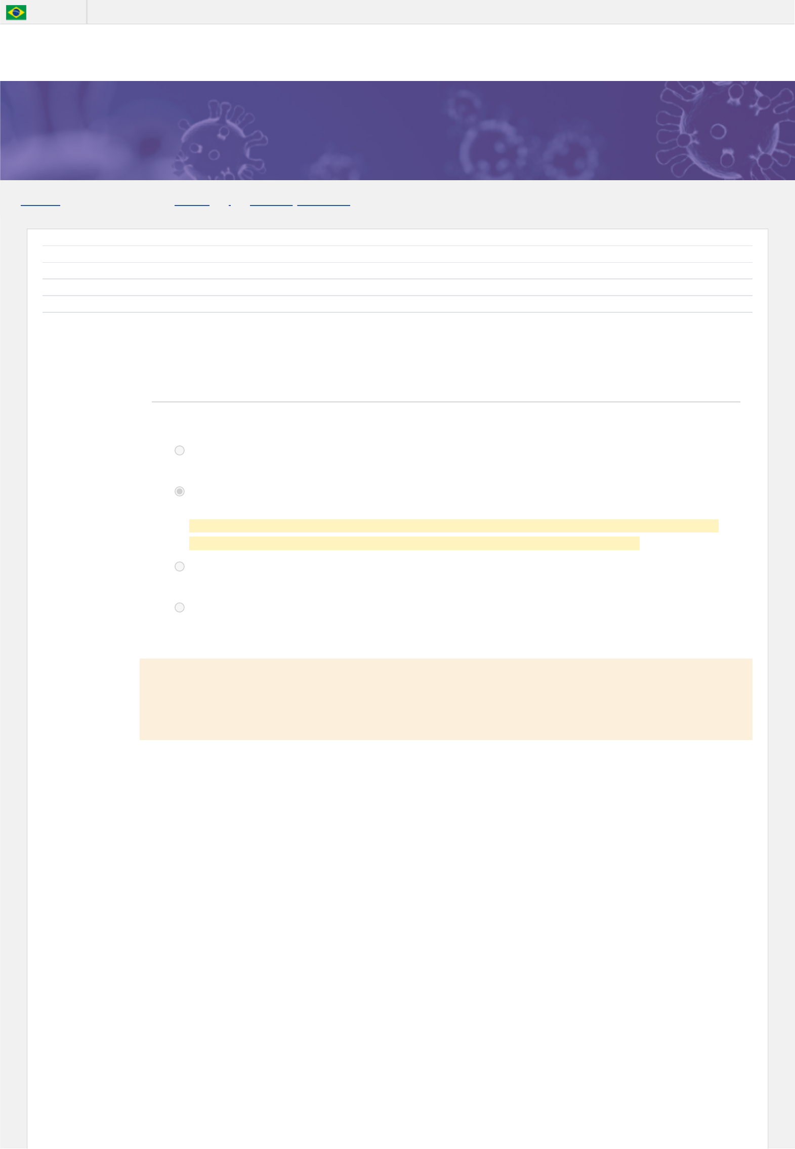 13/10/2023, 21:17 Avaliação Final: Revisão da tentativa https://cursos.matogrossodosul.fiocruz.br/mod/quiz/review.php?attempt=52684&cmid=160 1/8 PAINEL MEUS CURSOS MOD3 AVALIAÇÃO FINAL Enfrentamento das Arboviroses Questão 1 Correto Atingiu 8,34 de 8,34 Iniciado em sexta, 13 out 2023, 21:09 Estado Finalizada Concluída em sexta, 13 out 2023, 21:17 Tempo empregado 8 minutos 6 segundos Avaliar 100,00 de um máximo de 100,00 No cenário de circulação simultânea de várias arboviroses, o processo de vigilância e controle se torna cada vez mais importante. Considerando essas medidas de vigilância, é correto afirmar que: Escolha uma opção: a. Os óbitos suspeitos por arboviroses só podem ser confirmados com critério laboratorial e realização de uma autópsia completa, que precisa ser autorizada pela família. b. Em relação aos óbitos por arboviroses, eles devem ser notificados a partir da suspeita e investigados o mais rápido possível, pois podem direcionar adequação da assistência para evitar novos óbitos. Correto! A notificação não apenas dos casos suspeitos, mas dos óbitos, se faz necessária para identificação precoce de circulação viral e gerar medidas de vigilância e controle, evitando novos óbitos. c. O coeficiente de letalidade é uma medida que expressa o risco de adoecer da população, em um determinado período. d. O diagrama de controle é uma importante ferramenta da vigilância no monitoramento da situação epidemiológica e quando os casos ultrapassam a média móvel caracteriza a ocorrência de uma epidemia. Sua resposta está correta. A resposta correta é: Em relação aos óbitos por arboviroses, eles devem ser notificados a partir da suspeita e investigados o mais rápido possível, pois podem direcionar adequação da assistência para evitar novos óbitos. BRASIL Acesso à informação https://cursos.matogrossodosul.fiocruz.br/my/ https://cursos.matogrossodosul.fiocruz.br/course/view.php?id=6 https://cursos.matogrossodosul.fiocruz.br/course/view.php?id=6#section-0 https://cursos.matogrossodosul.fiocruz.br/mod/quiz/view.php?id=160 http://brasil.gov.br/ http://brasil.gov.br/barra#acesso-informacao http://brasil.gov.br/barra#acesso-informacao http://brasil.gov.br/barra#acesso-informacao http://brasil.gov.br/barra#acesso-informacao http://brasil.gov.br/barra#acesso-informacao http://brasil.gov.br/barra#acesso-informacao http://brasil.gov.br/barra#acesso-informacao http://brasil.gov.br/barra#acesso-informacao 13/10/2023, 21:17 Avaliação Final: Revisão da tentativa https://cursos.matogrossodosul.fiocruz.br/mod/quiz/review.php?attempt=52684&cmid=160 2/8 Questão 2 Correto Atingiu 8,34 de 8,34 Questão 3 Correto Atingiu 8,34 de 8,34 A comunicação de risco compreende um conjunto de estratégias que são essenciais para o combate das arboviroses. Acerca desse assunto, é correto afirmar que: Escolha uma opção: a. A comunicação de risco mobiliza diferentes estratégias, exclusivamente durante emergências em saúde pública, para prover o público sobre os riscos a respeito de uma determinada situação ou de um dado comportamento, visando a promoção e adoção de atitudes que possibilitem o bem-estar de si e do coletivo. b. As atribuições sobre o planejamento e as atividades de comunicação de risco no combate das arboviroses são apenas de gestores públicos e comunicadores, na perspectiva multidisciplinar entre comunicação e política pública. c. O engajamento comunitário é aspecto central para a concretização das ações de comunicação de risco. Por isso, as comunidades de risco devem ser apenas o público-alvo das ações, levando em conta o reconhecimento de suas características, ao invés de serem mobilizadas no planejamento e avaliação das diretrizes de comunicação de risco. d. Para a definição das estratégias de comunicação de risco para o combate das arboviroses, é importante que sejam avaliados os conhecimentos, crenças e práticas da população, bem como sejam ouvidas as suas dúvidas e preocupações. As estratégias de comunicação de risco devem levar em conta também o conhecimento e percepção do risco pelas comunidades, para que sejam efetivas. Sua resposta está correta. A resposta correta é: Para a definição das estratégias de comunicação de risco para o combate das arboviroses, é importante que sejam avaliados os conhecimentos, crenças e práticas da população, bem como sejam ouvidas as suas dúvidas e preocupações. Historicamente, a estruturação da Rede Nacional de Atenção Integral à Saúde dos Trabalhadores (RENAST) é marcada por avanços e desafios que permearam o desenvolvimento e consolidação da atenção à Saúde do Trabalhador no âmbito do Sistema Único de Saúde (SUS). Neste contexto, são considerados marcos importantes para a institucionalização das ações e serviços em Saúde do Trabalhador no âmbito do SUS: 1. A criação da RENAST, que representou a principal estratégia para a organização da Saúde do Trabalhador no âmbito do SUS. 2. A incorporação do conceito de Rede de Atenção à Saúde no âmbito da Saúde do Trabalhador, de modo a operacionalizar estratégias de vigilância e assistência à saúde dos trabalhadores no âmbito do SUS. 3. A centralidade da Atenção Primária em Saúde como principal referência para a capilarização e disseminação das ações de Saúde do Trabalhador, de modo a fortalecer uma atuação mais efetiva nos territórios, fundamentada por critérios epidemiológicos e sociais. 4. A incorporação efetiva, em suas concepções, paradigmas e ações, do lugar que o trabalho ocupa na vida dos indivíduos e na sua relação junto aos processos de morbimortalidade vivenciados pela população trabalhadora. Com base nas afirmações acima, é correto afirmar que: Escolha uma opção: a. Apenas a afirmação 1 está correta. b. A afirmação 3 não está correta. c. Somente as afirmações 1 e 4 estão corretas