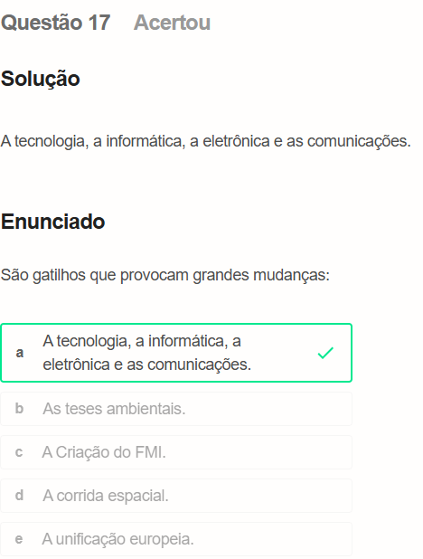 Questão 17 Acertou Solução A tecnologia, a informática, a eletrônica e as comunicações. Enunciado São gatilhos que provocam grandes mudanças: A tecnologia, a informática, a a eletrônica e as comunicações. b As teses C A Criação do FMI. d A corrida espacial. e A unificação europeia.
