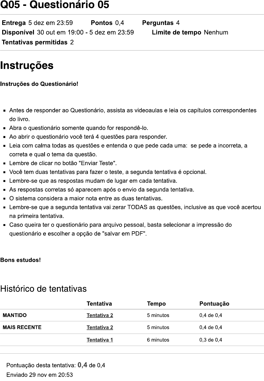 Q05 - Questionário 05 Entrega 5 dez em 23:59 Pontos 0,4 Perguntas 4 Disponível 30 out em 19:00 5 dez em 23:59 Limite de tempo Nenhum Tentativas permitidas 2 Instruções Instruções do Questionário! Antes de responder ao Questionário, assista as videoaulas e leia os capítulos correspondentes do livro. Abra o questionário somente quando for respondê-lo. Ao abrir o questionário você terá 4 questões para responder. Leia com calma todas as questões e entenda o que pede cada uma: se pede a incorreta, a correta e qual o tema da questão. Lembre de clicar no botão "Enviar Teste". Você tem duas tentativas para fazer o teste, a segunda tentativa é opcional. Lembre-se que as respostas mudam de lugar em cada tentativa. As respostas corretas só aparecem após o envio da segunda tentativa. O sistema considera a maior nota entre as duas tentativas. Lembre-se que a segunda tentativa vai zerar TODAS as questões, inclusive as que você acertou na primeira tentativa. Caso queira ter o questionário para arquivo pessoal, basta selecionar a impressão do questionário e escolher a opção de "salvar em PDF". Bons estudos! Histórico de tentativas Tentativa Tempo Pontuação MANTIDO Tentativa 2 5 minutos 0,4 de 0,4 MAIS RECENTE Tentativa 2 5 minutos 0,4 de 0,4 Tentativa 1 6 minutos 0,3 de 0,4 Pontuação desta tentativa: 0,4 de 0,4 Enviado 29 nov em 20:53Esta tentativa levou 5 minutos. Pergunta 1 0,1/0,1 pts A Lei de Fourier diz respeito ao transporte de energia, no caso, calor por condução em sólidos. Sua expressão é dada pela equação: q" = -k T. Sobre essa lei, observe as afirmativas abaixo. A lei de Fourier é fenomenológica, ou seja, foi desenvolvida a partir de observações experimentais. - O sinal negativo da equação indica que a direção do fluxo de calor é no sentido em que ocorre o aumento da temperatura. III - - O fluxo térmico é uma grandeza vetorial. A partir das afirmações anteriores, assinale a alternativa que apresenta afirmativas as corretas: Apenas III Correto! Apenas lell Pergunta 2 0,1/0,1 pts Considere um vidro retangular plano de área 1500 e de condutividade térmica de 0,0018 cal/s cm °C possui espessura de 4 mm. 3000 calorias por segundo fluem pelo vidro por conta do fluxo de calor por condução. Qual a diferença de temperatura nas diferentes faces do vidro? Correto! 444 °C111 °C 555° C 222 °C 333 °C Pergunta 3 0,1/0,1 pts No transporte de energia por convecção, dois movimentos são os responsáveis por manter o movimento do fluido na camada limite. Um deles possui relação com o movimento global do fluido e o outro com o movimento aleatório das moléculas, mais próximo à região de contato entre o fluido e a superfície aquecida. Estes dois tipos de movimentos da convecção são chamados de: Forçada e livre Correto! Adveção e difusão Condução e irradiação Ebulição e condensação Laminar e turbulento Pergunta 4 0,1/0,1 pts Uma película de óleo com 2 cm de espessura, a uma temperatura de 25° C escoa a uma velocidade de 0,4 m/s por uma superfície de 8 a uma temperatura de 200°C. Considerando que o coeficiente de transferência de calor nestas condições é de 140 qual o calor extraído por convecção nessa superfície? 140000 WCorreto! 196000 W 200000 W 160000 W 158000 W Pontuação do teste: 0,4 de 0,4