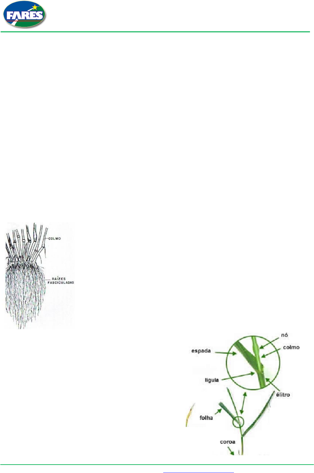 FACULDADE RORAIMENSE DE ENSINO SUPERIOR CURSO DE AGRONOMIA FORRAGICULTURA E NUTRIÇÃO ANIMAL Profº Esp. Denysson Amorim – agrobiorr@yahoo.com.br P ág in a1 CAPITULO I MORFOLOGIA E FISIOLOGIA DE PLANTAS FORRAGEIRAS 1.1. INTRODUÇÃO Nesta primeira aula iremos rever alguns conceitos de morfologia e fisiologia vegetal e discutir sua importância para a produção de forrageiras. Estudos sobre análise de crescimento e inter-relações da morfologia com a fisiologia permitem uma visão mais abrangente do sistema que envolve a produção de plantas forrageiras. Cabe ao produtor atentar a esses fatores para que, através do manejo, possa obter as interações positivas entre elas e elevar a produtividade e a perenidade das pastagens. 1.2. MORFOLOGIA VEGETAL Dentre as várias classificações dadas aos vegetais, podemos definir as plantas forrageiras como pertencentes ao grupo das Fanerógamas (vegetais superiores com raiz, caule flor e folhas), subgrupo das Angiospermas (possuem sementes dentro do fruto) e divididas em duas classes: Monocotiledôneas (folhas estreitas) e Dicotiledôneas (folhas largas). 1.2.1. Raiz A raiz pode derivar diretamente da radícola do embrião (durante a germinação) ou do caule. Essas são chamadas de raízes adventícias (muito comuns em gramíneas). As principais funções das raízes são a fixação da planta ao substrato (solo), a absorção e o transporte de água e nutrientes do solo para o xilema e deste para a planta toda. Em algumas plantas a raiz também pode funcionar como órgão de reserva (mandioca). Uma das principais características das raízes é que estas são desprovidas de gemas, folhas e folhas modificadas. Isso implica na impossibilidade de rebrota, ou seja, raízes não fazem brotação ao contrário do que muitos apregoam. 1.2.2. Folhas As folhas, originadas nas gemas do caule, são o principal local de ocorrência da fotossíntese e das trocas gasosas (oxigênio, gás carbônico, vapor d‟água) com o ambiente externo. São também os órgãos mais nutritivos da forrageira, pois apresentam grande concentração de nutrientes e maior digestibilidade. FACULDADE RORAIMENSE DE ENSINO SUPERIOR CURSO DE AGRONOMIA FORRAGICULTURA E NUTRIÇÃO ANIMAL Profº Esp. Denysson Amorim – agrobiorr@yahoo.com.br P ág in a2 1.2.3. Caule Ao contrário da raiz, o caule possui gemas laterais, ou seja, estas podem dar origem à raiz, caule (ramos), folhas e flores. A principal função do caule é funcionar como via de conexão entre raízes e folhas transportando água e nutrientes para as folhas e carboidratos destas para as raízes. É importante ressaltar que os caules, enquanto jovens, podem fazer a fotossíntese. O crescimento do caule é comandado pelo meristema apical, situado na extremidade superior e que dá origem a ramos, folhas e flores. 1.3. BOTÂNICA DE GRAMÍNEAS Segundo Evangelista; Rocha (1996) as gramíneas (também denominadas Poaceae) estão agrupadas em 300 gêneros e 5.000 espécies, sendo que 75% das forrageiras são dessa família. Ressaltam ainda que as plantas dessa família podem apresentar ciclos vegetativos anuais (milheto e aveia) ou perenes (brachiárias). As raízes das gramíneas são do tipo fasciculado, ou seja, não possuem uma raiz principal (figura 1) e podem ser seminais (originadas das sementes quando estão germinando) ou adventícias (originárias do caule), sendo estas raízes numerosas e pouco profundas. FACULDADE RORAIMENSE DE ENSINO SUPERIOR CURSO DE AGRONOMIA FORRAGICULTURA E NUTRIÇÃO ANIMAL Profº Esp. Denysson Amorim – agrobiorr@yahoo.com.br P ág in a3 O caule das gramíneas é do tipo colmo, podendo ser oco ou fistuloso (preenchido por tecido parenquimático), de acordo com Evangelista & Rocha, 1996. A região de crescimento encontra-se no ápice (meristema apical) e só após a eliminação deste é que a planta irá emitir perfilhos aéreos para substituir os pontos de crescimento e permitir a floração. Os caules podem apresentar dois tipos de propagação. Os caules com crescimento estolonífero são aqueles que se desenvolvem horizontalmente, acima da superfície do solo, cujas gemas laterais ao tocar o solo emitem raízes e originam uma nova planta (tiftons, estrela africana, coast cross, entre outros). Já os caules com crescimento rizomatoso emitem brotações abaixo da superfície do solo, que emergem próximas à planta mãe, originando novas plantas (B. bryzantha). (figuras 2 e 3) As folhas das gramíneas originam-se do meristema apical e apresentam uma estrutura que envolve o colmo chamada bainha, seguida da lâmina foliar e desenvolvem-se, alternadamente, uma FACULDADE RORAIMENSE DE ENSINO SUPERIOR CURSO DE AGRONOMIA FORRAGICULTURA E NUTRIÇÃO ANIMAL Profº Esp. Denysson Amorim – agrobiorr@yahoo.com.br P ág in a4 para cada planta. Já as flores, segundo Evangelista & Rocha, 1996, são distribuídas em ramos florísticos denominados inflorescências. (figura 4). 1.4. BOTÂNICA DE LEGUMINOSAS De acordo com Evangelista & Rocha, 1996, as leguminosas (folhas largas) são agrupadas em 500 gêneros e 11.000 espécies e podem ser classificadas como Angiospermas, classe Dicotiledonae e ordem Rosales. O sistema radicular das leguminosas, ao contrário das gramíneas, é constituído por uma raiz principal, que deriva da radícula do embrião. Dessa raiz principal originam-se várias raízes laterais FACULDADE RORAIMENSE DE ENSINO SUPERIOR CURSO DE AGRONOMIA FORRAGICULTURA E NUTRIÇÃO ANIMAL Profº Esp. Denysson Amorim – agrobiorr@yahoo.com.br P ág in a5 (raízes secundárias) que proporcionam uma melhor fixação e uma maior área de exploração do solo. A esse sistema radicular damos o nome de axial ou pivotante.(figura 5) Evangelista & Rocha, 1996, ressaltam que as leguminosas têm capacidade de fixar o nitrogênio do ar, através de simbiose com bactérias do gênero Rhizóbium, que em contato com a raiz formam os nódulos onde ocorre a fixação. O caule das leguminosas pode ser s