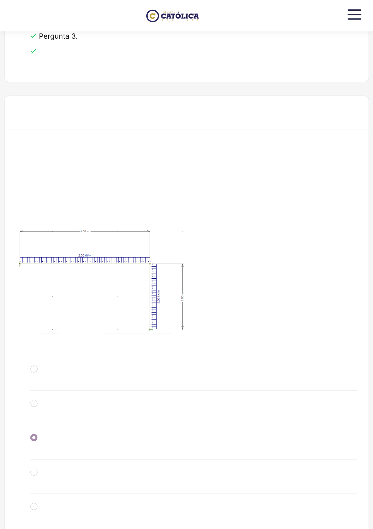 Pergunta 1. Pergunta 2. Pergunta 3. Pergunta 4. pontos: 0,100Pergunta 1. Tanto o método dos esforços quanto o método dos deslocamentos servem para solucionar problemas hiperestáticos. Cada um deles terá um roteiro próprio do método, porém os dois farão uso da criação de situações virtuais. É claro que as situações virtuais são diferentes. No caso do método dos deslocamentos as situações criadas têm como base o deslocamento, mais precisamente no giro de chapas colocadas de forma racional em pontos estratégicos. Tendo em vista este contexto, responda a seguinte questão. Calcule pelo método dos deslocamentos a reação vertical no engaste a direita. Considere o módulo de elasticidade e o momento de inércia igual para a estrutura toda. Múltipla Escolha: A�� Aproximadamente 4.7 kN para cima. B�� Aproximadamente 5.3 kN para cima. C�� Aproximadamente 3.7 kN para cima. D�� Aproximadamente 10.3 kN para cima. E�� Aproximadamente 4.9 kN para cima. javascript:void(0); pontos: 0,100Pergunta 2. O método dos deslocamentos é muito útil para a resolução de problemas hiperestáticos que envolvem vigas. Esta utilidade casa-se muito bem com os problemas do dia a dia do engenheiro, visto que vigas são extremamente comuns em projetos. Existem vigas em prédios, em casas, em pontes, em caminhões, em indústrias e em uma série de outros casos. Dado a importância do tema faça o que se pede. Calcule pelo método dos deslocamentos a reação vertical no apoio fixo. Considere o módulo de elasticidade e o momento de inércia igual para a estrutura toda. Múltipla Escolha: A�� Aproximadamente 4.3 kN para cima. B�� Aproximadamente 5.3 kN para cima. C�� Aproximadamente 1.5 kN para cima. D�� Aproximadamente 4.9 kN para cima. E�� Aproximadamente 3.9 kN para cima. Avaliação Nota Avaliada: 0,100 de 0,100 javascript:void(0); pontos: 0,100Pergunta 3. O método dos deslocamentos é muito útil para resolver problemas de vigas e também de pórticos. O conceito não muda, ainda vale o mesmo roteiro. Ainda há a adição de uma chapa, a criação de casos hiperestáticos com giros e sem giros, montagem do sistema de equações e ponderação com as soluções encontradas. Sabendo desse roteiro resolva o problema asseguir. Calcule pelo método dos deslocamentos a reação vertical no engaste a esquerda. Considere o módulo de elasticidade e o momento de inércia igual para a estrutura toda. Múltipla Escolha: A�� Aproximadamente 3.9 kN para cima. B�� Aproximadamente 5.3 kN para cima. C�� Aproximadamente 4.3 kN para cima. D�� Avaliação Nota Avaliada: 0,100 de 0,100 javascript:void(0); Aproximadamente 10.3 kN para cima. E�� Aproximadamente 4.9 kN para cima. pontos: 0,100Pergunta 4. O objetivo geral dos métodos para solucionar estruturas hiperestáticas é encontrar as reações de apoio na estrutura. O que vai diferenciar cada um dos métodos é o procedimento que eles utilizam. No método dos esforços utilizamos casos virtuais a partir de esforços e no método dos deslocamentos utilizamos casos virtuais a partir dos deslocamentos. No final teremos um sistema linear de equações onde encontraremos os fatores de ponderação do problema. Neste contexto faça o que se pede abaixo. Calcule pelo método dos deslocamentos a reação vertical no apoio móvel do meio da estrutura. Considere o módulo de elasticidade e o momento de inércia igual para a estrutura toda. Múltipla Escolha: A�� Aproximadamente 4.3 kN para cima. B�� Aproximadamente 3.9 kN para cima. C�� Aproximadamente 5.0 kN para cima. D�� Aproximadamente 6.0 kN para cima. Avaliação Nota Avaliada: 0,100 de 0,100 javascript:void(0);