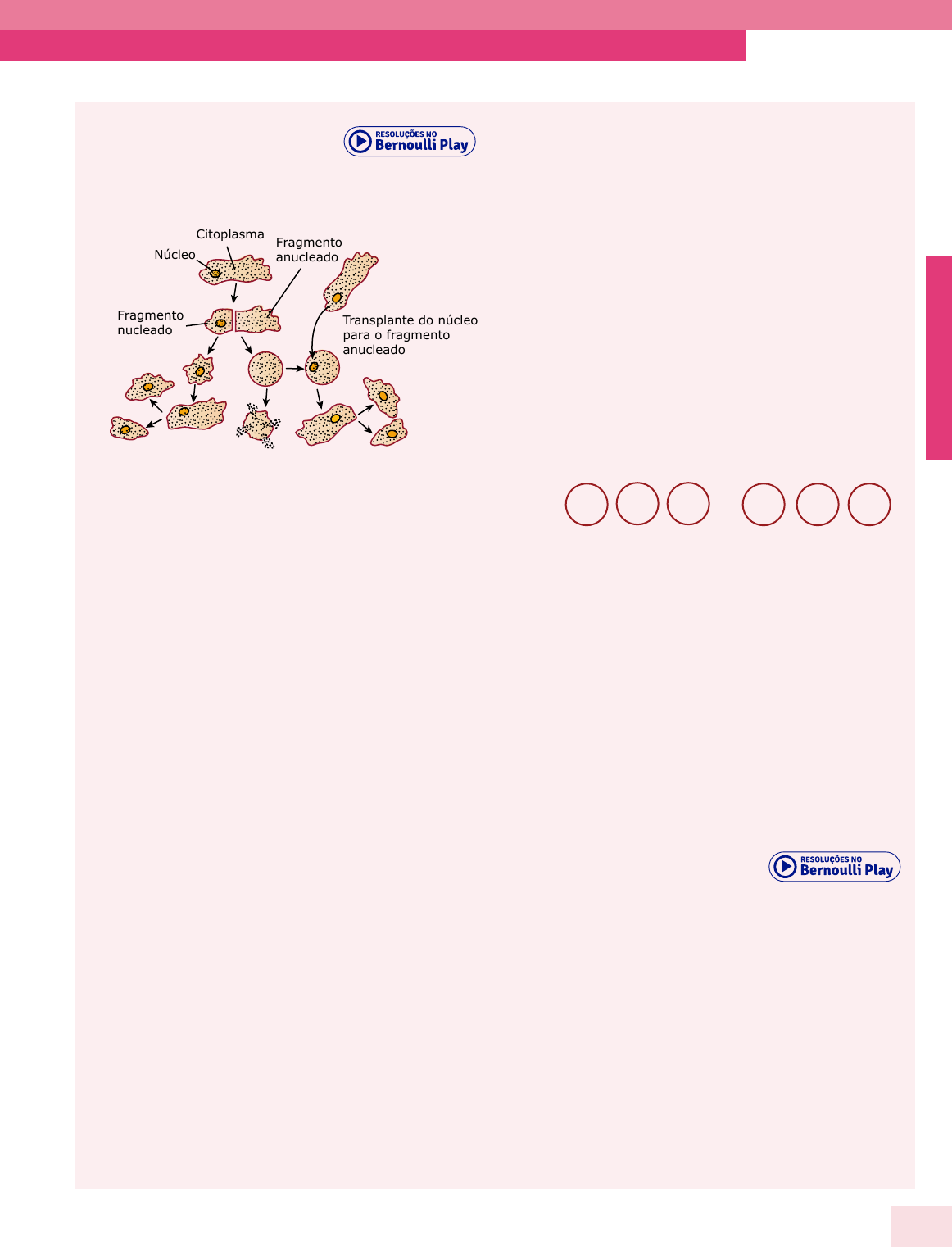 EXERCÍCIOS DE APRENDIZAGEM 01. (UFMG) Citoplasma Núcleo Fragmento anucleado Transplante do núcleo para o fragmento anucleado Fragmento nucleado O desenho representa duas experiências em amebas, que demonstram a importância do núcleo no controle das atividades celulares. Qual das afirmativas é errada em relação a essas experiências? A) A porção nucleada da ameba é capaz de se dividir, originando uma população de amebas. B) A porção anucleada de uma ameba seccionada morre após algum tempo. C) Uma ameba com núcleo transplantado é incapaz de se dividir. D) A porção nucleada da ameba cresce e vive normalmente. E) O transplante do núcleo para o fragmento de uma ameba anucleada regenera suas funções vitais. 02. (PUC Minas) Com relação aos nucléolos, é incorreto dizer que A) pode haver mais de um por núcleo. B) é envolvido por membrana específica. C) é rico em RNA ribossômico. D) se desintegra no início da divisão celular. E) não está presente em células procariontes. 03. (PUC RS) Supondo que ocorra um evento raro em que dois cromossomos não homólogos, de uma mesma célula, quebram-se e voltam a se soldar, porém com os segmentos trocados, estaríamos verificando a ocorrência de A) crossing-over. B) duplicação. C) translocação. D) inversão. E) deleção. BM8S 04. (Unioeste-PR) Uma espécie A possui 2n = 10 cromossomos; uma espécie B possui 2n = 14 cromossomos. Analise as afirmativas seguintes e assinale a alternativa correta. I. Um indivíduo híbrido originado do cruzamento entre as duas espécies possui 24 cromossomos. II. Um indivíduo triploide originado a partir da espécie A possui 30 cromossomos. III. Um indivíduo tetraploide originado a partir da espécie B possui 64 cromossomos. A) Todas as afirmativas estão corretas. B) Apenas as afirmativas I e II estão corretas. C) Apenas as afirmativas I e III estão corretas. D) Apenas as afirmativas II e III estão corretas. E) Todas as afirmativas estão erradas. 05. (UFMG) Representação esquemática de células de 6 indivíduos com a indicação do número de autossomos e da constituição dos cromossomos sexuais. 40 A XY 20 A X 44 A XY 22 A X 45 A XY 44 A XXY 1 2 3 4 5 6 A respeito destas células, qual a alternativa errada? A) 1 e 2 podem pertencer a indivíduos da mesma espécie, mas 1 é diploide e 2 é haploide. B) 1 e 3 podem pertencer a indivíduos normais, mas de espécies diferentes. C) 2 e 4 podem pertencer a espécies diferentes e podem ser haploides. D) 3 e 4 podem pertencer a indivíduos da espécie humana, mas apenas 3 pode pertencer ao sexo masculino. E) 5 e 6 podem pertencer a indivíduos da espécie humana, mas 5 pode apresentar síndrome de Down, e 6 apresenta síndrome de Klinefelter. EXERCÍCIOS PROPOSTOS 01. (FUVEST-SP) Qual das alternativas se refere a um cromossomo? A) Um conjunto de moléculas de DNA com todas as informações genéticas da espécie. B) Uma única molécula de DNA com informação genética para algumas proteínas. C) Um segmento de molécula de DNA com informação para uma cadeia polipeptídica. D) Uma única molécula de RNA com informação para uma cadeia polipeptídica. E) Uma sequência de três bases nitrogenadas do RNA mensageiro correspondente a um aminoácido na cadeia polipeptídica. 6TWI 5E6U O Núcleo Celular B IO LO G IA 19Bernoulli Sistema de Ensino 02. (UFPR–2015) Um pesquisador injetou uma pequena quantidade de timidina radioativa (3H-timidina) em células com o propósito de determinar a localização dos ácidos nucleicos sintetizados a partir desse nucleotídeo, utilizando uma técnica muito empregada em biologia celular, a autorradiografia combinada com microscopia eletrônica. Assinale a alternativa que apresenta os dois compartimentos celulares nos quais o pesquisador encontrará ácidos nucleicos radioativos. A) Núcleo e mitocôndrias. B) Citosol e mitocôndrias. C) Núcleo e retículo endoplasmático. D) Citosol e retículo endoplasmático. E) Peroxissomos e retículo endoplasmático. 03. (PUC Minas) São aberrações cromossômicas, exceto A) Aneuploidias B) Euploidias C) Recombinação gênica D) Deleção E) Translocação 04. (UFF-RJ) Diversas proteínas, como histonas e várias enzimas, embora sintetizadas no citoplasma,são encontradas no núcleo. A passagem dessas macromoléculas pelo envoltório nuclear é possível, porque A) ocorre um mecanismo específico de endocitose que permite a passagem de macromoléculas. B) o envoltório nuclear possui poros que permitem a passagem de macromoléculas. C) ocorre um mecanismo específico de pinocitose que permite o englobamento de algumas macromoléculas. D) existe, nesse envoltório, um mecanismo de transporte simultâneo e oposto de ácido ribonucleico e proteínas. E) existem transportadores nas membranas externa e interna do envoltório nuclear que realizam o transporte das macromoléculas, passando pelo lúmen do envoltório. 05. (UGF-RJ) Nos portadores da síndrome de Klinefelter, a presença de cromatina sexual indica que o indivíduo A) é do sexo masculino. B) não apresenta cromossomo Y. C) não apresenta cromossomo X. D) apresenta um cromossomo X a mais. E) apresenta os cromossomos X e Y duplicados. 06. (UFV-MG) O núcleo caracteriza a célula eucariótica e contém, praticamente, todo o material genético que controla as atividades celulares. Em geral, cada célula possui apenas um núcleo, entretanto algumas células apresentam dois ou mais. São exemplos de células que apresentam vários núcleos: QEW2 HLFF A) Os neurônios B) As musculares esqueléticas C) Os leucócitos D) As musculares lisas E) As epiteliais 07. (PUC RS–2015) Assim como o crescimento corporal, o envelhecimento tem características diferentes nos variados grupos de organismos. Um fator que contribui para a incapacidade da manutenção da integridade das células e dos tecidos é o acúmulo de danos causados pelos radicais livres de oxigênio (RLO). No interior da célula, os RLO alteram fos