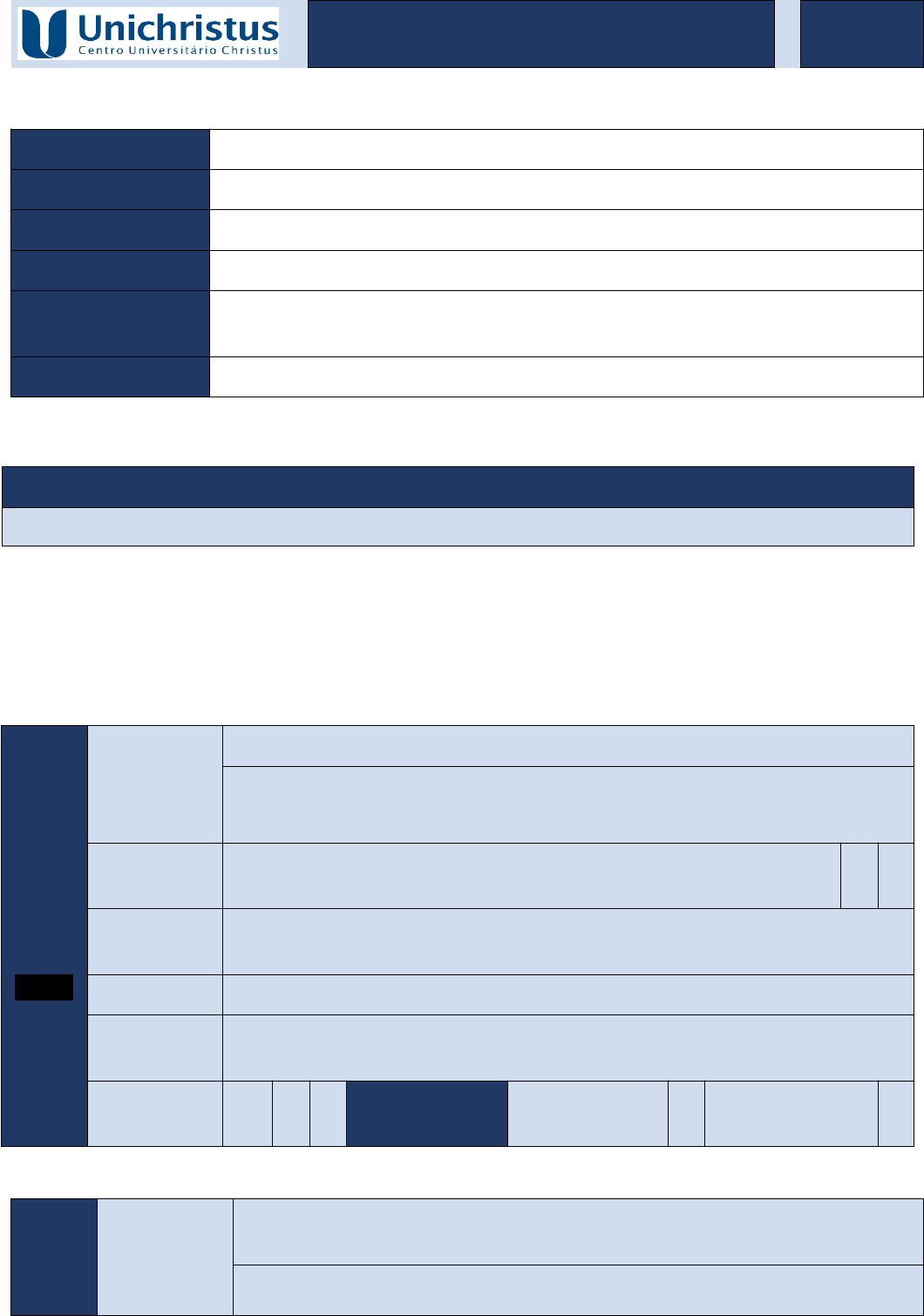 PLANO DE ENSINOE APRENDIZAGEM 2023.2 CURSO ODONTOLOGIA DISCIPLINA MICROBIOLOGIA E PARASITOLOGIA PROFESSOR (A) Juliana Paiva, Ramille Lima, Vilana Araújo ANO/SEMESTRE 2023.2 DIA / HORÁRIO / TURNO 2ª CD e 6ª MANHÃ PARQUE ECOLÓGICO CARGA HORÁRIA 80 horas COMPETÊNCIAS E HABILIDADES A SEREM DESENVOLVIDAS AULA 1 04/08 (sexta-feira) Juliana OBJETIVOS DE APRENDIZAGEM Teórico: Conhecer sobre a disciplina e regras Prático: (-) Conhecer o que será trabalhado no laboratório e regras CONTEÚDO APRESENTAÇAO DA DISCIPLINA TED: perguntas disparadoras sobre próxima aula CH 2H METODOLOGIA Datashow, RECURSOS Datashow, BIBLIOGRAFIA 1,2,3,4,5,6,7,,9 AVALIAÇÃO P1 P2 P3 Questões objetivas 2 Questões discursivas 1 AULA 2 07/08 (segunda-feira) Ramille OBJETIVOS DE APRENDIZAGEM Teórico: Conhecer ciclo de vida do parasita, sinais e sintomas, diagnóstico e tratamento das doenças casada pelos respectivos parasitas Prático: (-) CONTEÚDO Helmintos 1 TED: perguntas disparadoras sobre próxima aula CH 2H METODOLOGIA Aula expositiva RECURSOS Datashow, BIBLIOGRAFIA 3 AVALIAÇÃO P1 P2 P3 Questões objetivas: 2 Questões discursivas: 1 AULA 3 11/08 (sexta-feira) Juliana OBJETIVOS DE APRENDIZAGEM Teórico: Conhecer ciclo de vida do parasita, sinais e sintomas, diagnóstico e tratamento das doenças casada pelos respectivos parasitas Prático: (-) CONTEÚDO PROTOZOÁRIOS 1 TED: perguntas disparadoras sobre próxima aula CH 2H METODOLOGIA Aula expositiva RECURSOS Datashow, BIBLIOGRAFIA 3 AVALIAÇÃO P1 P2 P3 Questões objetivas: 2 Questões discursivas: 1 14/08 (segunda-feira) FERIADO AULA 4 18/08 (sexta-feira) Juliana OBJETIVOS DE APRENDIZAGEM Teórico: Conhecer ciclo de vida do parasita, sinais e sintomas, diagnóstico e tratamento das doenças casada pelos respectivos parasitas Prático: (-) CONTEÚDO PROTOZOÁRIOS 2 TED: perguntas disparadoras sobre próxima aula CH 2H METODOLOGIA Aula expositiva RECURSOS Datashow, BIBLIOGRAFIA 3 AVALIAÇÃO P1 P2 P3 Questões objetivas: 2 Questões discursivas: 1 AULA 5 21/08 (Segunda-feira) Ramille OBJETIVOS DE APRENDIZAGEM Teórico: Conhecer ciclo de vida do parasita, sinais e sintomas, diagnóstico e tratamento das doenças casada pelos respectivos parasitas Prático: (-) CONTEÚDO HELMINTOS 2 TED: perguntas disparadoras sobre próxima aula CH 2H METODOLOGIA Ativa questões. RECURSOS Datashow, BIBLIOGRAFIA 3 AVALIAÇÃO P1 P2 P3 Questões objetivas: 2 Questões discursivas: 1 AULA 6 25/08 (sexta-feira) Juliana/Vilana OBJETIVOS DE APRENDIZAGEM Teórico: Prático: Conhecer as formas dos parasitas CONTEÚDO PROTOZOÁRIOS–PRÁTICA TED: perguntas disparadoras sobre próxima aula CH 2H METODOLOGIA AULA PRÁTICA LAB DE MICROSCOPIA. RECURSOS DATA SHOW, LÂMINAS, MICROSCÓPIO BIBLIOGRAFIA 3 AVALIAÇÃO P1 P2 P3 Questões objetivas: 2 Questões discursivas: 1 AULA 7 28/08 (segunda-feira) Vilana OBJETIVOS DE APRENDIZAGEM Teórico: Conhecer ciclo de vida do parasita, sinais e sintomas, diagnóstico e tratamento das doenças casada pelos respectivos parasitas Prático: CONTEÚDO ARTRÓPODES TED: perguntas disparadoras sobre próxima aula CH 2H METODOLOGIA AULA EXPOSITIVA RECURSOS DATA SHOW BIBLIOGRAFIA 3 AVALIAÇÃO P1 P2 P3 Questões objetivas: 2 Questões discursivas: 1 AULA 8 01/09 OBJETIVOS DE APRENDIZAGEM Teórico: (sexta-feira) Ramille/JUliana Prático: Conhecer as formas dos parasitas CONTEÚDO HELMINTOS–PRÁTICA TED: perguntas disparadoras sobre próxima aula CH 2H METODOLOGIA Ativa RECURSOS Datashow, lâminas e microscópio BIBLIOGRAFIA 3 AVALIAÇÃO P1 P2 P3 Questões objetivas: 2 Questões discursivas: 1 AULA 09 04/09 (segunda-feira) Vilana OBJETIVOS DE APRENDIZAGEM Teórico Aprofundar o conhecimento sobre as células procarióicas e eucarióticas Prático: CONTEÚDO ANATOMIA FUNCIONAL DAS CÉLULAS 1 TED: perguntas disparadoras sobre próxima aula CH 2H METODOLOGIA Aula expositiva RECURSOS Datashow, BIBLIOGRAFIA 1,2,4,5,6,7,8 AVALIAÇÃO P1 P2 P3 Questões objetivas: 2 Questões discursivas: 1 AULA 10 08/09 (sexta-feira) Vilana OBJETIVOS DE APRENDIZAGEM Teórico: Aprofundar o conhecimento sobre as células procarióicas e eucarióticas Prático: - CONTEÚDO ANATOMIA FUNCIONAL DAS CÉLULAS 2 TED: perguntas disparadoras sobre próxima aula CH 2H METODOLOGIA Aula expositiva RECURSOS Datashow, BIBLIOGRAFIA 3 AVALIAÇÃO P1 P2 P3 Questões objetivas: 2 Questões discursivas: 1 AULA 11 11/09 (segunda-feira) Ramille OBJETIVOS DE APRENDIZAGEM Teórico: Apresentar conhecimentos teóricos, satisfatórios, dos conteúdos trabalhados no primeiro período Prático: - CONTEÚDO TBL PARASITOLOGIA GERAL TED: perguntas disparadoras sobre próxima aula CH 2H METODOLOGIA Metodologia ativa RECURSOS Datashow BIBLIOGRAFIA 1,2,4,5,6,7,8 AVALIAÇÃO P1 P2 P3 Questões objetivas: 2 Questões discursivas: 1 AULA12 15/09 (sexta-feira) Juliana/Vilana OBJETIVOS DE APRENDIZAGEM Teórico: Prático: Revisão das formas dos protozoários e helmintos CONTEÚDO REVISÃO PARA PROVA PRÁTICA Conteúdos teóricos das aulas 02 a 11 TED: perguntas disparadoras sobre próxima aula CH 2H METODOLOGIA Prova somativa RECURSOS AULA 13 18/09 (segunda-feira) Ramille/Vilana OBJETIVOS DE APRENDIZAGEM Teórico: . Prático: Apresentar conhecimentos práticos, satisfatórios, dos conteúdos trabalhados no primeiro período CONTEÚDO PROVA PRÁTICA CH 2H METODOLOGIA Prova somativa RECURSOS Prova somativa BIBLIOGRAFIA AVALIAÇÃO P1 P2 P3 Questões objetivas: Questões discursivas: AULA 14 22/09 (sexta-feira) Juliana OBJETIVOS DE APRENDIZAGEM Teórico: Apresentar conhecimentos teóricos, satisfatórios, dos conteúdos trabalhados no primeiro período Prático: CONTEÚDO PROVA TEÓRICA Conteúdos teóricos das aulas 02 a 11 TED: perguntas disparadoras sobre próxima aula CH 2H METODOLOGIA Prova somativa RECURSOS Prova somativa BIBLIOGRAFIA 1,2,3, AVALIAÇÃO P1 P2 P3 Questões objetivas: Questões discursivas: AULA 15 25/09 (segunda-feira) Ramile OBJETIVOS DE APRENDIZAGEM Teórico: Estudar as propriedades microbian