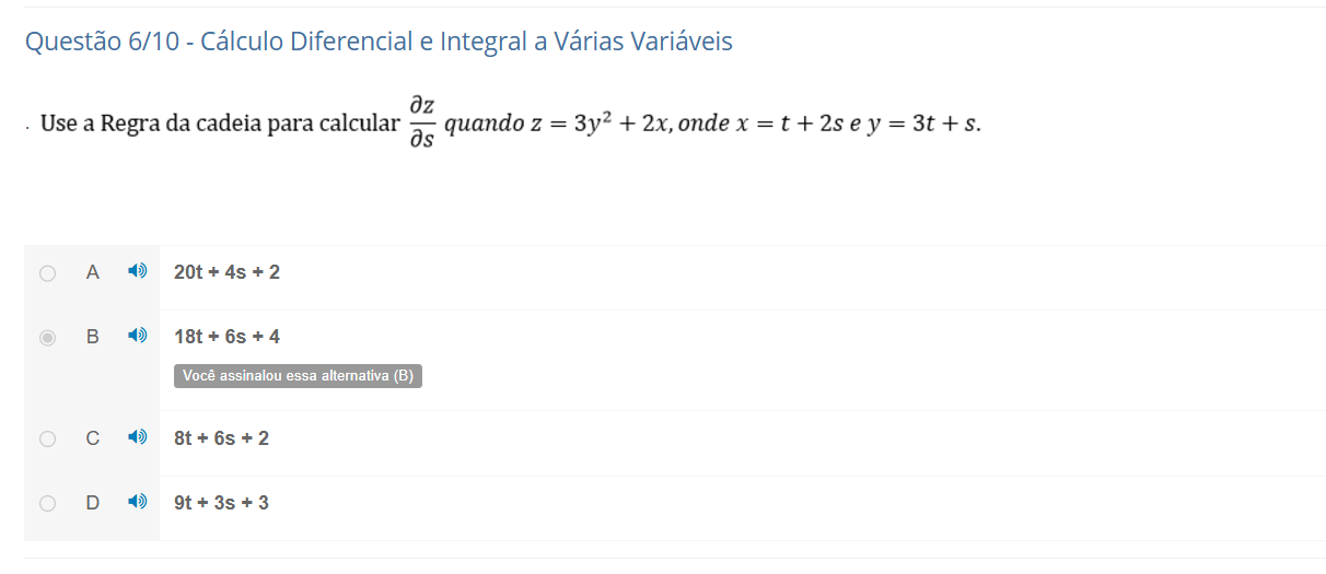 Questão 6/10 - Cálculo Diferencial e Integral a Várias Variáveis Use a Regra da cadeia para calcular quando Z =3y2 = + 2x, as A 20t+4s+2 B 18t+6s+4 Você assinalou essa alternativa (B) C D