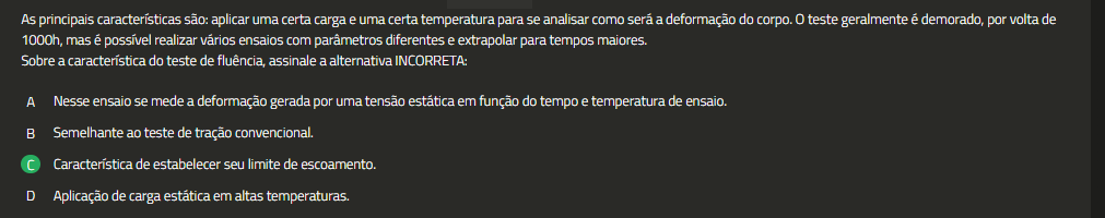 As principais características são: aplicar uma certa carga e uma certa temperatura para se analisar como será a deformação do corpo. teste geralmente é demorado, por volta de 1000h, mas é possível realizar vários ensaios com parâmetros diferentes e extrapolar para tempos Sobre a característica do teste de fluência, assinale a alternativa INCORRETA: A Nesse ensaio se mede a deformação gerada por uma tensão estática em função do tempo e temperatura de ensaio. B Semelhante ao teste de tração convencional. Característica de estabelecer seu limite de D Aplicação de carga estática em altas temperaturas.