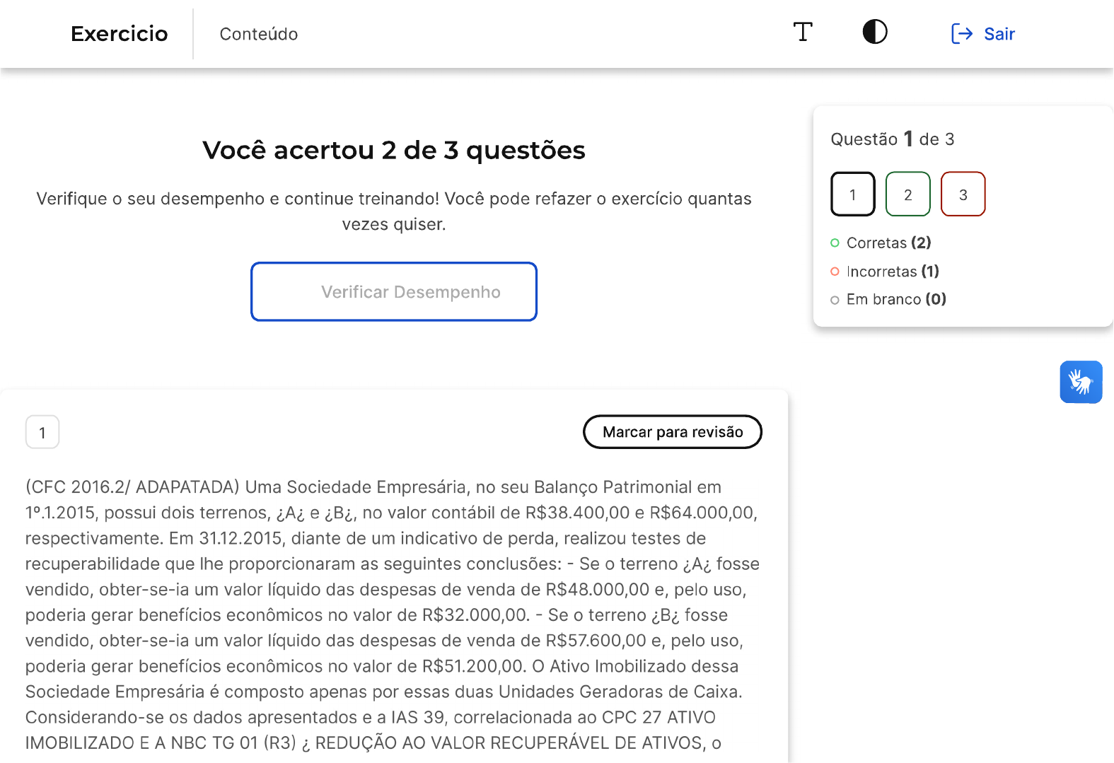Exercicio Conteúdo T Sair Questão 1 de 3 Você acertou 2 de 3 questões Verifique seu desempenho e continue treinando! Você pode refazer o exercício quantas 1 2 3 vezes quiser. Corretas (2) Incorretas (1) Verificar Desempenho Em branco (0) 1 Marcar para revisão (CFC 2016.2/ ADAPATADA) Uma Sociedade Empresária, no seu Balanço Patrimonial em possui dois terrenos, e ¿Bi, no valor contábil de R$38.400,00 e R$64.000,00, respectivamente. Em 31.12.2015, diante de um indicativo de perda, realizou testes de recuperabilidade que lhe proporcionaram as seguintes conclusões: Se o terreno fosse vendido, obter-se-ia um valor líquido das despesas de venda de R$48.000,00 e, pelo uso, poderia gerar benefícios econômicos no valor de R$32.000,00. Se terreno fosse vendido, obter-se-ia um valor líquido das despesas de venda de R$57.600,00 e, pelo uso, poderia gerar benefícios econômicos no valor de R$51.200,00. O Ativo Imobilizado dessa Sociedade Empresária é composto apenas por essas duas Unidades Geradoras de Caixa. Considerando-se os dados apresentados e a IAS 39, correlacionada ao CPC 27 ATIVO IMOBILIZADO E A NBC TG 01 (R3) i REDUÇÃO AO VALOR RECUPERÁVEL DE ATIVOS, oValor Contábil do Ativo Imobilizado a ser apresentado no Balanço Patrimonial em 31.12.2015 é de: A R$83.200,00. B R$96.000,00 C R$102.400,00. D R$105.600,00 E R$100.000,00 Resposta correta Parabéns, você selecionou a alternativa correta. Confira o gabarito comentado! Gabarito Comentado No teste de recuperabilidade, aplicado a ativos imobilizados e intangíveis, conforme artigo 183, parágrafo terceiro da Lei 6.404/76 e CPC 01, em síntese, temos de comparar o valor contábil com o valor recuperável. O valor recuperável é o maior entre o valor justo líquido de despesa de venda e o valor em uso. Valor contábil > Valor recuperável = A PERDA VAI SER da reconhecida no resultado. Valor recuperável > Valorcontábil= Nada há que ser feito. Terreno A Valor contábil 38.400,00 Valor em uso 32.000,00 Valor de venda 48.000,00 (valor recuperável) Nada há que ser feito, portanto. Terreno B Valor contábil 64.000,00 Valor em uso 51.200,00 Valor de venda 57.600,00 (valor recuperável) Redução do valor ativo para R$ 57.600,00, já que esse é o valor máximo que será recuperado. A empresa reconhece uma perda no resultado da ordem de R$ 6.400,00. D i Ajuste com perda por recuperabilidade (despesa) 6.400,00 C Ajuste i red. valor recuperável (ret. ativo) 6.400,00 No balanço, ficará assim: Terreno A 38.400,00 Terreno B 64.000,00 (-) Ajuste (6.400,00) Valor contábil 96.000,00 2 Marcar para revisão Conforme determina o CPC 27 imobilizado, quando os gastos realizados não proporcionarem a expectativa provável de geração de benefícios econômicos para a entidade no período contábil corrente ou posterior, o item será reconhecido como: A Investimento B Ativo C DespesaD Patrimônio Líquido E Passivo Resposta correta Parabéns, você selecionou a alternativa correta. Confira o gabarito comentado! Gabarito Comentado Conforme CPC 27, o custo de um item de ativo imobilizado deve ser reconhecido como ATIVO se, e apenas se: (a) for provável que futuros benefícios econômicos associados ao item fluirão para a entidade; e (b) o custo do item puder ser mensurado confiavelmente. 3 Marcar para revisão (adaptada - Exame de Suficiência i CFC i 02-2012) Uma sociedade empresária adquiriu uma máquina em 3.1.2012, em dez parcelas de R$6.240,00, cujo valor presente total corresponde a R$60.000,00, considerando a taxa de juros da operação que coincide com a taxa de juros de mercado. A máquina ficou pronta para entrar em funcionamento em e sua vida útil foi estimada em 5 anos, com valor residual igual a zero.Considerando os dados fornecidos, o saldo da conta Depreciação Acumulada, pelo método linear, em 31.12.2012, será de: A a) R$11.000,00. B R$11.440,00. C R$12.000,00. D R$12.480,00. E R$11.240,00 X Resposta incorreta Opa! A alternativa correta é a letra A. Confira o gabarito comentado! Gabarito Comentado O valor da depreciação é calculado pela fórmula: (valor do bem / vida útil) X número de meses. No caso, o valor do bem é R$60.000,00, a vida útil é de 5 anos, ou 60 meses, e o número de meses decorridos é de 11 meses. Portanto, o valor da depreciação é de R$11.000,00.