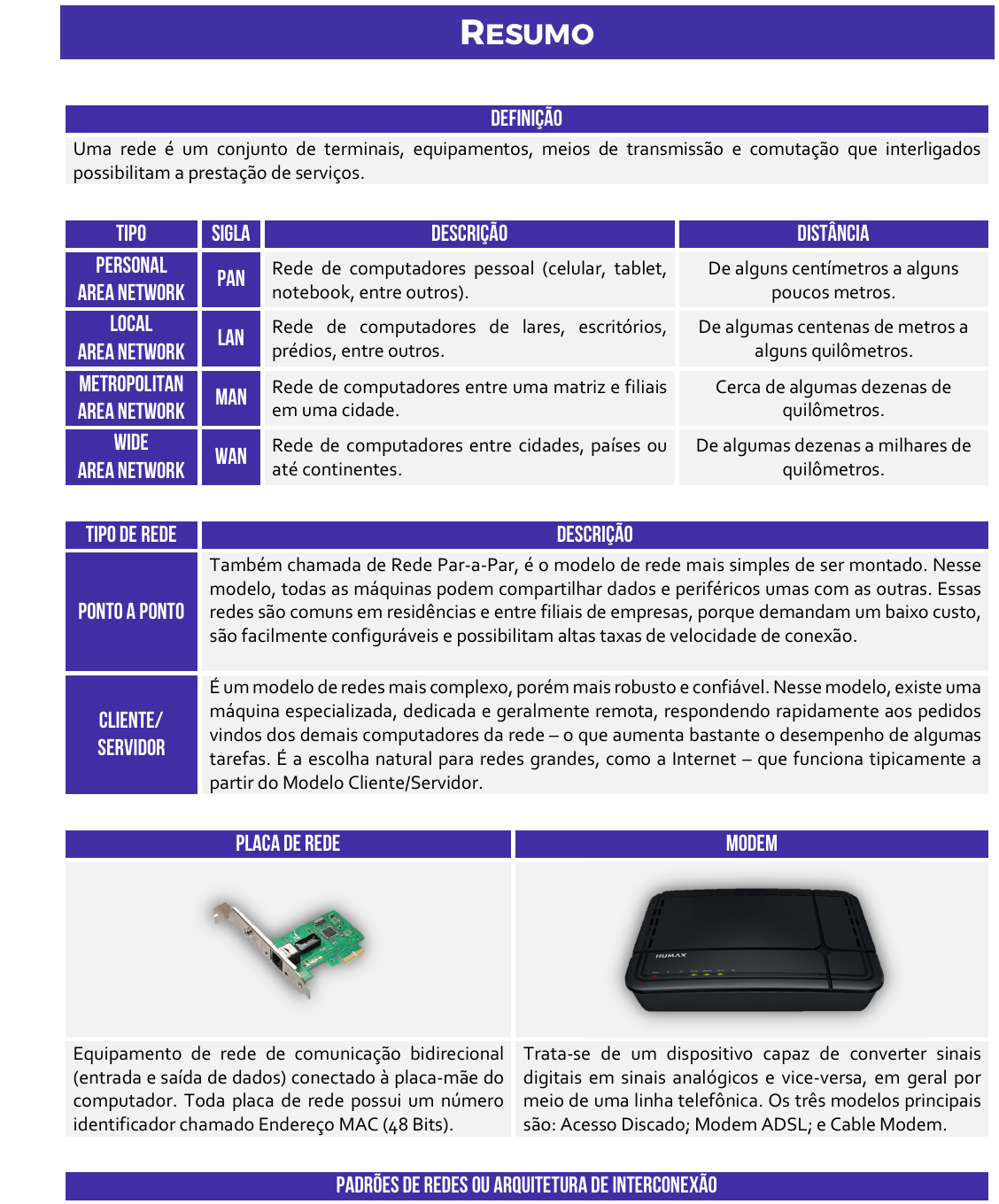 RESUMO DEFINIÇÃO Uma rede é um conjunto de terminais, equipamentos, meios de transmissão e comutação que interligados possibilitam a prestação de serviços. TIPO SIGLA DESCRIÇÃO DISTÂNCIA PERSONAL AREA NETWORK PAN Rede de computadores pessoal (celular, tablet, notebook, entre outros). De alguns centímetros a alguns poucos metros. LOCAL AREA NETWORK LAN Rede de computadores de lares, escritórios, prédios, entre outros. De algumas centenas de metros a alguns quilômetros. METROPOLITAN AREA NETWORK MAN Rede de computadores entre uma matriz e filiais em uma cidade. Cerca de algumas dezenas de quilômetros. WIDE AREA NETWORK WAN Rede de computadores entre cidades, países ou até continentes. De algumas dezenas a milhares de quilômetros. TIPO de rede DESCRIÇÃO PONTO A PONTO Também chamada de Rede Par-a-Par, é o modelo de rede mais simples de ser montado. Nesse modelo, todas as máquinas podem compartilhar dados e periféricos umas com as outras. Essas redes são comuns em residências e entre filiais de empresas, porque demandam um baixo custo, são facilmente configuráveis e possibilitam altas taxas de velocidade de conexão. CLIENTE/ SERVIDOR É um modelo de redes mais complexo, porém mais robusto e confiável. Nesse modelo, existe uma máquina especializada, dedicada e geralmente remota, respondendo rapidamente aos pedidos vindos dos demais computadores da rede – o que aumenta bastante o desempenho de algumas tarefas. É a escolha natural para redes grandes, como a Internet – que funciona tipicamente a partir do Modelo Cliente/Servidor. PLACA DE REDE MODEM Equipamento de rede de comunicação bidirecional (entrada e saída de dados) conectado à placa-mãe do computador. Toda placa de rede possui um número identificador chamado Endereço MAC (48 Bits). Trata-se de um dispositivo capaz de converter sinais digitais em sinais analógicos e vice-versa, em geral por meio de uma linha telefônica. Os três modelos principais são: Acesso Discado; Modem ADSL; e Cable Modem. PADRÕES DE REDES OU ARQUITETURA DE INTERCONEXÃO 01718910231 - Felicia Soares Trata-se de um conjunto de padrões de arquitetura de interconexão de redes de computadores (LAN, MAN ou WAN). PADRÃO NOME IEEE 802.11 Wi-Fi (WLAN) IEEE 802.15 Bluetooth (WPAN) PADRÃO WIRELESS (IEEE 802.11) Arquitetura de conexão de redes locais sem fio que define um conjunto de padrões de transmissão e codificação para comunicações não cabeadas. PADRÃO BLUETOOTH (IEEE 802.15) Esse padrão tem o objetivo de integrar equipamentos periféricos. Utilizado em Rede WPAN (Wireless Personal Area Network) – eles padronizam uma rede de baixo custo, curto alcance, baixas taxas de transmissão e sem fio. internet A Internet é basicamente um vasto conjunto de redes de computadores diferentes que utilizam um padrão comum de comunicação e oferece um determinado conjunto de serviços. Principais SERVIÇOS DESCRIÇÃO World Wide Web (WWW) Trata-se do serviço de visualização de páginas web organizadas em sites em que milhares de pessoas possuem acesso instantâneo a uma vasta gama de informação online em hipermídia que podem ser acessadas via navegador – é o serviço mais utilizado na Internet. Em geral, esse serviço utiliza protocolos como HTTP e HTTPS. CORREIO ELETRÔNICO Trata-se do serviço de composição, envio e recebimento de e-mails entre partes de uma maneira análoga ao envio de cartas – é anterior à criação da Internet. Utiliza tipicamente um modo assíncrono de comunicação que permite a troca de mensagens dentro de uma organização. Em geral, esse serviço utiliza protocolos como POP3, IMAP e SMTP. ACESSO REMOTO Trata-se do serviço que permite aos usuários facilmente se conectarem com outros computadores, mesmo que eles estejam em localidades distantes no mundo. Esse acesso remoto pode ser feito de forma segura, com autenticação e criptografia de dados, se necessário. Em geral, esse serviço utiliza protocolos como SSH e TELNET. TRANSFERÊNCIA DE ARQUIVOS Trata-se do serviço de tornar arquivos disponíveis para outros usuários por meio de downloads e uploads. Um arquivo de computador pode ser compartilhado ou transferido com diversas pessoas através da Internet, permitindo o acesso remoto aos usuários. Em geral, esse serviço utiliza protocolos como FTP e P2P. WORLD WIDE WEB (WWW) A Web é uma aplicação que é executada na Internet – trata-se de uma série de páginas web que podem ser acessadas por meio de um navegador web. INTERNET DAS COISAS Trata-se do conceito que se refere à interconexão digital de objetos físicos cotidianos entre si e com usuários por meio de sensors ou softwares capazes de transmitir dados pela internet 01718910231 - Felicia Soares TECNOLOGIA de acesso DESCRIÇÃO Dial-Up Conexão discada através de um modem e uma linha de telefonia fixa. Era a maneira mais popular de acesso da década de 90, hoje encontra-se em desuso. Apresenta como características um alto custo (telefonia, provedor) e baixas taxas de transmissão, taxas de até 56 Kbps (banda estreita). ISDN Linha telefônica transformada em dois canais de mesma velocidade, em que era possível usar voz e dados simultaneamente – cada um ocupando um canal. Era possível também utilizar os dois canais para voz ou para dados. Na prática, permitia videoconferências desde que os dois assinantes possuíssem o serviço ISDN. ADSL Conexão de Banda Larga oferecida por empresas de telefonia fixa. Embora utilize a mesma infraestrutura da telefonia discada (cabos), a transmissão de dados ocorria em frequências mais altas que as de voz, permitindo, portanto, o uso simultâneo da Internet e do telefone convencional. HDF e CABLE MODEM Conexão de Banda Larga via cabos de concessionárias de TV a Cabo (NET, GVT, OI, etc). Emprega uma técnica conhecida como HFC (Hybrid Fiber-Coaxial), em que cria Redes Metropolitanas (MANs) com Backbones de fibra ótica e interconecta as residências a partir de cabos 
