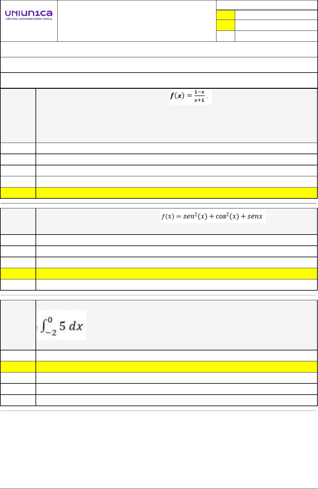 Pincel Atômico - 01/12/2024 18:36:37 1/3 RAFFAELLA DE PAULA VICENTE Avaliação Online (Curso Online - Automático) Atividade finalizada em 14/11/2024 14:34:55 (1428760 / 1) LEGENDA Resposta correta na questão # Resposta correta - Questão Anulada X Resposta selecionada pelo Aluno Disciplina: TEORIA DOS NÚMEROS [983868] - Avaliação com 10 questões, com o peso total de 30,00 pontos [capítulos - Todos] Turma: Segunda Graduação: Segunda Graduação 6 meses - Licenciatura em Matemática - Grupo: FPD-NOVEMBRO/2023 - SGegu0A231123 [107480] Aluno(a): 91536011 - RAFFAELLA DE PAULA VICENTE - Respondeu 7 questões corretas, obtendo um total de 21,00 pontos como nota [360338_39635] Questão 001 Analise as afirmativas acerca da função I – A função é descontínua para x = 0. II – A função é descontínua para x = -1. III – A função é contínua para x = 2. Assinale a alternativa correta. Todas as afirmativas estão corretas. Somente a afirmativa I e III estão corretas. X Nenhuma afirmativa está correta. Somente a afirmativa I e II estão corretas. Somente a afirmativa II e III estão corretas. [360338_39690] Questão 002 Ao calcularmos a derivada da função encontramos como resultado: X Senx 2 1 Cosx 0 [360338_70107] Questão 003 Por meio o teorema fundamental do cálculo (parte 2) pode-se calcular o valor de Dessa forma, o valor encontrado é : 5 X 10 0 - 5 - 10 Pincel Atômico - 01/12/2024 18:36:37 2/3 [360338_39718] Questão 004 Analise as afirmativas apresentadas acerca do gráfico abaixo. I - O limite de f(x) quando x → - 2 é não existe. II - O limite de f(x) quando x → 2 é - 2. III - O limite de f(x) quando x → 4 é 0. IV - O limite de f(x) quando x → 6 é não existe. V - O limite de f(x) quando x → 7 é 3. Assinale a alternativa correta. somente as afirmativas IV e VI estão corretas. somente as afirmativas II e VI estão corretas. X somente as afirmativas II,III e V estão corretas. todas as afirmativas estão erradas. todas as afirmativas estão corretas. [360338_70185] Questão 005 Ao calcular a integral encontraremos a primitiva. Dessa forma, o valor encontrado é: X [360339_70353] Questão 006 Calculando a integral pelo método da integração por partes, teremos : e - 1 - e - 1 X e +1 e - e + 1 [360339_70117] Questão 007 Calculando a antiderivada de encontraremos Pincel Atômico - 01/12/2024 18:36:37 3/3 X 1 [360339_39721] Questão 008 Analise as afirmativas acerca da função I – A função é contínua para x = 0. II – A função é contínua para x = -1. III – A função é descontínua para x = 2. Assinale a alternativa correta: Somente a afirmativa III está correta. Somente a afirmativa II está correta. Nenhuma afirmativa está correta. X Somente a afirmativa I está correta. Todas as afirmativas estão corretas. [360340_39805] Questão 009 Ao calcularmos a derivada da função encontramos como resultado: X [360340_39732] Questão 010 Dada a função , o valor de k para que essa função seja contínua em x = 3 é: K = 5 K = 4 K = 3 X K = 1 K = 2