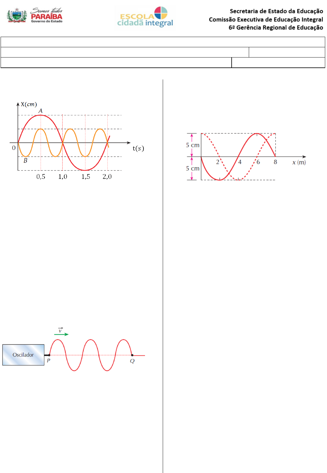 RECUPERAÇÃO/REPOSIÇÃO DE FÍSICA - 4º BIMESTRE 2023 ALUNO(A): TURMA: PROFESSOR: EDME VALE PEREIRA DATA: / / 2023 01. Observe os dois movimentos oscilatórios representados pelo gráfico abaixo: As frequências de B e de A são, respectivamente: a) b) c) d) e) 02. Em , um oscilador produz ondas numa corda, apresentada na figura abaixo, entre os pon tos e . Sendo a velocidade de propagação da onda igual a 0,3 m/s, o seu comprimento de onda será: a) b) c) d) e) 03. A figura abaixo representa parte de uma onda propagando-se numa corda ao longo do eixo x. A curva cheia é a forma da corda no instante , e a curva tracejada, a forma em . Nesse caso, podemos afirmar que: a) A amplitude dessa onda é b) O seu comprimento de onda é c) A velocidade da onda é d) A sua frequência é . e) A amplitude dessa onda é . 04. Considere as seguintes afirmações: I. As ondas eletromagnéticas se propagam tanto no vácuo como em meios materiais. II. As ondas mecânicas se propagam no vácuo. III. A luz pode ser polarizada, por isso é uma onda eletromagnética. Assinale a alternativa correta: a) somente a afirmação I é verdadeira. b) somente a afirmação II é verdadeira. c) somente as afirmações I e II são verdadeiras. d) somente as afirmações I e III são verdadeiras. e) as três afirmações são verdadeiras. 05. Enquanto brinca, Gabriela produz uma onda transversal em uma corda esticada. Em certo instante, parte dessa corda tem a forma mostrada na figura. A direção de propagação da onda na corda também está indicada na figura. Assinale a alternativa em que estão representados corretamente a direção e o sentido do deslocamento do ponto P da corda, no instante mostrado. 06. Considere os seguintes fenômenos ondulatórios: I. Som (no ar) II. Luz III. Perturbação propagando-se numa corda esticada. Podemos afirmar que: a) I, II e III necessitam de um suporte material para propagar-se. b) I é transversal, II é longitudinal e III tanto pode ser transversal como longitudinal. c) I é longitudinal, II é transversal e III é transversal. d) I e III podem ser longitudinais. e) I é longitudinal, II transversal e III tanto pode ser transversal como longitudinal. 07. A figura mostra duas ondas que se propagam em cordas idênticas, com a mesma velocidade. Observando-a, selecione a alternativa que apresenta as palavras que completam corretamente as lacunas a seguir. Para a onda I, a frequência é ___________, a amplitude é ____________ e o comprimento de onda é ___________ do que para a onda II. a) maior — menor — maior b) maior — mesmo — menor c) menor — menor — maior d) menor — maior — menor e) menor — mesmo — maior 08. A figura representa a propagação de dois pulsos em cordas idênticas e homogêneas. A extremidade esquerda da corda, na situação I, está fixa na parede e, na situação II, está livre para deslizar, com atrito desprezível, ao longo de uma haste. Identifique a opção em que estão mais bem representados os pulsos refletidos nas situações I e II: 09. Se diminuirmos a frequência com que vibra uma fonte de ondas num dado meio: a) o período aumenta. b) a velocidade da onda diminui. c) o período não se altera. d) a velocidade da onda aumenta. e) o comprimento da onda diminui. 10. O aspecto instantâneo de uma corda por onde se propaga uma onda é indicado abaixo. Cada ponto da corda executa uma vibração completa em . Qual é a velocidade de propagação da onda na corda? a) b) c) d) e) ______________________________________ Dados: Equação fundamental das ondas: Equação da frequência: Equação do comprimento de onda