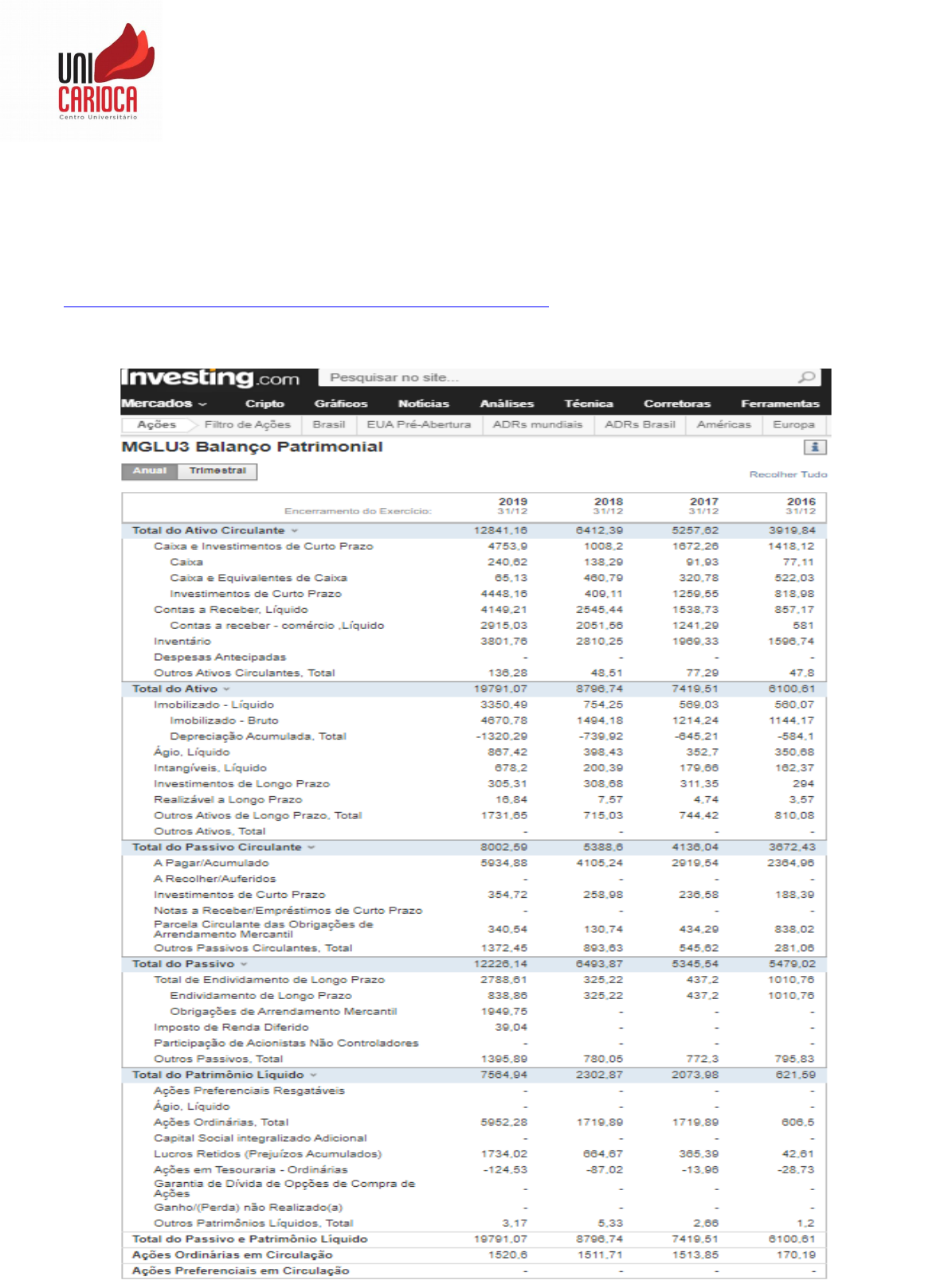 Centro Universitário UniCarioca Nome do Aluno: Matheus Gomes de Moura Matrícula: 2014103270 Professor: Vinicius Batista dos Santos Turma: 263 TABALHO AV1 GESTÃO FINANCEIRA E ORÇAMENTARIA I Em pesquisa ao site investing.com, optei por fazer o trabalho utilizando o balanço patrimonial e o demonstrativo de resultados da empresa Magazine Luiza SA (MGLU3) -https://br.investing.com/equities/magaz-luiza-on-nm-balance-sheet Projeção do Balanço Patrimonial, supondo aumento de 15,5% das vendas: Ativo Circulante Passivo Circulante Caixa e Investimentos de Curto Prazo 4801,30 A Pagar/Acumulado 6854,79 Caixa 277,92 Investimentos de Curto Prazo 354,72 Caixa e Equivalentes de Caixa 75,23 Parcela Circulante das Obrigações de Arrendamento Mercantil 340,54 Investimentos de Curto Prazo 4448,16 Outros Passivos Circulantes, Total 1372,45 Contas a Receber, Líquido 4792,34 Passivo não circulante Contas a receber - comércio ,Líquido 3366,86 Total de Endividamento de Longo Prazo 3148,50 Inventário 4391,03 Endividamento de Longo Prazo 838,86 Despesas Antecipadas - Obrigações de Arrendamento Mercantil 1949,75 Outros Ativos Circulantes, Total 136,28 Imposto de Renda Diferido 39,04 Total do ativo circulante 14120,95 Outros Passivos, Total 1395,89 Ativo Não Circulante Total do Passivo Circulante e não Circulante 13505,93 Imobilizado - Líquido 3350,49 Total do Patrimônio Líquido 7564,94 Imobilizado - Bruto 4670,78 Ações Ordinárias, Total 5952,28 Depreciação Acumulada, Total -1320,29 Lucros Retidos (Prejuízos Acumulados) 1734,02 Ágio, Líquido - Ações em Tesouraria - Ordinárias -124,53 Intangíveis, Líquido 1545,63 Outros Patrimônios Líquidos, Total 3,17 Investimentos de Longo Prazo 305,31 Total do Passivo 21070,87 Realizável a Longo Prazo 16,84 Outros Ativos de Longo Prazo, Total 1731,65 Total do ativo não circulante 6949,92 Total do Ativo 21070,87 Projeção do demonstrativo de resultados, supondo aumento de 15,5% das vendas: Projeção DRE Receita 22968,69 Custos de Receita 16553,86 Lucro Bruto 6414,824 Despesas Operacionais 4.926,53 lucro operacional 1.488,30 lucro antes do IR 1.488,30 Provisão para Imposto de Renda (30%) 446,49 Lucro Líquido depois do IR 1.041,81 Número Médio Ponderado de Ações - Diluído 1639,43 lucro diluído por ação 0,64 Dividendos (0,16 por ação) 262,3 lucro liquido 779,51 Podemos classificar um orçamento como o feito acima, em que nos baseamos em premissas anteriores, como orçamento incremental. image1.jpg image2.png