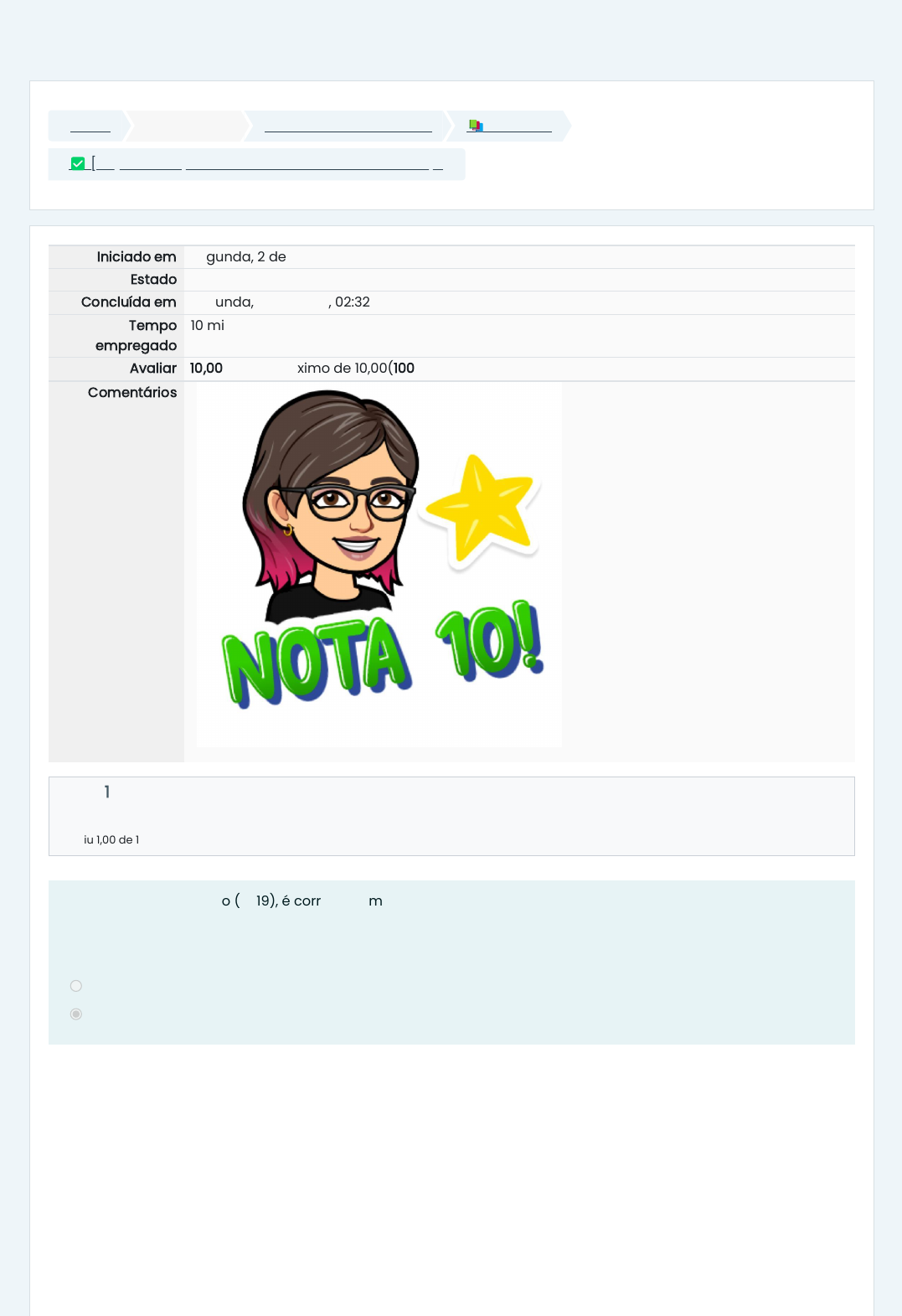 Painel Meus cursos 32010001998-T01-2024-2 📚 Módulo 4 ✅ [A4] – Avaliação do Módulo 4 – Frontend Javascript Iniciado em segunda, 2 dez 2024, 02:22 Estado Finalizada Concluída em segunda, 2 dez 2024, 02:32 Tempo empregado 10 minutos 35 segundos Avaliar 10,00 de um máximo de 10,00(100%) Comentários Questão 1 Correto Atingiu 1,00 de 1,00 De acordo com Marinho (2019), é correto afirmar que um framework é um modelo específico de classes e objetos e suas relações? Escolha uma opção: Verdadeiro Falso https://ava.ufms.br/my/ https://ava.ufms.br/course/view.php?id=60736 https://ava.ufms.br/course/view.php?id=60736#section-5 https://ava.ufms.br/mod/quiz/view.php?id=849827 Questão 2 Correto Atingiu 1,00 de 1,00 Questão 3 Correto Atingiu 1,00 de 1,00 Questão 4 Correto Atingiu 1,00 de 1,00 De acordo com Miletto (2014), a seguinte expressão regular é usada para mascarar qual informação? a. E-mail b. CPF c. Telefone d. CEP e. CNPJ De acordo com Marinho (2019), qual foi o primeiro framework de sucesso criado para web? a. Vue.JS b. Struts c. Titan d. Node e. Bootstrap De acordo com Marinho (2019), o jQuery é baseado em qual linguagem? a. PHP b. TypeScript c. JavaScript d. HTML e. Java Questão 5 Correto Atingiu 1,00 de 1,00 Questão 6 Correto Atingiu 1,00 de 1,00 Questão 7 Correto Atingiu 1,00 de 1,00 De acordo com Miletto (2014), qual propriedade representa quando um campo de um formulário perde o foco? a. onLoad b. onBlur c. onChange d. onFocus e. onError De acordo com Marinho (2019), é correto afirmar que o uso de frameworks web pode diminuir o tempo de produção de uma aplicação? Escolha uma opção: Verdadeiro Falso Segundo Marinho (2019), não é recomendável a separação dos códigos HTML dos do JavaScript, essa afirmação é? Escolha uma opção: Verdadeiro Falso Questão 8 Correto Atingiu 1,00 de 1,00 Questão 9 Correto Atingiu 1,00 de 1,00 De acordo com Miletto (2014), qual tipo de janela de diálogo do JavaScript apresenta a janela mostrada na imagem abaixo? a. document.write b. imagem.src c. alert d. confirm e. prompt De acordo com Marinho (2019), é correto afirmar que o trecho do código abaixo faz o link para uso do jQuery? Escolha uma opção: Verdadeiro Falso https://ajax.googleapis.com/ajax/libs/jquery/3.6.1/jquery.min.js Questão 10 Correto Atingiu 1,00 de 1,00 De acordo com Miletto (2014), qual tipo de janela de diálogo do JavaScript apresenta a janela mostrada na imagem abaixo? a. confirm b. imagem.src c. alert d. document.write e. prompt Atividade anterior ◄ 📍 [Checkout de Presença] Módulo 4 – Frontend Javascript Seguir para... Próxima atividade ✅ [PO] Prova Optativa ► Manter contato Suporte Técnico ao Usuário https://suporteagetic.ufms.br (67) 3345-7613 suporte.agead@ufms.br https://ava.ufms.br/mod/assign/view.php?id=849825&forceview=1 https://ava.ufms.br/mod/quiz/view.php?id=849828&forceview=1 https://suporteagetic.ufms.br/ tel:(67) 3345-7613 mailto:suporte.agead@ufms.br https://api.whatsapp.com/send?phone=556733457613