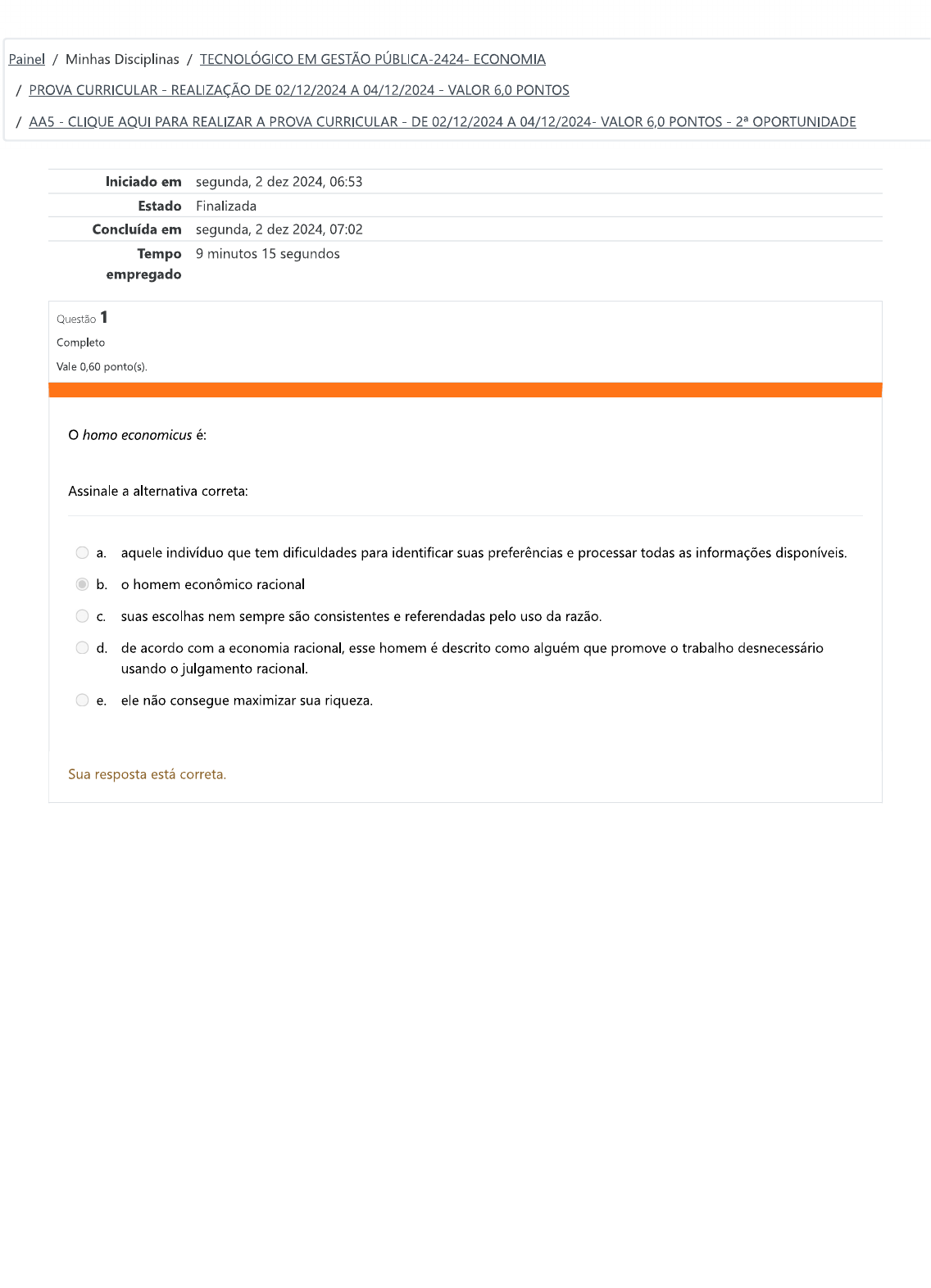 Painel / Minhas Disciplinas / TECNOLÓGICO EM GESTÃO PÚBLICA-2424- ECONOMIA / PROVA CURRICULAR - REALIZAÇÃO DE 02/12/2024 A 04/12/2024 - VALOR 6,0 PONTOS / AA5 CLIQUE AQUI PARA REALIZAR A PROVA CURRICULAR DE 02/12/2024 A 04/12/2024- VALOR 6,0 PONTOS - OPORTUNIDADE Iniciado em segunda, 2 dez 2024, 06:53 Estado Finalizada Concluída em segunda, 2 dez 2024, 07:02 Tempo 9 minutos 15 segundos empregado Questão 1 Completo Vale 0,60 homo economicus é: Assinale a alternativa correta: a. aquele indivíduo que tem dificuldades para identificar suas preferências e processar todas as informações disponíveis. b. o homem econômico racional C. suas escolhas nem sempre são consistentes e referendadas pelo uso da razão. d. de acordo com a economia racional, esse homem é descrito como alguém que promove o trabalho desnecessário usando o julgamento racional. e. ele não consegue maximizar sua riqueza. Sua resposta está correta.Questão 2 Completo Vale 0,60 ponto(s). Na antiguidade grega, por exemplo, apareceram apenas algumas ideias econômicas fragmentárias em estudos filosóficos e políticos, mas sem o brilho dos trabalhos nos campos da filosofia, ética, política, mecânica ou geometria. Sendo possível identificar tais correlações, por exemplo, conforme observados em Aristóteles, Platão e Xenofonte: I. Aristóteles (384-322 a.C.), em seus estudos sobre aspectos de administração privada e sobre finanças públicas. II. Também encontramos algumas considerações de ordem econômica nos escritos de Platão (427-347 a.C.) e, III. Xenofonte (440-335 a.C.), sendo que este último aparentemente cunhou o termo economia (oikonomia), no sentido de gestão de bens privados" (princípios de administração da casa / administração da coisa pública) Está correto apenas o que se afirma em: a. I. b. I, II e III. C. II. d. e III. e. III. Sua resposta está correta.Questão 3 Completo Vale 0,60 ponto(s). Se os recursos não fossem escassos, não haveria ciências econômica. Mas o que é escassez? Qual o sentido da escassez na economia? Escassez é uma situação em que os recursos são limitados e podem ser utilizados de diferentes maneiras, de tal modo que devemos sacrificar uma coisa por outra. A escassez está relacionada ao tempo, dinheiro, espaço, matéria-prima, empregos, etc., Ou seja, recursos limitados e necessidades ilimitadas! A partir do problema da escassez, qualquer economia procura responder às seguintes perguntas: - que e quanto produzir? Como produzir? Para quem produzir? Dessa forma, julgue as afirmativas abaixo considerando (V) verdadeiro ou (F) falso. o QUE E QUANTO PRODUZIR: A sociedade deve decidir se produz mais bens de consumo ou bens de capital, ou, como num exemplo clássico: quer produzir mais canhões ou mais manteiga? Em que quantidade? Os recursos devem ser dirigidos para a produção de mais bens de consumo, ou bens de capital? COMO PRODUZIR: Trata-se de uma questão de eficiência produtiva: serão utilizados métodos de produção capital- intensivos? Ou mão de obra-intensivos? Ou terra-intensivos? Essa decisão depende da disponibilidade de recursos de cada país. PARA QUEM PRODUZIR: A sociedade deve decidir quais os setores que serão beneficiados na distribuição do produto: trabalhadores, capitalistas ou proprietários da terra? Agricultura ou indústria? Mercado interno ou mercado externo? Região Sul ou Norte? Ou seja, trata-se de decidir como será distribuída a renda gerada pela atividade econômica. a. F, F, F. b. F, V, F. C. V, V, V. d. F, F, V. e. V, F, V. Sua resposta está correta.Questão 4 Completo Vale 0,60 ponto(s). Para os fisiocratas: Assinale a alternativa correta: a. A agricultura era desencorajada, pois a terra por si só não tinha capacidade de multiplicar riqueza. b. A Fisiocracia impôs-se principalmente como doutrina da ordem industrial, onde a transformação é o principal motor impulsionador da economia. Os fisiocratas, consideravam que toda a vida permanece na dependência da tecnologia e a capacidade do homem de inovar o meio empresarial. d. A riqueza consistia em bens produzidos com a ajuda da natureza em atividades econômicas como lavoura, pesca e mineração. e. Existia a exigência que as pessoas empenhadas no comércio, na indústria e nas finanças fossem multiplicadas ao maior número possível Sua resposta está correta. Questão 5 Completo Vale 0,60 ponto(s). É o primeiro objetivo da gestão macroeconômica, objetivando-se com isso atender às aspirações crescentes da população e estender os benefícios da prosperidade econômica a todas as camadas sociais. Promover o crescimento do produto a taxas acima do crescimento demográfico, expandindo-se assim a produção per capita de bens e serviços finais. Assinale a alternativa correta: a. Alto nível de emprego. b. Crescimento econômico. C. Estabilidade de preços. d. Produto agregado. e. Transações externas. Sua resposta está correta.Questão 6 Completo Vale 0,60 ponto(s). Este setor se diferencia dos outros, pelo fato de seu produto não ser tangível, concreto, embora seja de grande importância no sistema econômico. É composto pelas unidades produtoras que prestam serviços, como as instituições financeiras, escolas, hospitais, transportes, comércio, etc. a. Setor secundário. b. Setor primário. C. Setor terciário. d. Setor agrícola. e. Setor Financeiro. Sua resposta está correta. Questão 7 Completo Vale 0,60 ponto(s). Sobre elasticidade-preço demanda, assinale a única opção correta: a. Quanto maior o preço, maior a quantidade que o empresário estará disposto a ofertar, coeteris paribus. b. resultado da elasticidade será positivo, pois, a correlação entre preço e quantidade ofertada é direta. C. Oferta mede o quanto a quantidade ofertada responde a mudanças no preço. d. Sua função é avaliar a reação da quantidade da demanda de um bem ou serviço em relação às variações em seu preço. Essa é a visão do quando cons