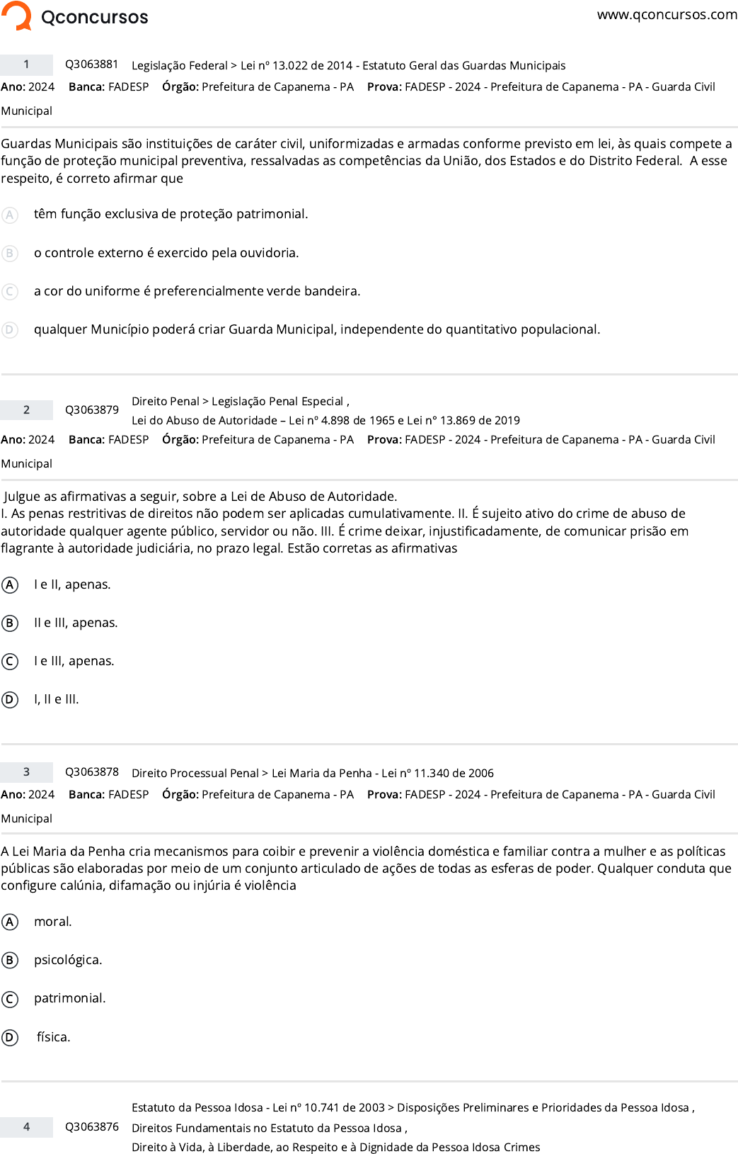 www.qconcursos.com Ano: 2024 Banca: FADESP Órgão: Prefeitura de Capanema - PA Guardas Municipais são instituições de caráter civil, uniformizadas e armadas conforme previsto em lei, às quais compete a função de proteção municipal preventiva, ressalvadas as competências da União, dos Estados e do Distrito Federal. A esse respeito, é correto a�rmar que A têm função exclusiva de proteção patrimonial. B o controle externo é exercido pela ouvidoria. C a cor do uniforme é preferencialmente verde bandeira. D qualquer Município poderá criar Guarda Municipal, independente do quantitativo populacional. Ano: 2024 Banca: FADESP Órgão: Prefeitura de Capanema - PA Julgue as a�rmativas a seguir, sobre a Lei de Abuso de Autoridade. I. As penas restritivas de direitos não podem ser aplicadas cumulativamente. II. É sujeito ativo do crime de abuso de autoridade qualquer agente público, servidor ou não. III. É crime deixar, injusti�cadamente, de comunicar prisão em �agrante à autoridade judiciária, no prazo legal. Estão corretas as a�rmativas A I e II, apenas. B II e III, apenas. C I e III, apenas. D I, II e III. Ano: 2024 Banca: FADESP Órgão: Prefeitura de Capanema - PA A Lei Maria da Penha cria mecanismos para coibir e prevenir a violência doméstica e familiar contra a mulher e as políticas públicas são elaboradas por meio de um conjunto articulado de ações de todas as esferas de poder. Qualquer conduta que con�gure calúnia, difamação ou injúria é violência A moral. B psicológica. C patrimonial. D física. 1 Q3063881 >Legislação Federal Lei nº 13.022 de 2014 - Estatuto Geral das Guardas Municipais Prova: FADESP - 2024 - Prefeitura de Capanema - PA - Guarda Civil Municipal 2 Q3063879 >Direito Penal Legislação Penal Especial , Lei do Abuso de Autoridade – Lei nº 4.898 de 1965 e Lei n° 13.869 de 2019 Prova: FADESP - 2024 - Prefeitura de Capanema - PA - Guarda Civil Municipal 3 Q3063878 >Direito Processual Penal Lei Maria da Penha - Lei nº 11.340 de 2006 Prova: FADESP - 2024 - Prefeitura de Capanema - PA - Guarda Civil Municipal 4 Q3063876 >Estatuto da Pessoa Idosa - Lei nº 10.741 de 2003 Disposições Preliminares e Prioridades da Pessoa Idosa , Direitos Fundamentais no Estatuto da Pessoa Idosa , Direito à Vida, à Liberdade, ao Respeito e à Dignidade da Pessoa Idosa Crimes https://www.qconcursos.com/ https://www.qconcursos.com/questoes-de-concursos/bancas/fadesp https://www.qconcursos.com/questoes-de-concursos/institutos/prefeitura-de-capanema-pa https://www.qconcursos.com/questoes-de-concursos/bancas/fadesp https://www.qconcursos.com/questoes-de-concursos/institutos/prefeitura-de-capanema-pa https://www.qconcursos.com/questoes-de-concursos/bancas/fadesp https://www.qconcursos.com/questoes-de-concursos/institutos/prefeitura-de-capanema-pa https://www.qconcursos.com/questoes-de-concursos/questoes/9f553166-9b https://www.qconcursos.com/questoes-de-concursos/disciplinas/direito-legislacao-federal https://www.qconcursos.com/questoes-de-concursos/disciplinas/direito-legislacao-federal/lei-n-13-022-de-2014-estatuto-geral-das-guardas-municipais https://www.qconcursos.com/questoes-de-concursos/provas/fadesp-2024-prefeitura-de-capanema-pa-guarda-civil-municipal https://www.qconcursos.com/questoes-de-concursos/provas/fadesp-2024-prefeitura-de-capanema-pa-guarda-civil-municipal https://www.qconcursos.com/questoes-de-concursos/questoes/9f50b079-9b https://www.qconcursos.com/questoes-de-concursos/disciplinas/direito-direito-penal https://www.qconcursos.com/questoes-de-concursos/disciplinas/direito-direito-penal/legislacao-penal-especial https://www.qconcursos.com/questoes-de-concursos/disciplinas/direito-direito-penal/lei-do-abuso-de-autoridade-lei-n-4-898-de-1965-e-lei-n-13-869-de-2019 https://www.qconcursos.com/questoes-de-concursos/provas/fadesp-2024-prefeitura-de-capanema-pa-guarda-civil-municipal https://www.qconcursos.com/questoes-de-concursos/provas/fadesp-2024-prefeitura-de-capanema-pa-guarda-civil-municipal https://www.qconcursos.com/questoes-de-concursos/questoes/9f4db42c-9b https://www.qconcursos.com/questoes-de-concursos/disciplinas/direito-direito-processual-penal https://www.qconcursos.com/questoes-de-concursos/disciplinas/direito-direito-processual-penal/lei-maria-da-penha-lei-n-11-340-de-2006 https://www.qconcursos.com/questoes-de-concursos/provas/fadesp-2024-prefeitura-de-capanema-pa-guarda-civil-municipal https://www.qconcursos.com/questoes-de-concursos/provas/fadesp-2024-prefeitura-de-capanema-pa-guarda-civil-municipal https://www.qconcursos.com/questoes-de-concursos/questoes/9f442ad2-9b https://www.qconcursos.com/questoes-de-concursos/disciplinas/direito-estatuto-da-pessoa-idosa-lei-n-10-741-de-2003 https://www.qconcursos.com/questoes-de-concursos/disciplinas/direito-estatuto-da-pessoa-idosa-lei-n-10-741-de-2003/disposicoes-preliminares-e-prioridades-da-pessoa-idosa https://www.qconcursos.com/questoes-de-concursos/disciplinas/direito-estatuto-da-pessoa-idosa-lei-n-10-741-de-2003/direitos-fundamentais-no-estatuto-da-pessoa-idosa https://www.qconcursos.com/questoes-de-concursos/disciplinas/direito-estatuto-da-pessoa-idosa-lei-n-10-741-de-2003/direito-a-vida-a-liberdade-ao-respeito-e-a-dignidade-da-pessoa-idosa https://www.qconcursos.com/questoes-de-concursos/disciplinas/direito-estatuto-da-pessoa-idosa-lei-n-10-741-de-2003/crimes Ano: 2024 Banca: FADESP Órgão: Prefeitura de Capanema - PA Sobre o Estatuto da Pessoa Idosa, é correto a�rmar que A o direito à liberdade de crença e prática de esportes não se aplica para pessoas com mais de 80 anos. B a garantia de prioridade de atendimento preferencial é inválida junto aos órgãos privados prestadores de serviços à população. C negar a alguém, por motivo de idade, emprego ou trabalho constitui crime punível com reclusão de um a quatro anos. D garante a prioridade no recebimento da restituição do Imposto de Renda, Ano: 2024 Banca: FADESP Órgão: Prefeitura de Cap