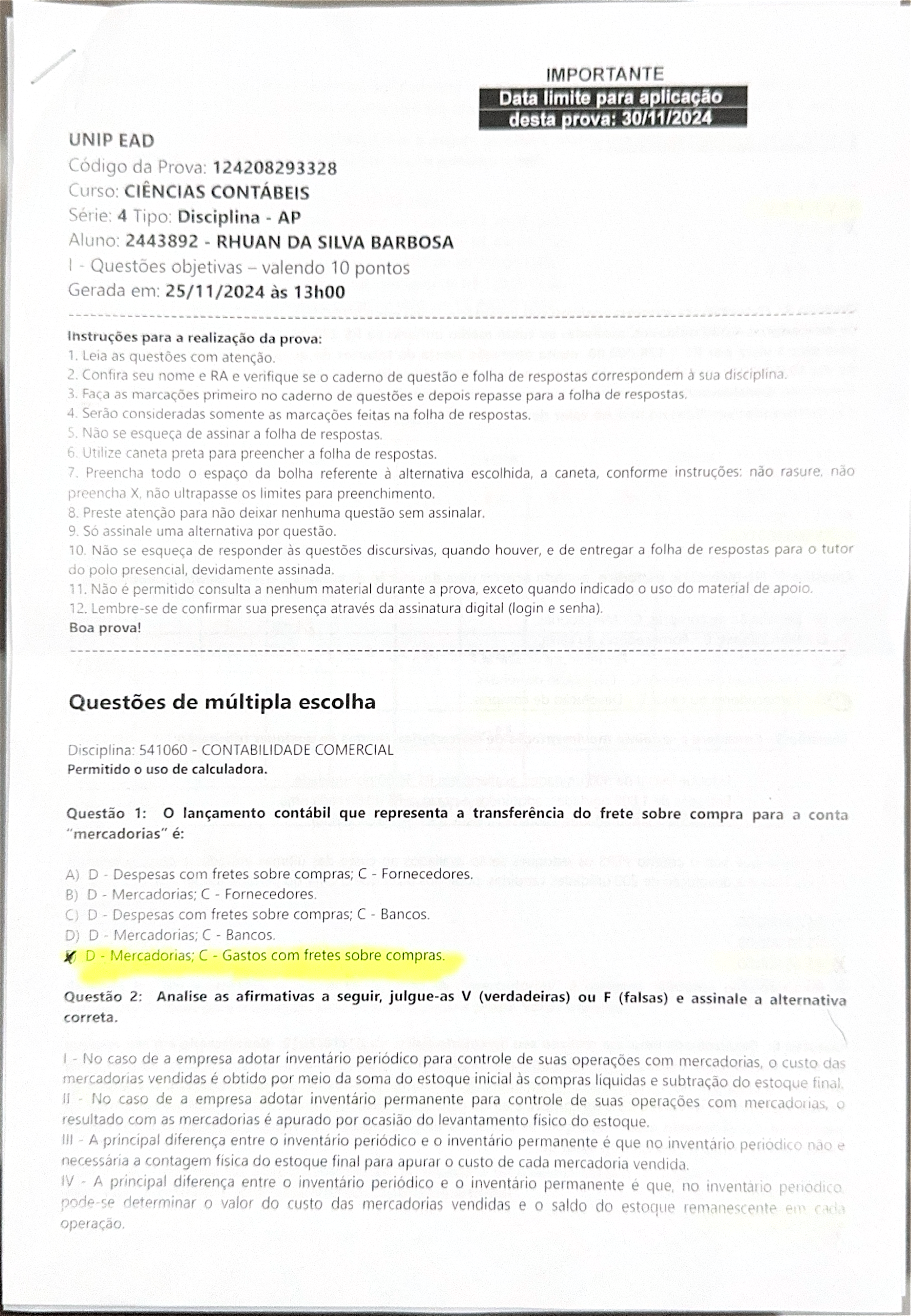 IMPORTANTE Data limite para aplicação desta prova: 30/11/2024 UNIP EAD Código da Prova: 124208293328 Curso: CIÊNCIAS CONTÁBEIS Série: 4 Tipo: Disciplina AP Aluno: 2443892 RHUAN DA SILVA BARBOSA Questões objetivas valendo 10 pontos Gerada em: 25/11/2024 às 13h00 Instruções para a realização da prova: 1. Leia as questões com atenção. 2. Confira seu nome e RA e verifique se caderno de questão e folha de respostas correspondem à sua disciplina. 3. as marcações primeiro no caderno de questões e depois repasse para a folha de respostas. 4. Serão consideradas somente as marcações feitas na folha de respostas. 5. Não se esqueça de assinar a folha de respostas. 6. Utilize caneta preta para preencher a folha de respostas. 7. Preencha todo o espaço da bolha referente à alternativa escolhida, a caneta, conforme instruções: não não preencha não ultrapasse os limites para preenchimento. 8. Preste atenção para não deixar nenhuma questão sem 9. Só assinale uma alternativa por questão. 10. Não se esqueça de responder às questões discursivas, quando houver, e de entregar a folha de respostas para tutor do polo presencial, devidamente 11. Não é permitido consulta a nenhum material durante a prova, exceto quando indicado o uso do material de apoio. 12. Lembre-se de confirmar sua presença através da assinatura digital (login e senha). Boa prova! Questões de múltipla escolha Disciplina: 541060 CONTABILIDADE COMERCIAL Permitido o uso de calculadora. Questão 1: o lançamento contábil que representa a transferência do frete sobre compra para a conta "mercadorias" é: A) D Despesas com fretes sobre compras; C Fornecedores. B) D C Fornecedores. C) D Despesas com fretes sobre compras; C Bancos. D) D Mercadorias; C Bancos. D Mercadorias; C Gastos com fretes sobre compras. Questão 2: Analise as afirmativas a seguir, julgue-as V (verdadeiras) ou F (falsas) e assinale a alternativa correta. - No caso de a empresa adotar inventário periódico para controle de suas operações com mercadorias, o custo das mercadorias vendidas é obtido por meio da soma do estoque inicial às compras líquidas e subtração do estoque final No caso de a empresa adotar inventário permanente para controle de suas operações com mercadorias, resultado com as mercadorias é apurado por ocasião do levantamento físico do estoque. III - A principal diferença entre inventário periódico e o inventário permanente é que no inventário não e necessária a contagem física do estoque final para apurar custo de cada mercadoria vendida. IV A principal diferença entre inventário periódico e o inventário permanente é que, no inventário periodico pode-se determinar valor do custo das mercadorias vendidas e o saldo do estoque remanescente em cada operação.V A principal diferença entre inventário periódico e inventário permanente é que, no inventário utilizam-se fichas de controle de estoque para apurar o custo das mercadorias vendidas. A sequência correta das afirmativas é: A) V. B) V, F, V. V, F, V, V. D) V. F, V. E) F. Questão 3: Determinada empresa realizou seu inventário físico em 01/10/2019, identificando em seu estoque de mercadorias unidades, avaliadas ao custo médio unitário de R$ 220,00. Em 05/10/2019, vendeu 3.800 unidades à vista por R$ 1.178.000,00, numa operação isenta de tributos de qualquer natureza. comprador, no dia 10/10/2019, devolveu 20% da compra e ainda conseguiu obter um abatimento de 20% no valor total da devolução. Considerando essas transações como as únicas do mês de outubro, a empresa apresentou um custo das mercadorias vendidas no mês no valor de: A) R$ B) R$ 88.000,00. C) R$ E) Questão 4: No inventário quando ocorrer uma devolução de compras, o lançamento contábil será: A) D Devolução de compras; C B) D Mercadorias; C Fornecedores ou caixa. D Devolução de vendas; C - Fornecedores ou caixa. D) D Devolução de compras; C Devolução de vendas. D Fornecedores ou caixa; C Devolução de compras. Questão 5: Considere a seguinte movimentação de mercadorias, isentas de qualquer tributação: Estoque inicial de 300 unidades, avaliado em R$ 30,00 por unidade. Entradas de 1.800 unidades, adquiridas a prazo, a R$ 40,00 cada uma. Saídas de 1.900 unidades, vendidas à vista, a R$ 50,00 cada Sabendo-se que sob o critério PEPS os estoques serão avaliados ao custo das últimas entradas e que no referido período houve a devolução de 200 unidades vendidas, podemos dizer que o CMV do período foi de: A) R$ B) R$ R$ D) R$ E) R$ Questão 6: Determinada empresa realizou seu inventário físico em 01/10/2019, identificando em seu estoque de mercadorias 4.200 unidades avaliadas ao custo médio unitário de R$ 220,00. Em vendeu 3.800 unidades à vista por R$ 1.178.000,00, numa operação isenta de tributos de qualquer natureza. o no dia 10/10/2019, devolveu 20% da compra e ainda conseguiu obter um abatimento de 20% no valor total da devolução. Considerando essas transações as únicas do mês de outubro, a empresa apresentou um resultado bruto com mercadorias no mês no valor de: A) R$ B) R$ R$D) R$ E) R$ Questão 7: Com base nos dados apresentados a seguir, escolha a alternativa que apresenta valor total de vendas pelo método PEPS (primeiro a entrar será primeiro a sair): Estoque em 01/04/20x9 = 18 unidades a R$ 85,00 cada/ 05/04/20x9 = aquisição de 10 unidades a prazo no valor de R$ 98,00 10/04/20x9 = aquisição de 15 unidades a prazo no valor de R$ 104,00 15/04/20x9 = vendas de 12 unidades a prazo no valor de R$ 350,00 cada. 20/04/20x9 = aquisição de 8 unidades a prazo no valor de R$ 120,00 cada. 25/04/20x9 = vendas de 20 unidades a prazo no valor de R$ 430,00 cada. Segue a ficha de estoques: Método: PEPS Entradas Saídas Saldos Data Op. Qte. Qte. $ u Qte. $ u $ T 1 El 18 05/04 10 98RS 10104 12 20/04 8 25/04 20 Total de Compras Total do CMV Total Estoque Final A) R$ B) R$ C) R$ D) R$ Questão 8: No inventário permanente, a c